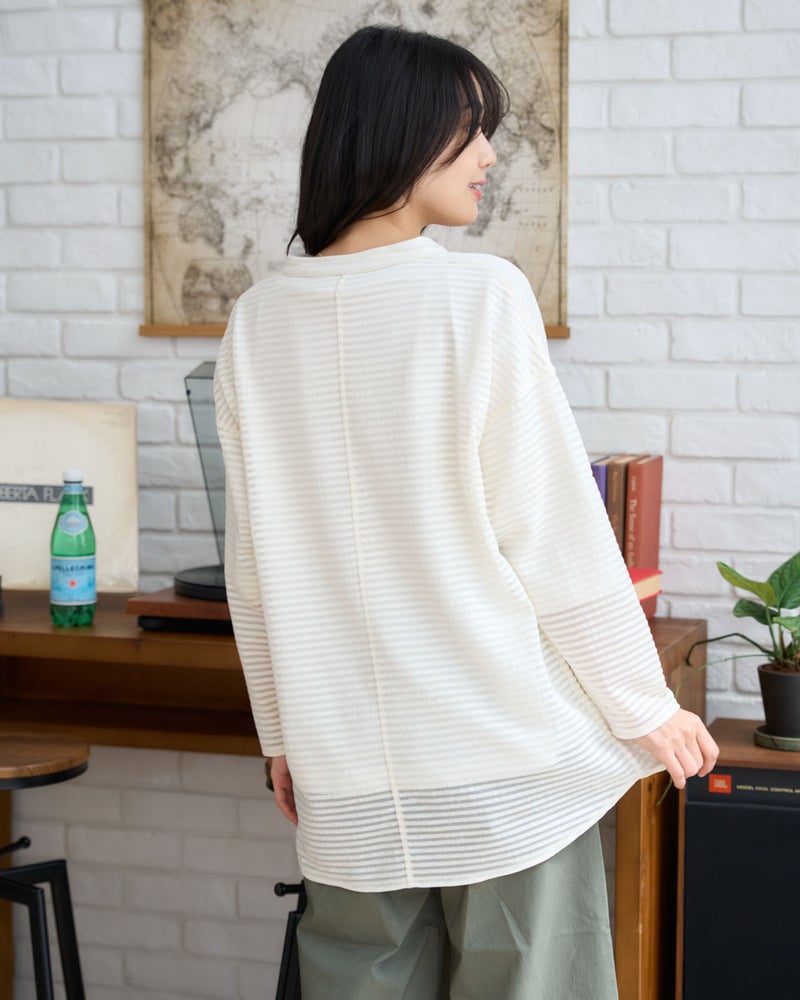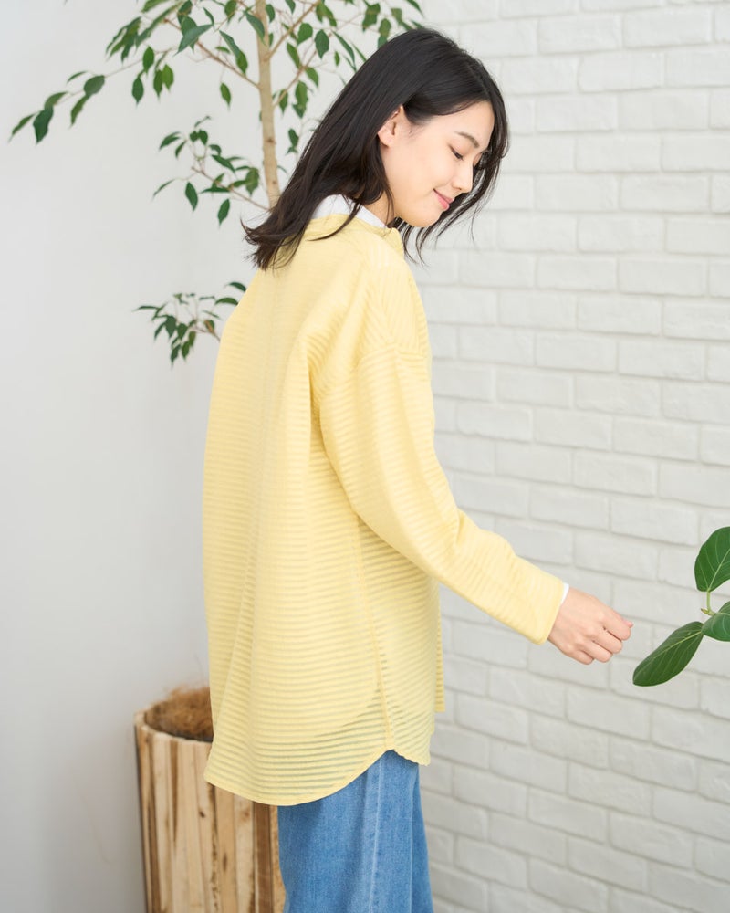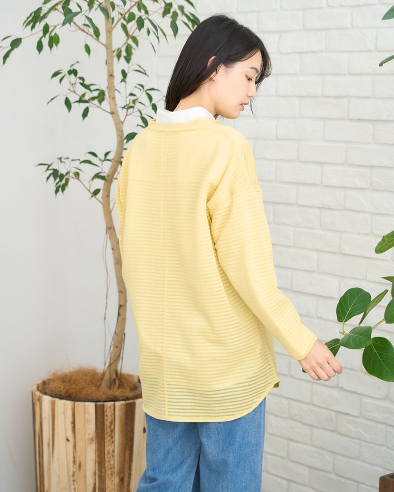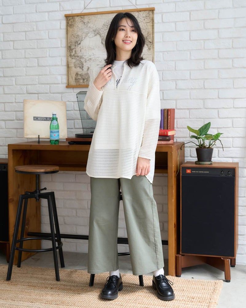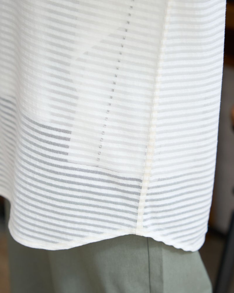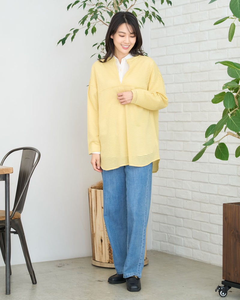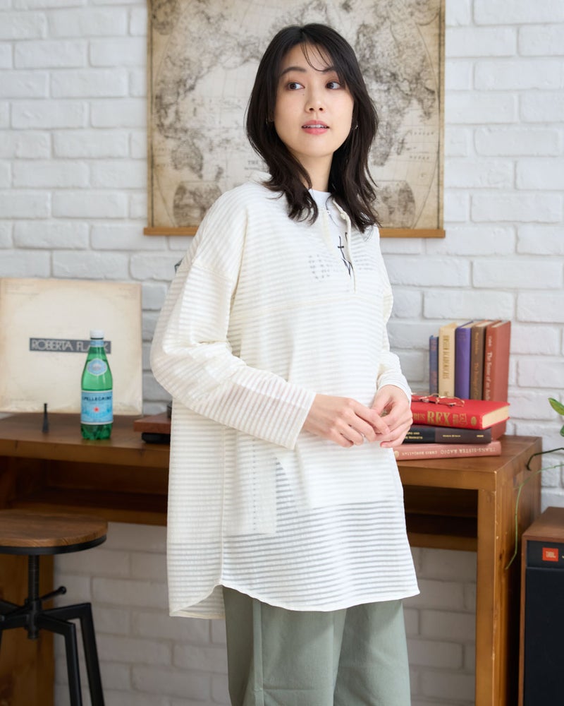 透け感のあるメッシュジャカード素材を使用したロングカットソー。軽やかな風合いで、重ね着スタイルを楽しめる一枚です。ニットのような表情がありながら、カットソー素材なのでお手入れも簡単。季節の変わり目に活躍する、上品ながら抜け感のあるアイテムです。 モデル身長: 166 cm 着用サイズ: M サイズ Golden Bear WOMEN カットソー (WOMEN) 【着用アイテム】467U3412 プリントBIGTシャツ 467U4330 フレンチリネンシャツ 467U4701 綿麻ストレートデニム 467U4730 超ストレッチ麻混ガウチョ