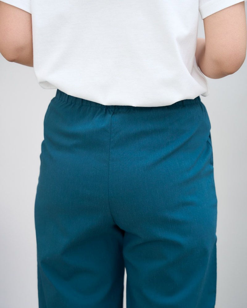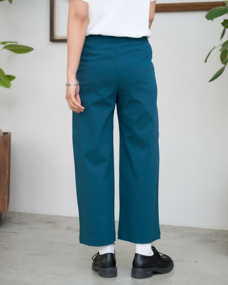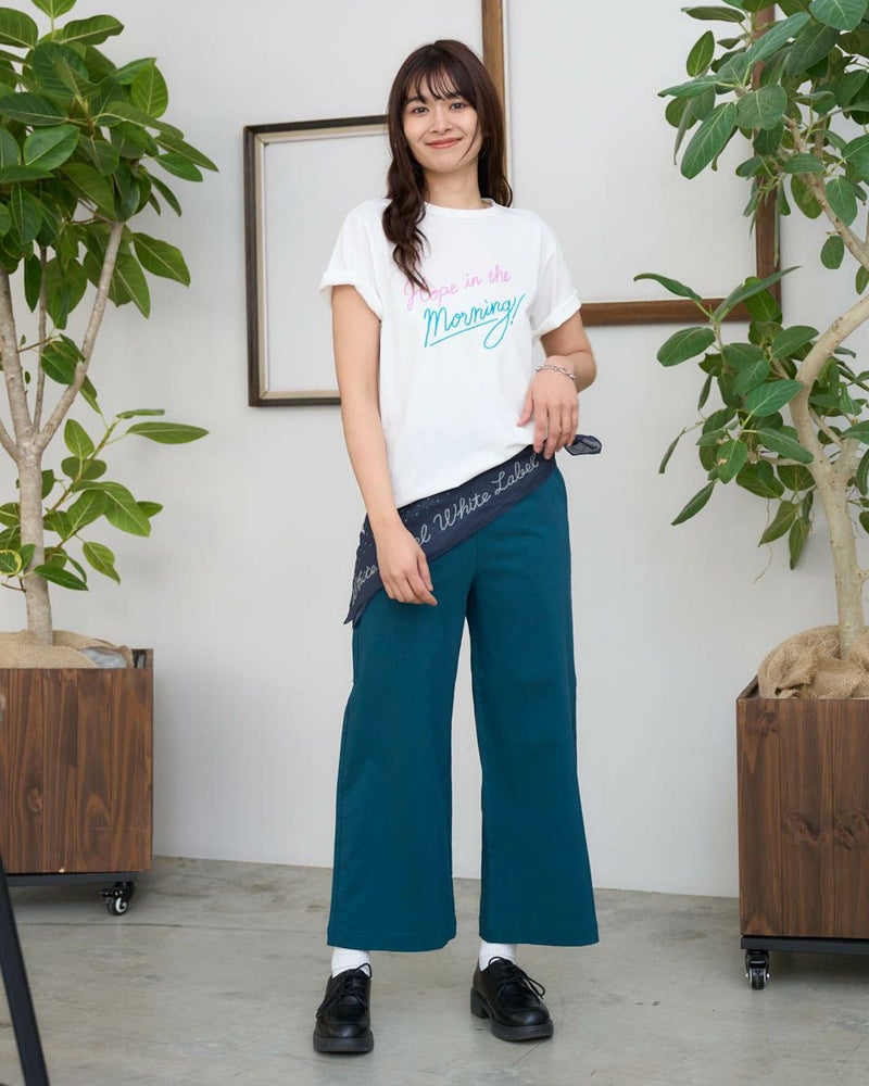 麻混で横方向に良く伸びるハイストレッチ素材を使用し、シルエットは軽快なアンクル丈のセミワイドパンツです。ウエストは開き無しの仕様で、表地の伸縮性を活かしてギャザーを抑えることで、すっきりとした見た目に仕上げています。 モデル身長: 168 cm 着用サイズ: S サイズ Golden Bear WOMEN ボトムス (WOMEN) 同デザイン大きい(3L,4Lサイズ)はこちら 【着用アイテム】467U3301 シャンブレーシャツ 467U3402 プリントTシャツ 467U3433 シルエットベア長袖Tシャツ