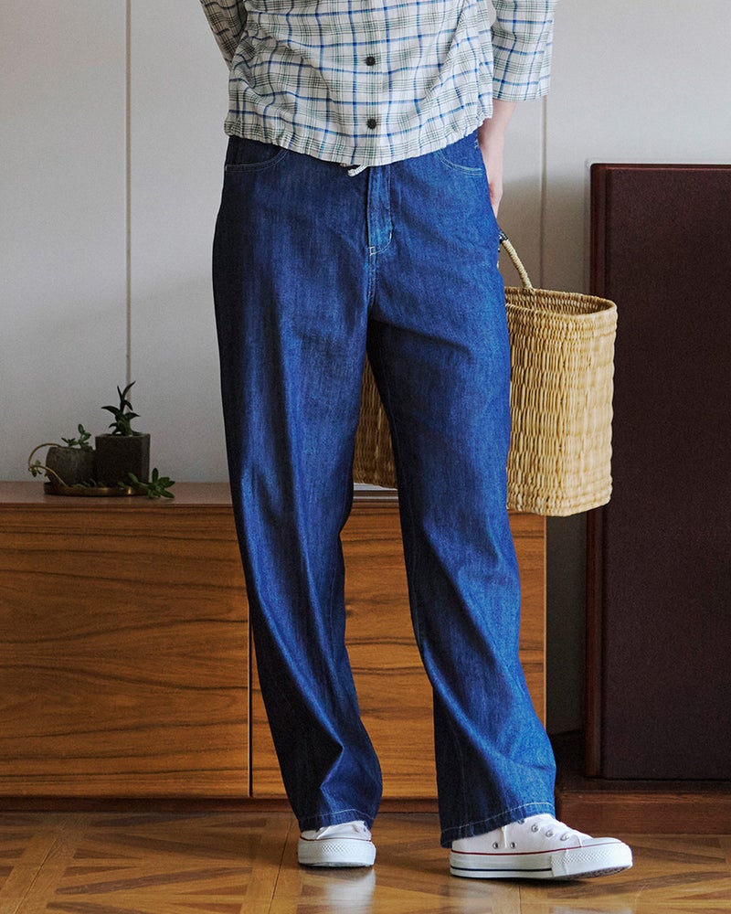 麻混のサラッとした清涼感が心地よい、夏を先取りする軽量デニムパンツ。一日中履いていても締め付け感のないストレスフリーなフィット感にこだわりました。程よいゆとりのストレートシルエットが、脚をスッキリ美しく見せてくれます。軽快な足取りで街歩きや旅行を楽しみたくなる一本です。