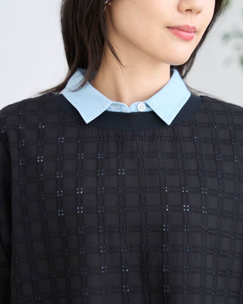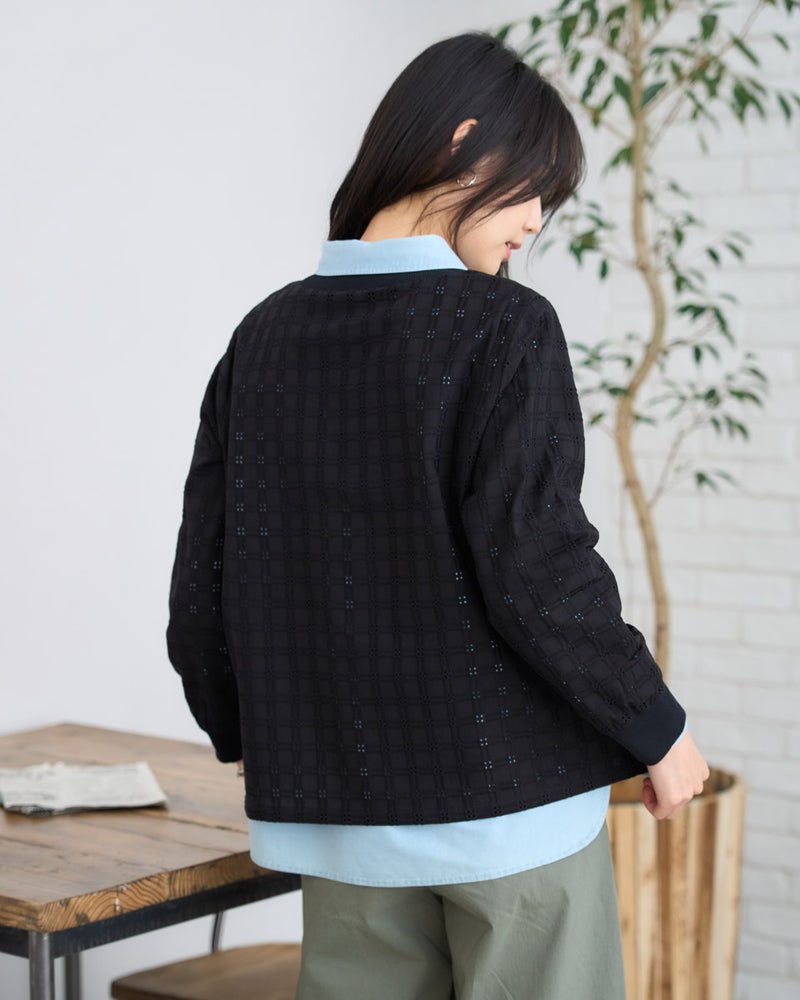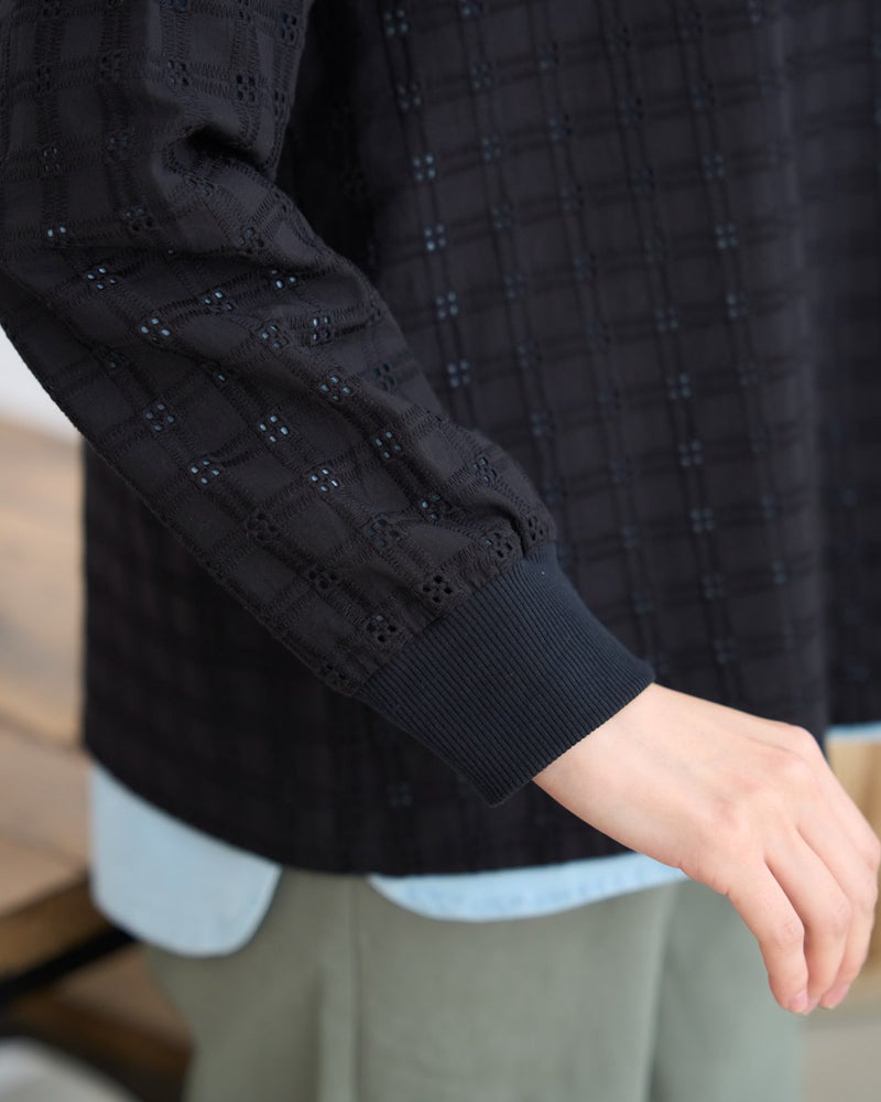 オーガニックコットンを使用したの格子柄レースを使用したブラウスで、襟ぐりと袖ぐりに別布リブを接ぐことでカットソーのような着心地を実現しています。布帛でありながらTシャツ感覚で楽に着用でき、きちんと感も兼ね備えた仕上がりです。 モデル身長: 166 cm 着用サイズ: M サイズ Golden Bear QUEEN SIZE(WOMEN 大きいサイズ ) ブラウス (WOMEN) 同デザイン通常サイズはこちら