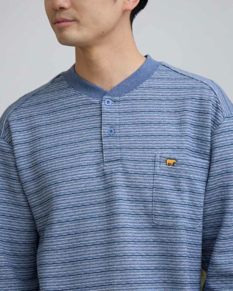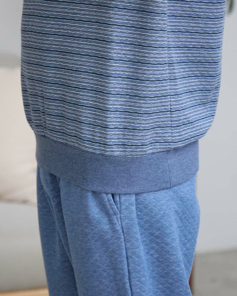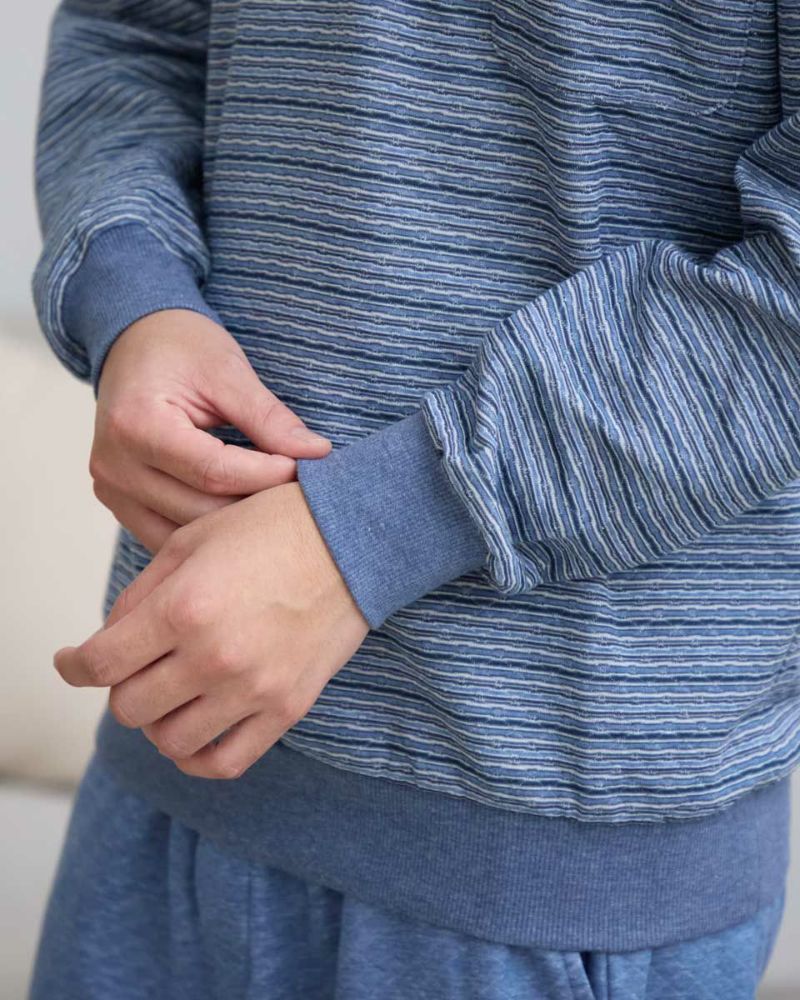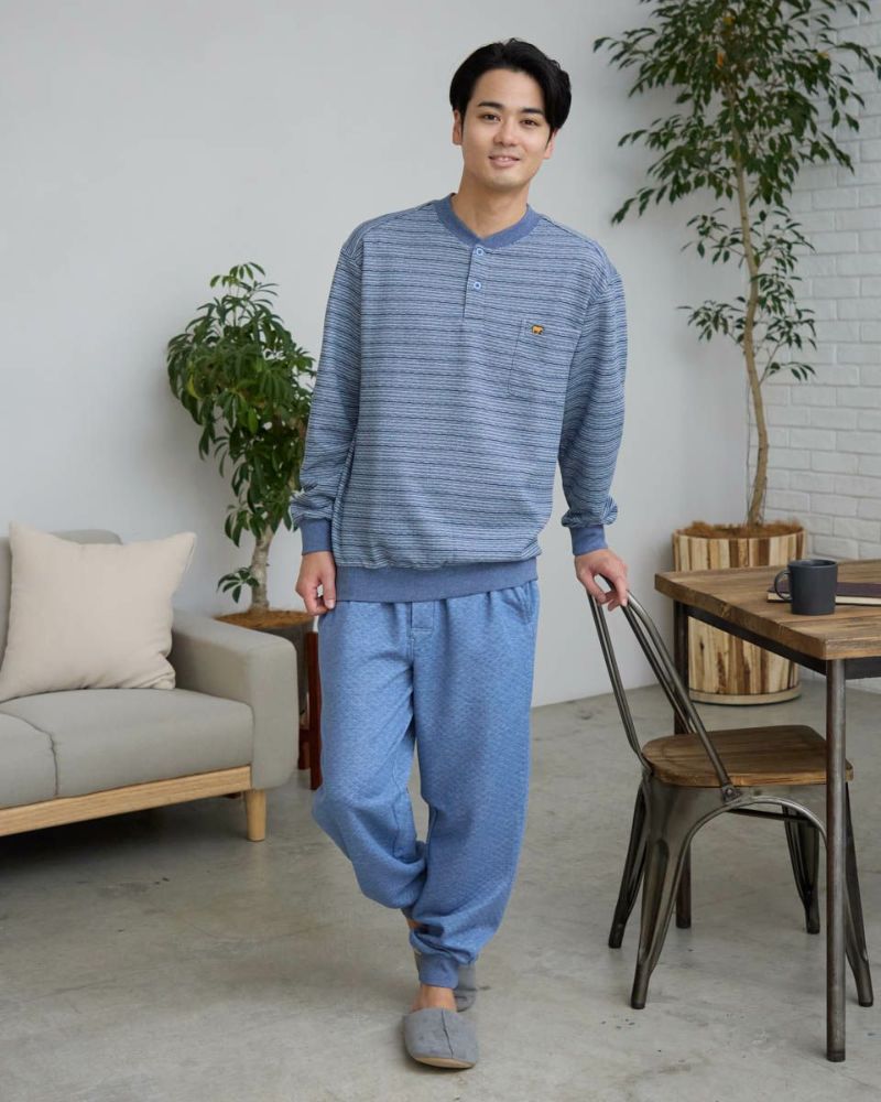 ボーダー柄の長袖・長ズボンのヘンリーネックパジャマです。暖かいキルト素材を使用しました。ゆったりとしたサイズ感で、着心地の良さがおすすめです。