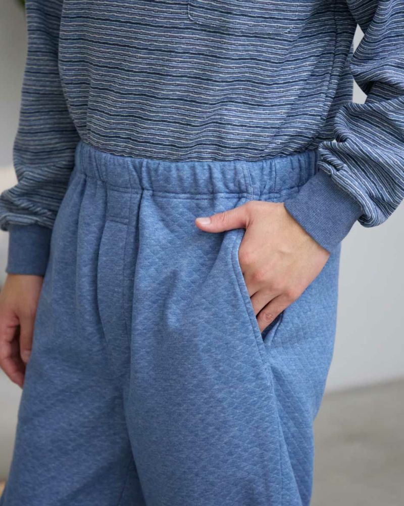また、ボトムスは前開き・サイドポケットをつけています。ホームウェアとしても使えるこだわりの仕様です。