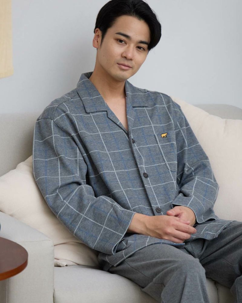 チェック柄の長袖・長ズボンのテーラードパジャマです。柔らかなジャガード素材を使用しました。ゆったりとしたサイズ感で、着心地の良さがおすすめです。
