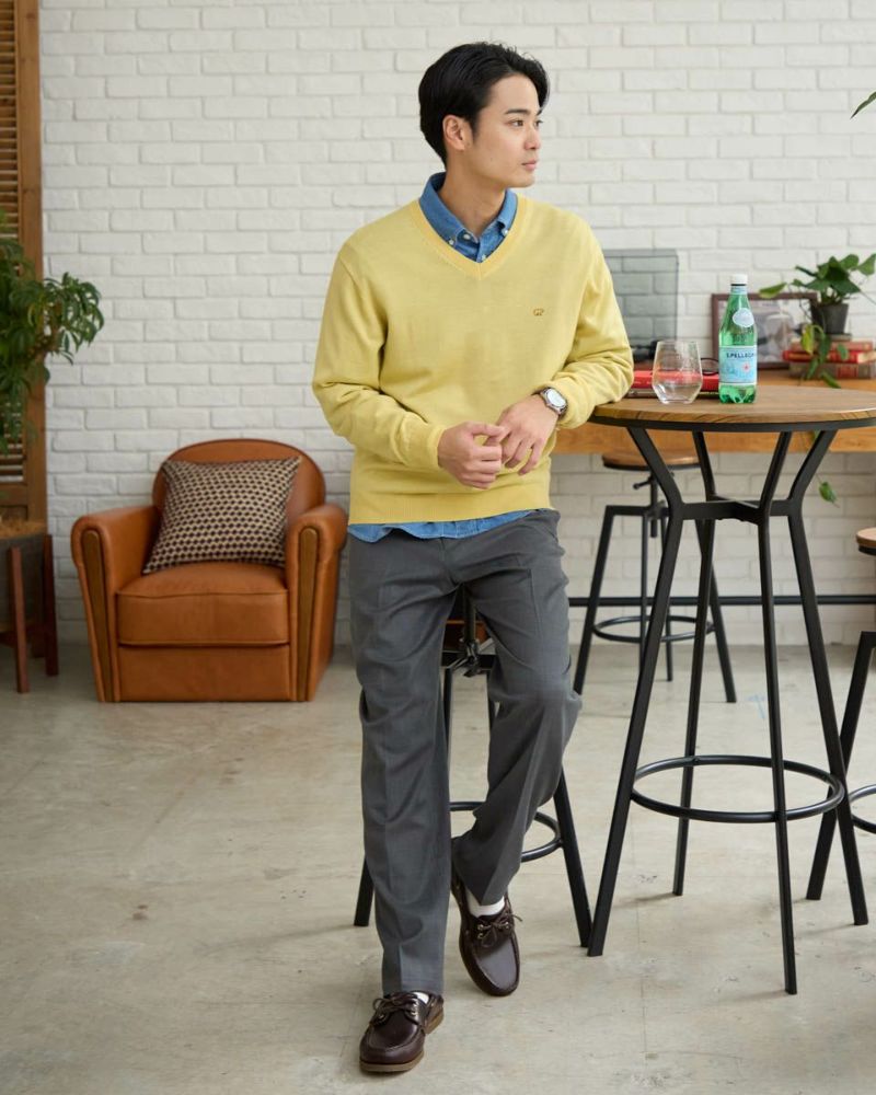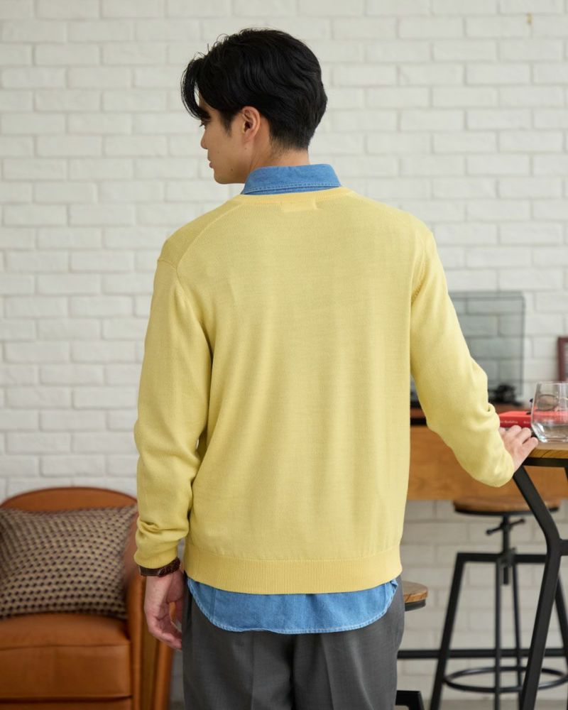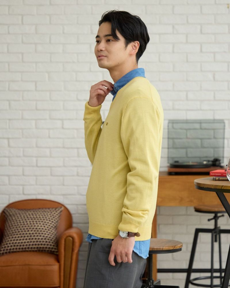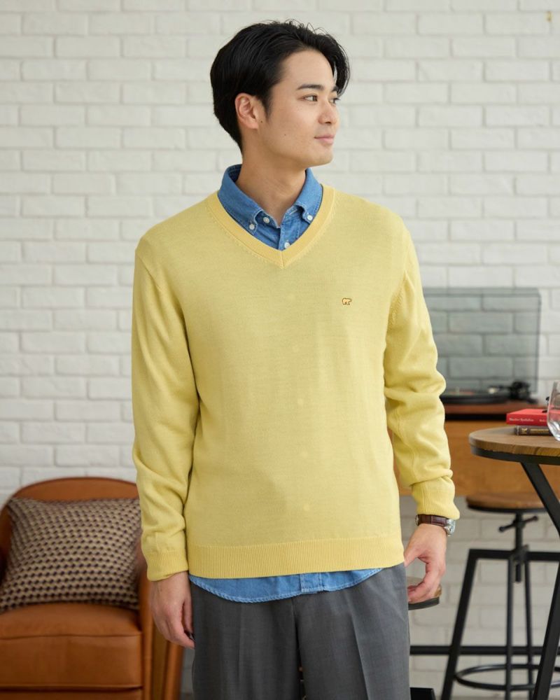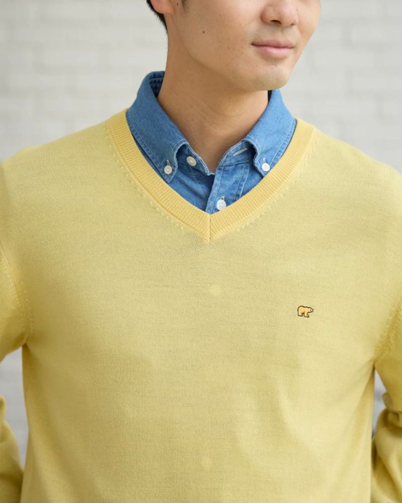 ベーシックなVネックニットです。メリノウール100%を使用した12G天竺の編地です。優れた保温性と肌触りが特徴です。繊維がとても細かいため、チクチクする不快感を感じにくいのも魅力です。お手入れが楽な家庭洗濯 (手洗い)が可能です。ベーシックカラーはこちら モデル身長: 176 cm 着用サイズ: L サイズ Golden Bear Men's ニット (Men's) 【着用アイテム】314RC231 デニムシャツ 317RC701 イージースラックス