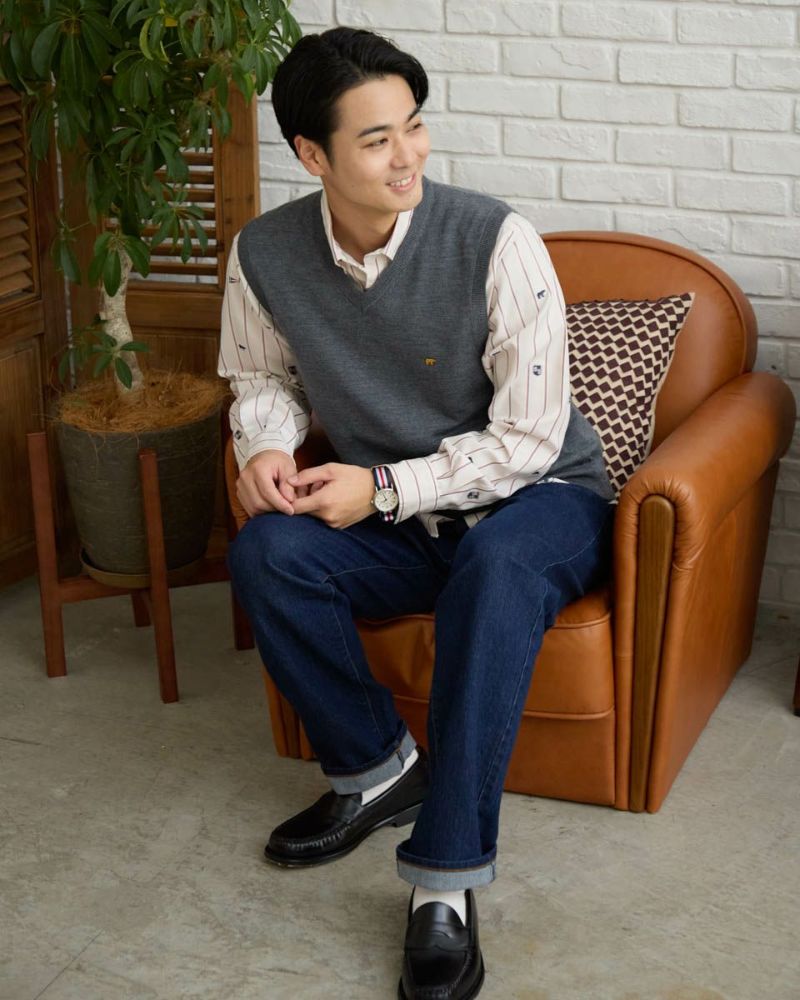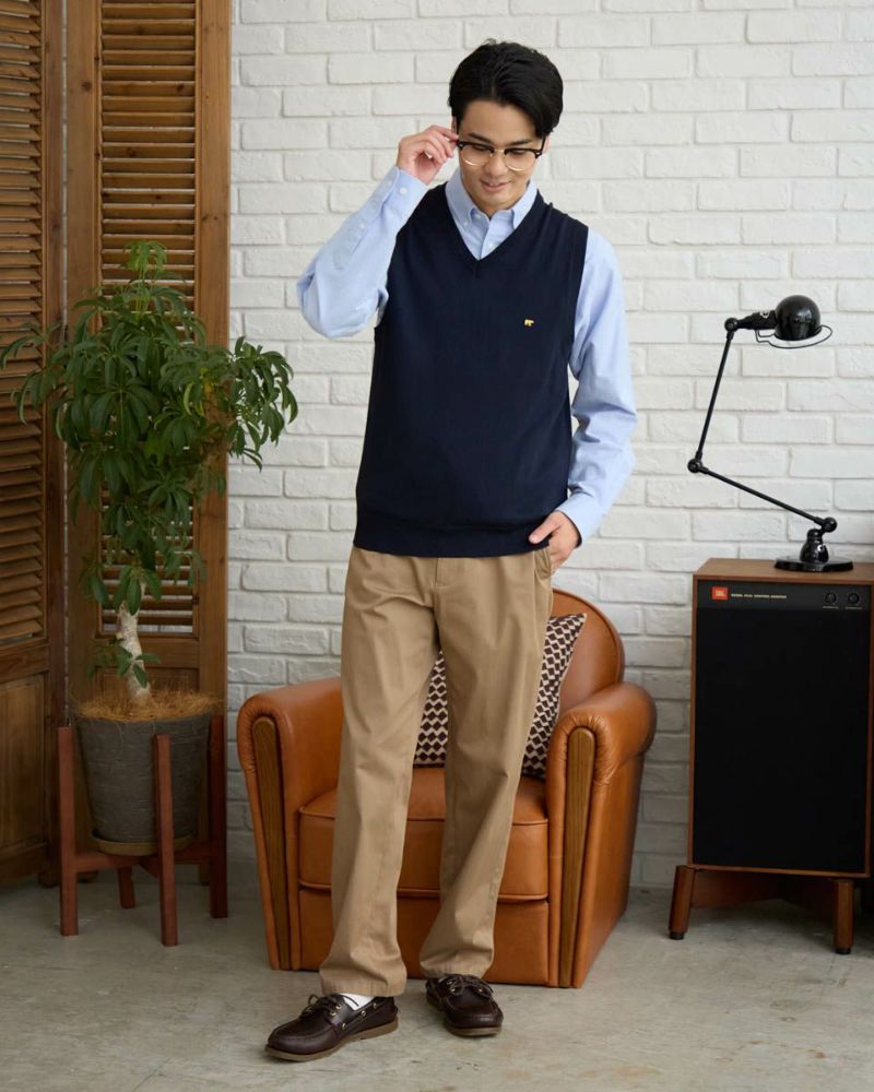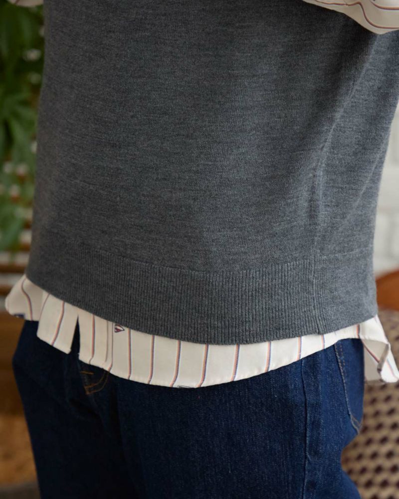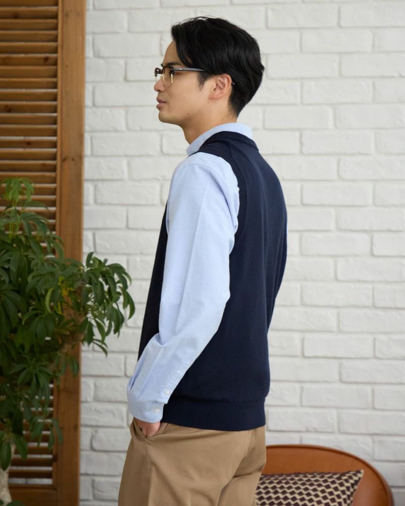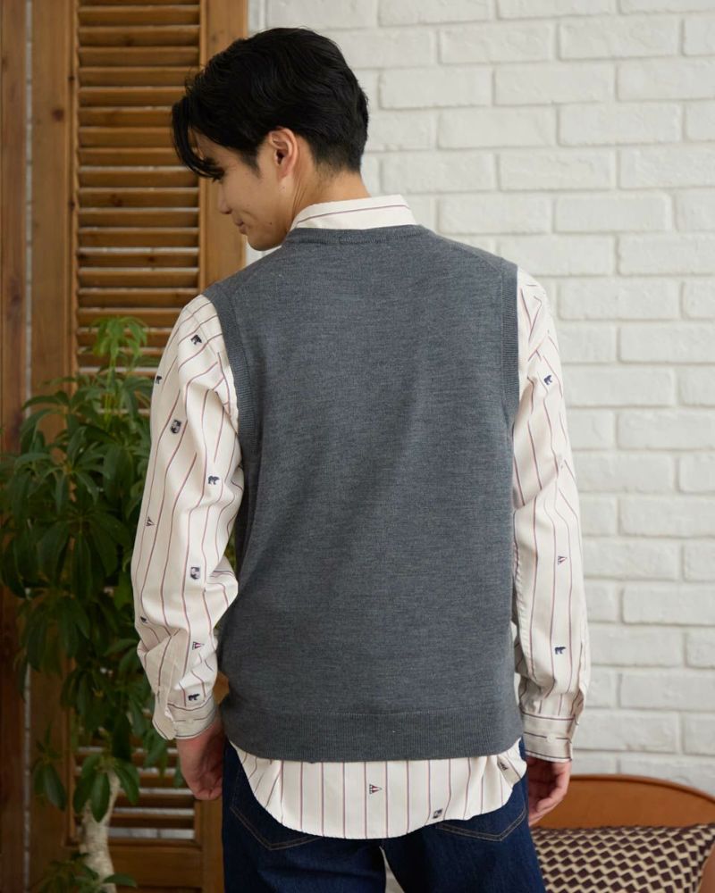 ベーシックなVネックニットベストです。メリノウール100%を使用した12G天竺の編地です。優れた保温性と肌触りが特徴です。繊維がとても細かいため、チクチクする不快感を感じにくいのも魅力です。お手入れが楽な家庭洗濯 (手洗い)が可能です。シーズンカラーはこちら モデル身長: 176 cm 着用サイズ: L サイズ Golden Bear Men's ニット (Men's) 【着用アイテム】314RD131 キルトジャケット 314RC208 ストライプシャツ 314RC230 オックスシャツ 314R8702 デニム 314RC700 ワイドチノ 314RC704 イージーパンツ