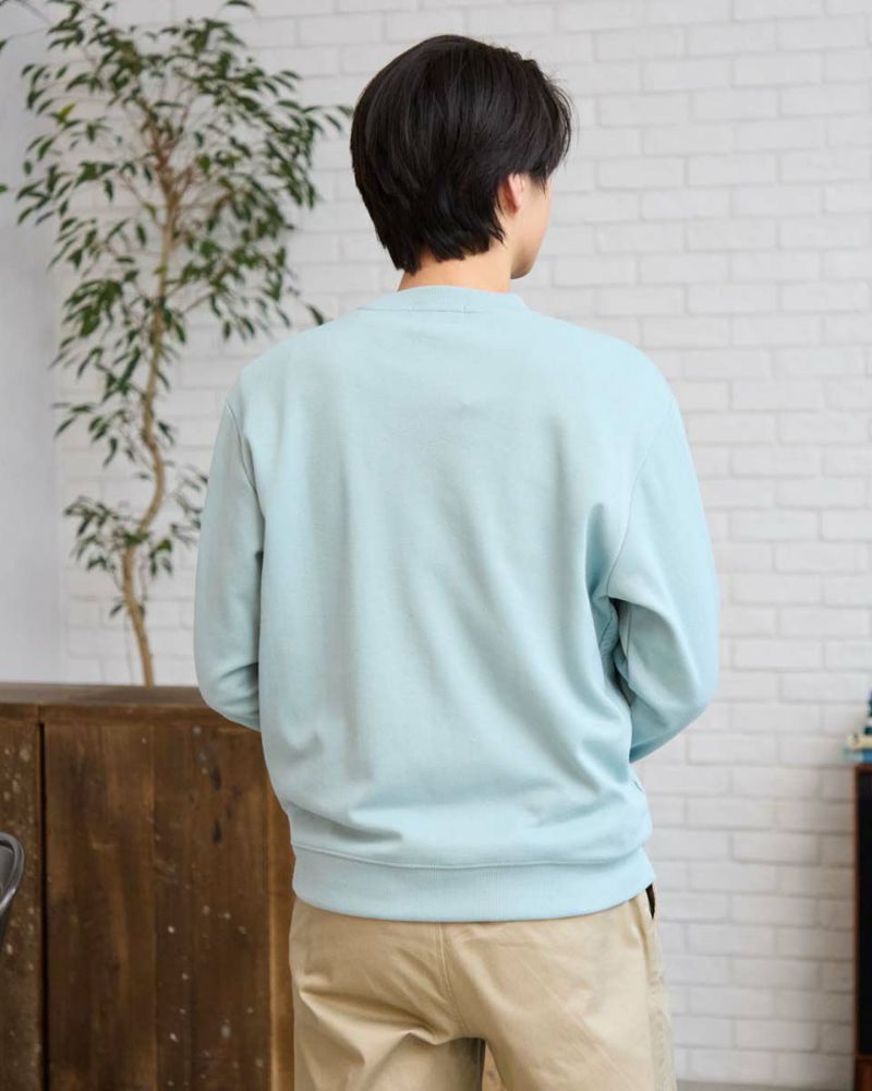 立体的な組織で切り替えたスウェットです。前身頃は立体感のあるフクレジャカード生地、後身頃・袖はダンボールニット生地を使用しています。ストライプ調の縦柄がシャープな印象で上品なスタイリングを演出します。