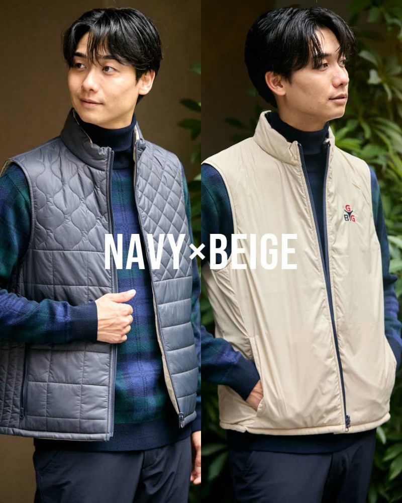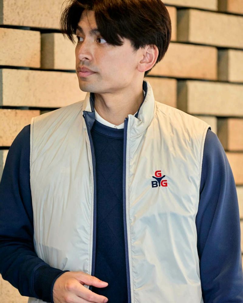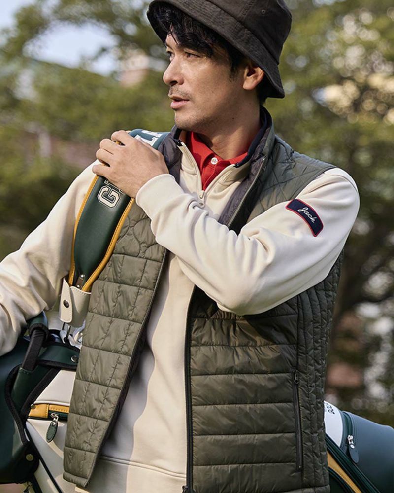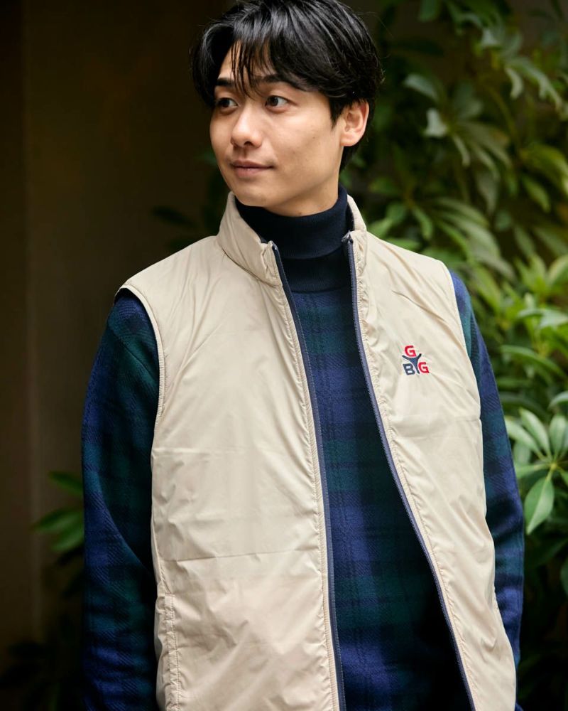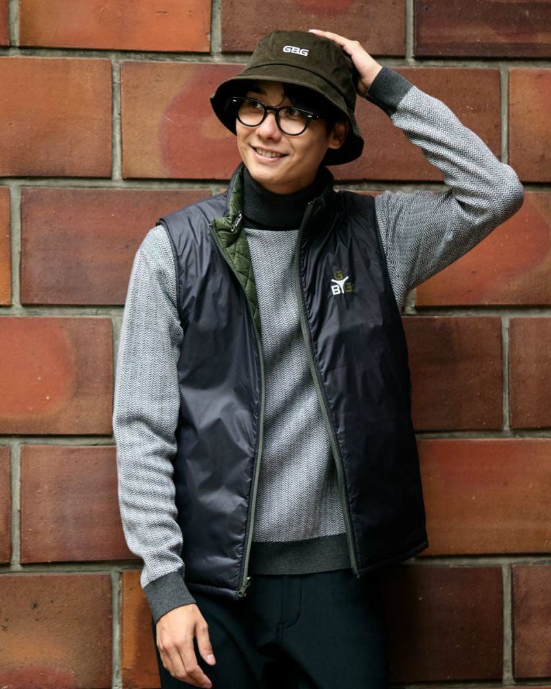 中綿にナノテク素材“グラフェン”を使用した軽量リバーシブルベストです。表面は異なるキルトステッチを組み合わせた、クレイジーデザイン。裏面はシンプルでスポーティ。着合わせに応じて変わる表情をお楽しみください! はっ水性に優れた生地を使用し、軽い!(Lサイズ:260g)更に蓄熱保温付き!機能的かつ遊び心の効いた、今シーズンのオススメアイテムです! モデル身長: 180 cm 着用サイズ: L サイズ GB GOLF アウター (Men's) 【着用アイテム】 TRADタートルネックニット (品番: 312QE611 ) SPIKEハーフZIPスウェット (品番: 312QD422 ) GBGスラックス (品番: 312QC703 ) ハイブリッドスウェット (品番: 312QD423 ) GBGパンツ (品番: 312QD705 )