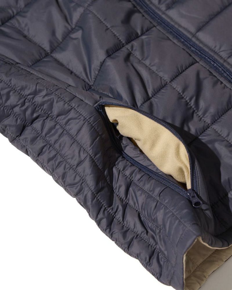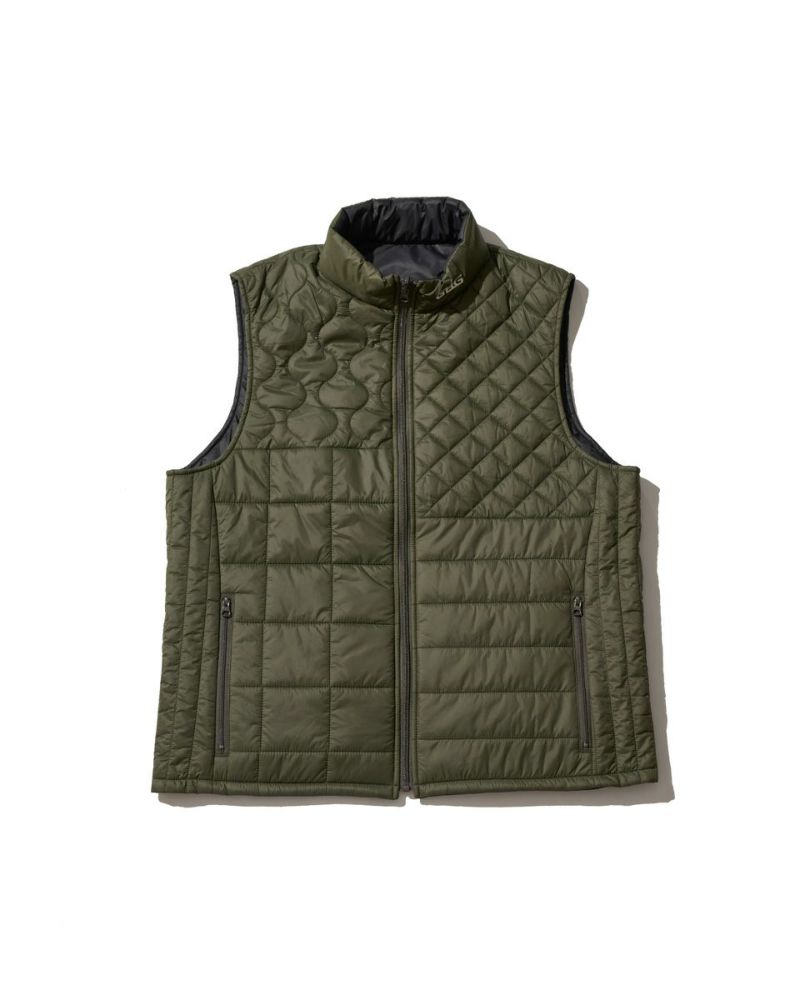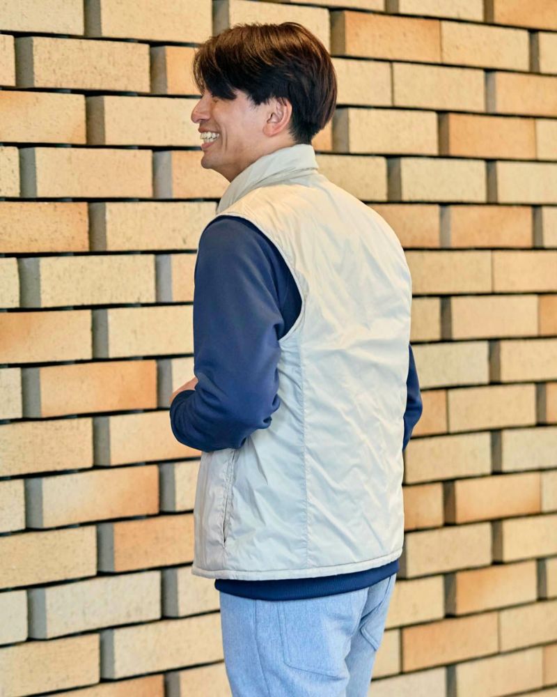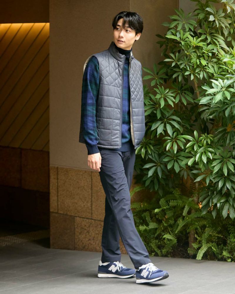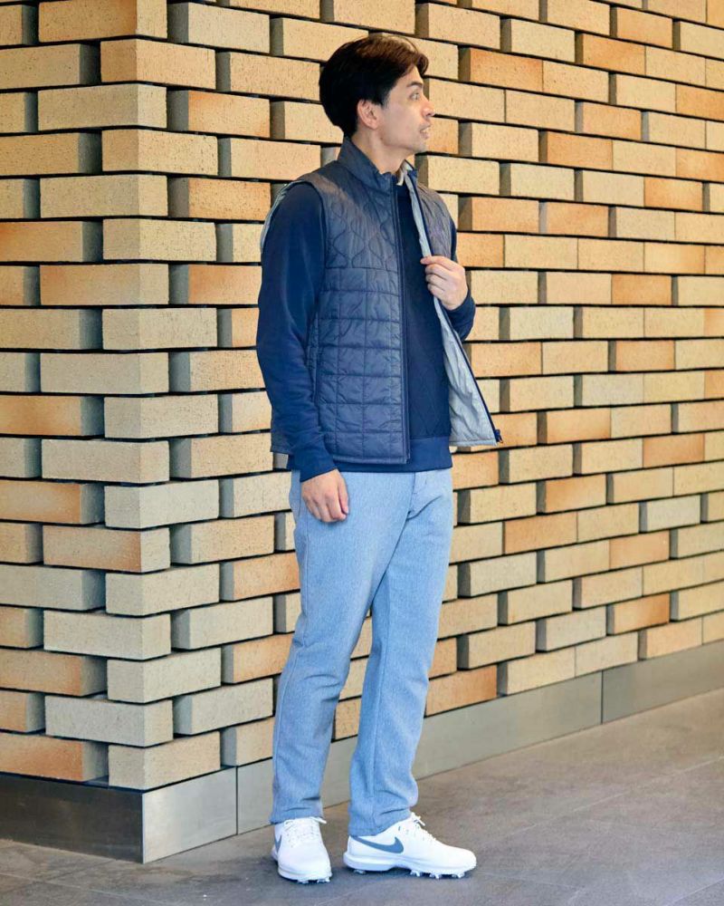 中綿にナノテク素材“グラフェン”を使用した軽量リバーシブルベストです。表面は異なるキルトステッチを組み合わせた、クレイジーデザイン。裏面はシンプルでスポーティ。着合わせに応じて変わる表情をお楽しみください! はっ水性に優れた生地を使用し、軽い!(Lサイズ:260g)更に蓄熱保温付き!機能的かつ遊び心の効いた、今シーズンのオススメアイテムです! モデル身長: 180 cm 着用サイズ: L サイズ GB GOLF アウター (Men's) 【着用アイテム】 TRADタートルネックニット (品番: 312QE611 ) SPIKEハーフZIPスウェット (品番: 312QD422 ) GBGスラックス (品番: 312QC703 ) ハイブリッドスウェット (品番: 312QD423 ) GBGパンツ (品番: 312QD705 )