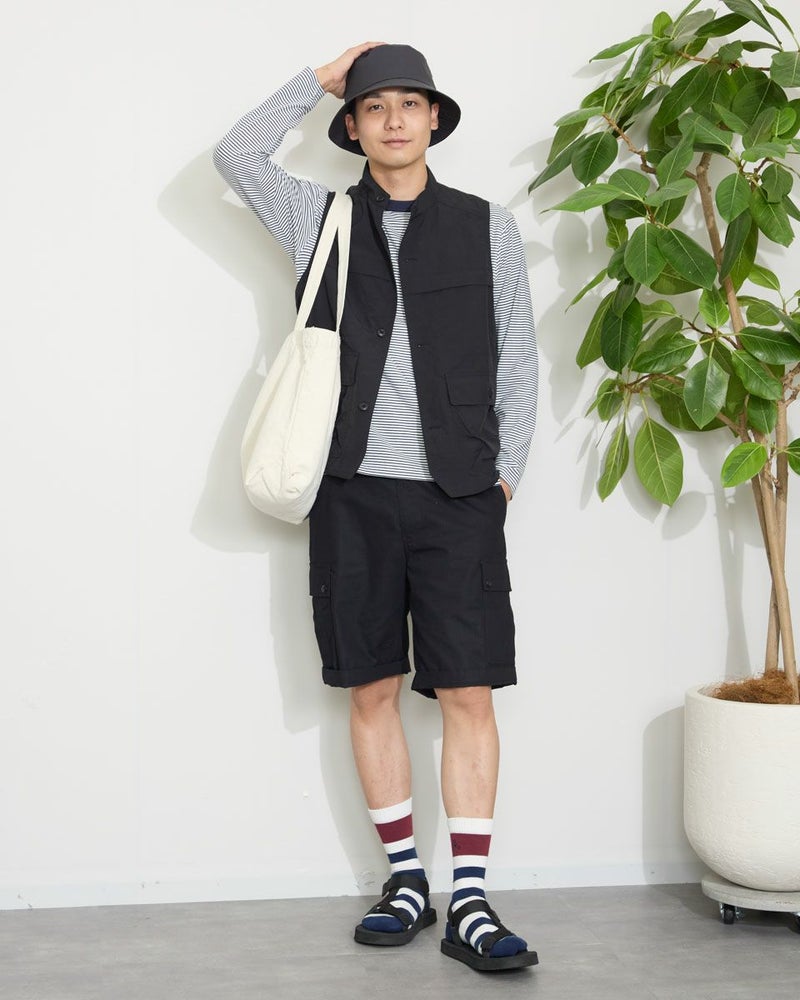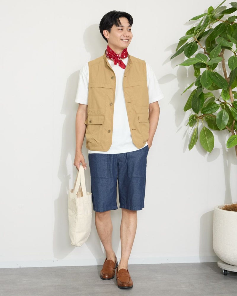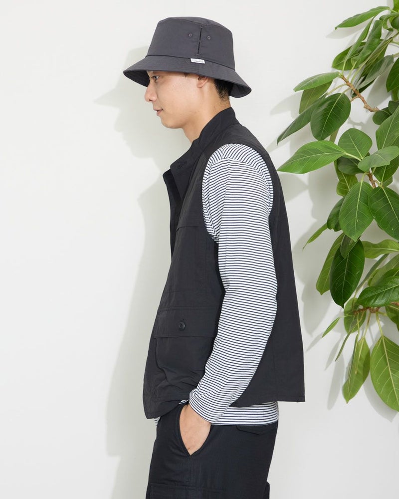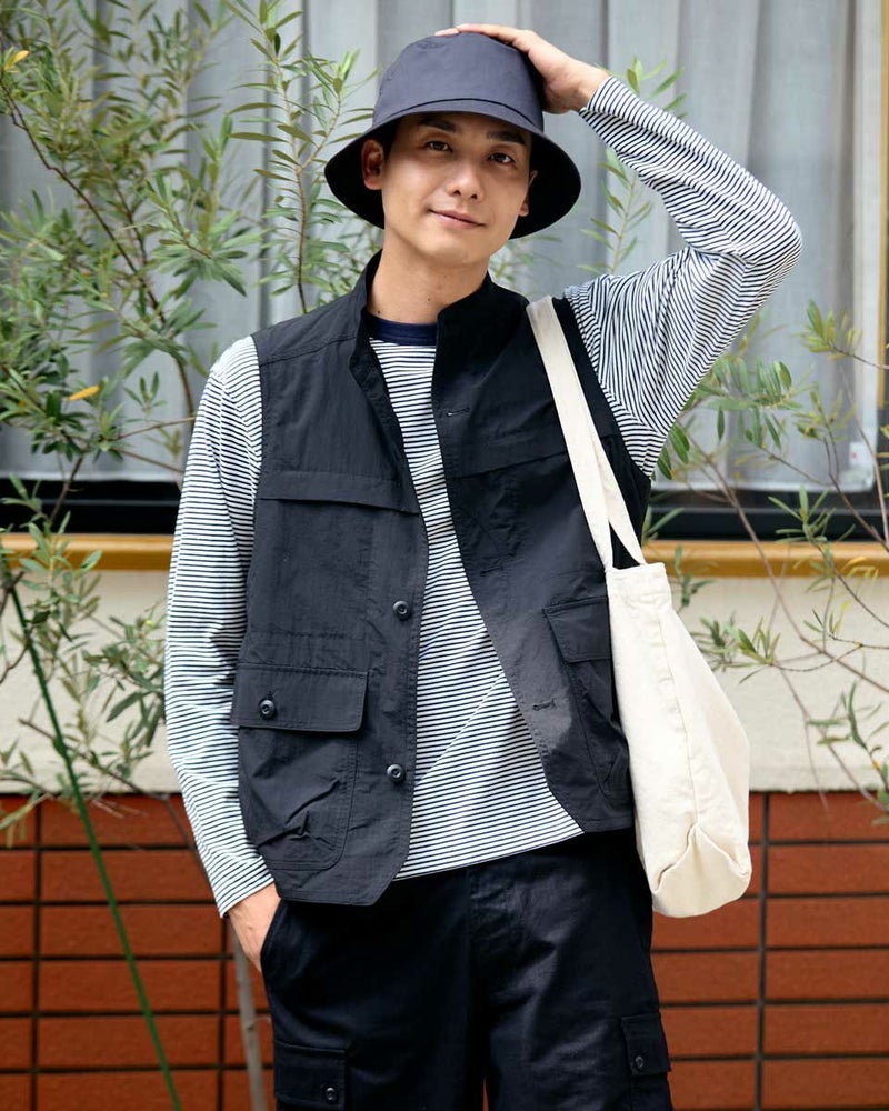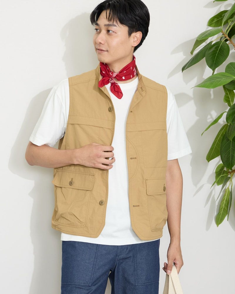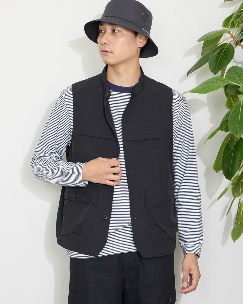 ナイロン素材を使用したスタンドカラーベストです。胸の隠しポケットや、腰のフラップポケットなど収納力の豊富さが特徴です。カジュアルシャツやTシャツなどと合わせたスタイリングをお楽しみください。 モデル身長: 180 cm 着用サイズ: L サイズ Golden Bear MEN アウター (MEN) 【着用アイテム】314QA030 ハット 314Q4530 リンガーTシャツ 314QB430 ボーダーTシャツ 314Q5711 ハーフパンツ 314QA701 ハーフパンツ