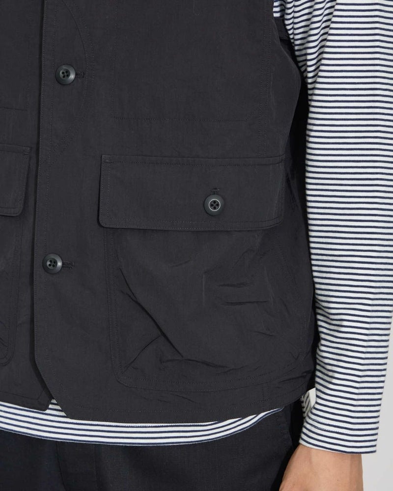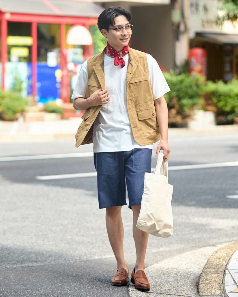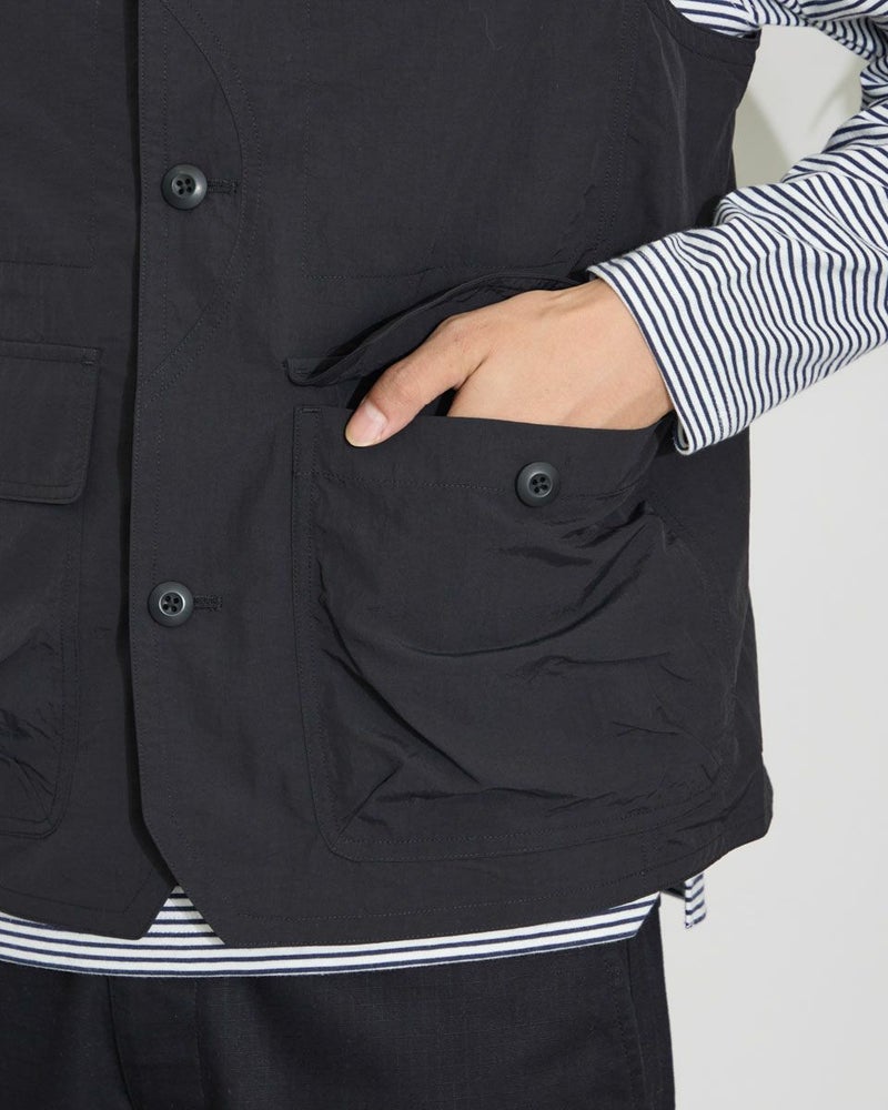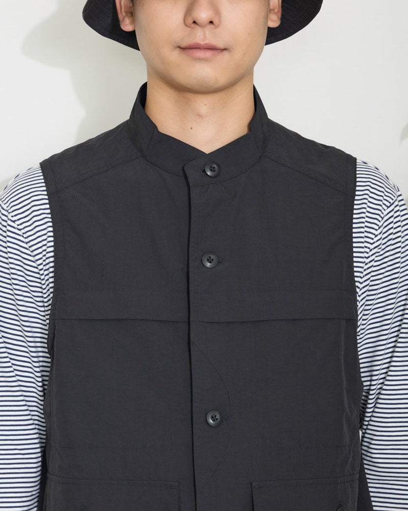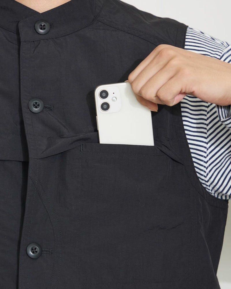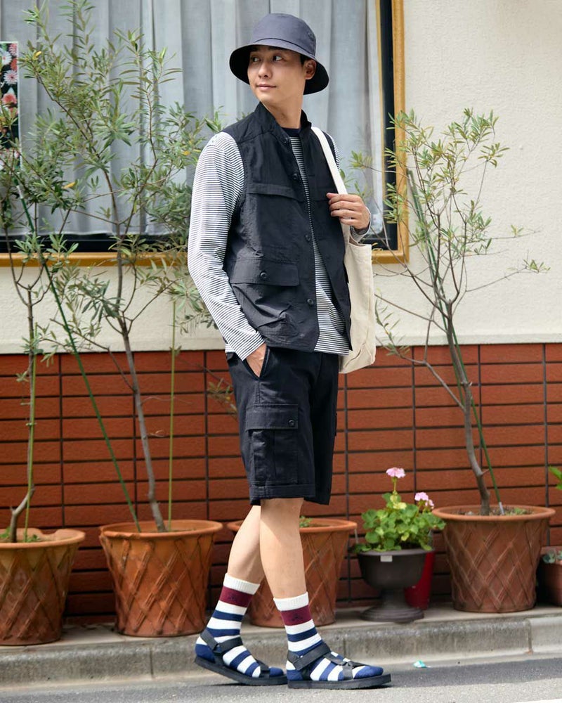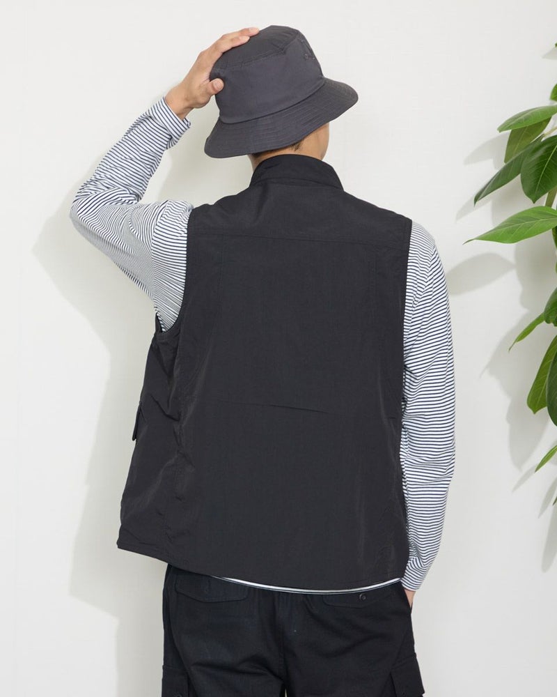 ナイロン素材を使用したスタンドカラーベストです。胸の隠しポケットや、腰のフラップポケットなど収納力の豊富さが特徴です。カジュアルシャツやTシャツなどと合わせたスタイリングをお楽しみください。 モデル身長: 180 cm 着用サイズ: L サイズ Golden Bear MEN アウター (MEN) 【着用アイテム】314QA030 ハット 314Q4530 リンガーTシャツ 314QB430 ボーダーTシャツ 314Q5711 ハーフパンツ 314QA701 ハーフパンツ