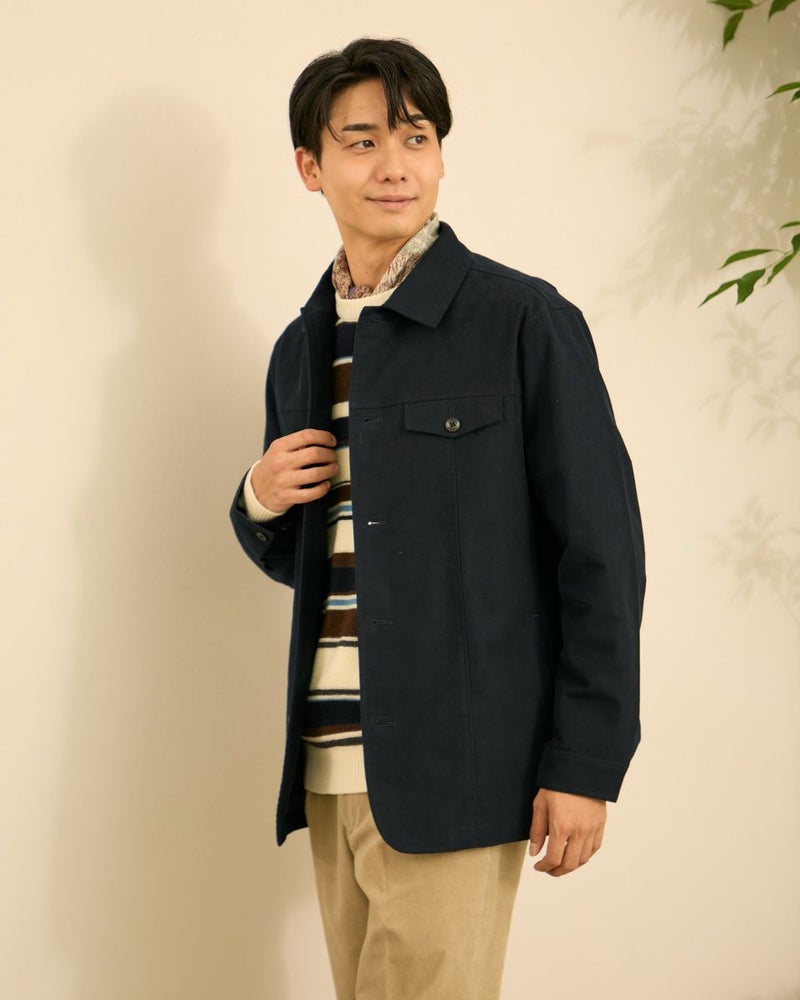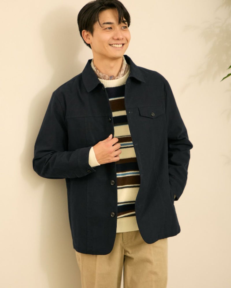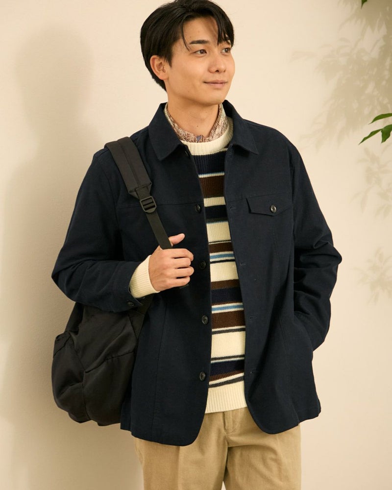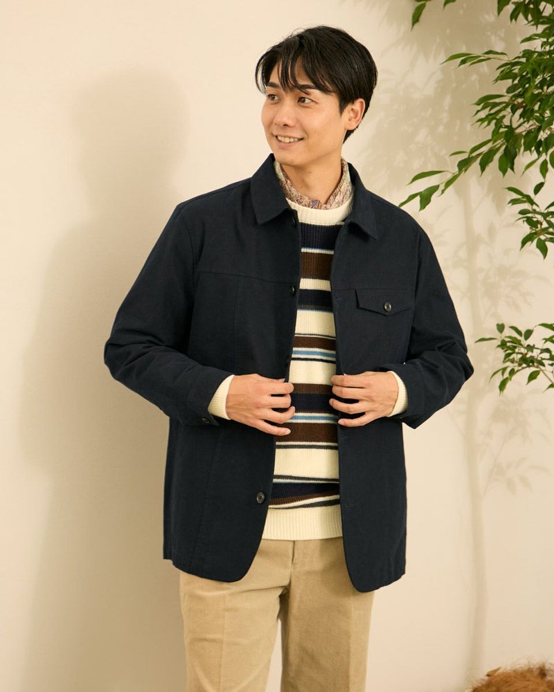上品さが漂うフィールドジャケットです。柔らかな風合いのモールスキン生地を使用しております。部分的に配したチェック布帛がアクセントです。インナーを調整すれば長い期間で着用いただけます。 モデル身長: 180 cm 着用サイズ: L サイズ Golden Bear MEN アウター (MEN) 【着用アイテム】314QE674 ボーダークルーニット 314QD271 プリントシャツ 314QD716 コーデュロイパンツ 314QC711 イージーパンツ