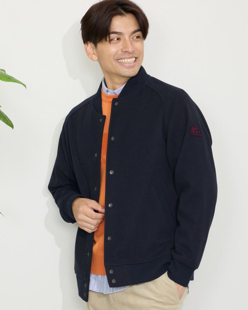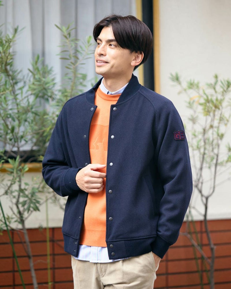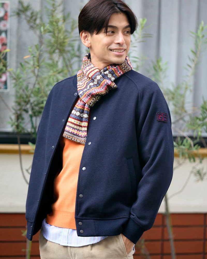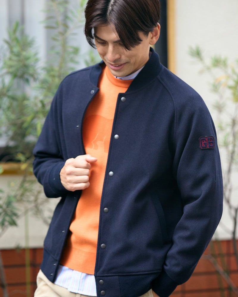 カットソー素材を使用した気軽に羽織れるスタジャンです。適度にハリ感があり、布帛のような見た目のジャージー素材を使用しています。左袖に配したロゴのワッペン刺繍がさり気ないポイントです。インナーによって様々なカジュアルスタイルをお楽しみください。 モデル身長: 180 cm 着用サイズ: L サイズ Golden Bear MEN カットソー (MEN) ウィメンズサイズはこちら キッズサイズはこちら 家族コーディネートアイテムはこちら 【着用アイテム】314QE021 フェアアイル柄マフラー 314QD612 クルーネックニット 314QC211 ストライプシャツ 314QD631 アーガイルニット 314QB440 GB天竺Tシャツ 314QD716 コーデュロイパンツ 314QB702 ストレッチデニム