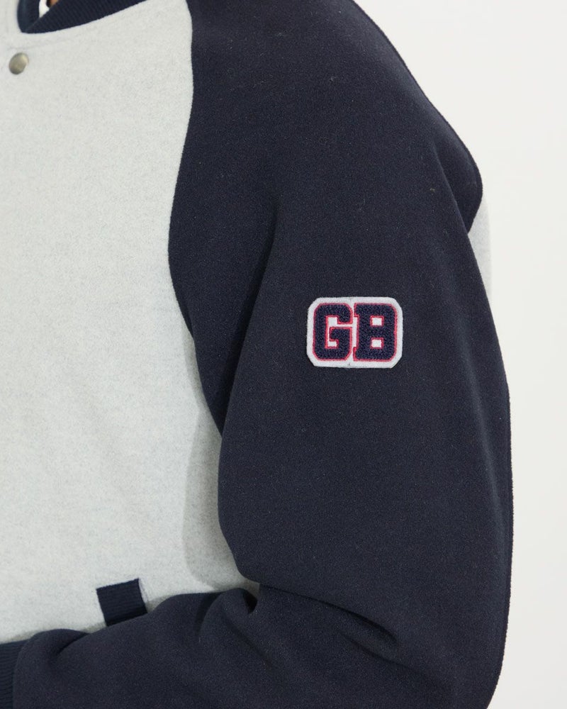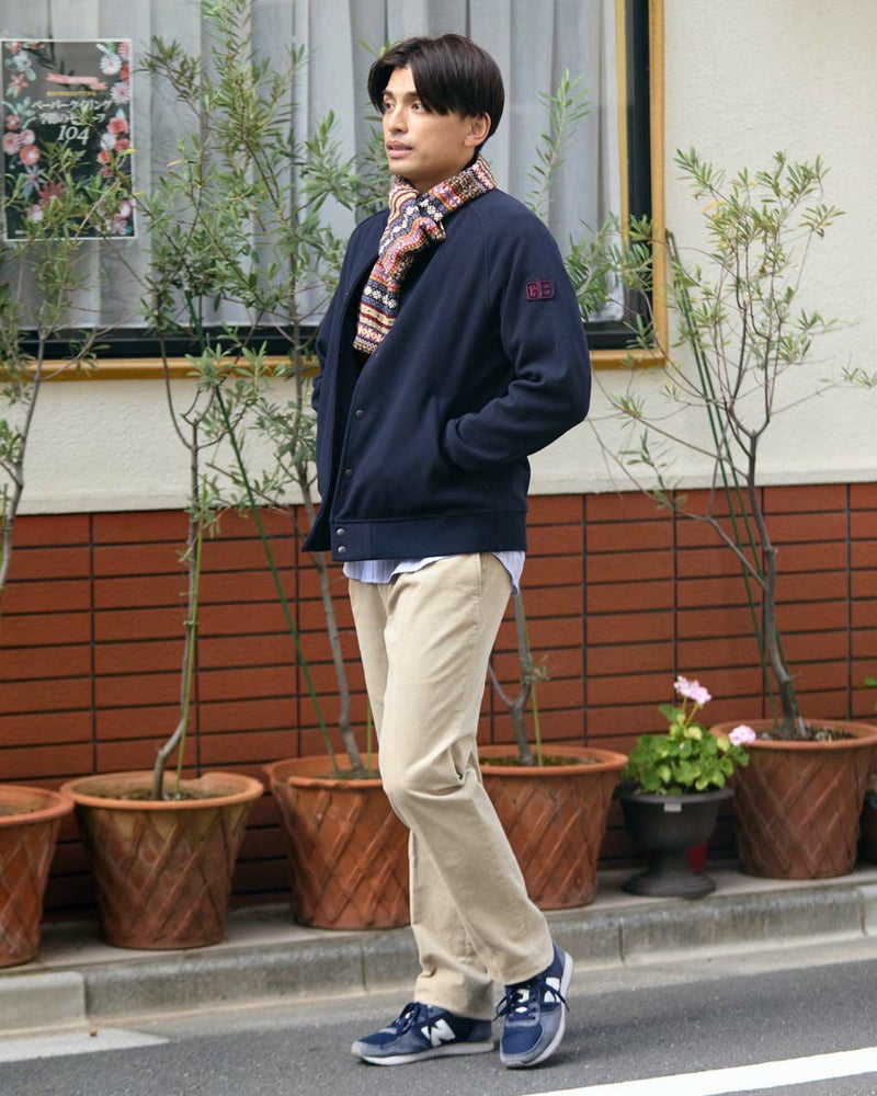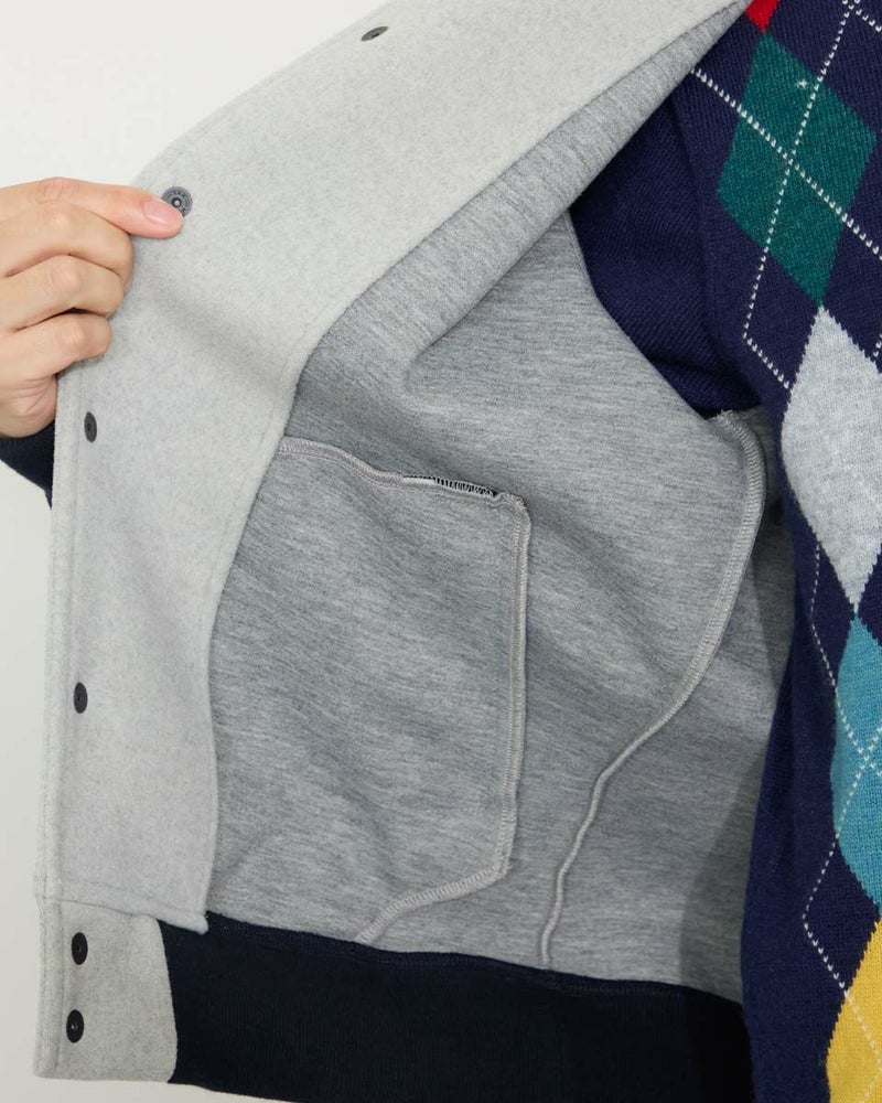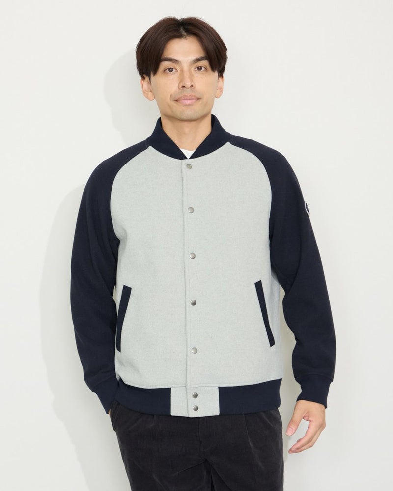カットソー素材を使用した気軽に羽織れるスタジャンです。適度にハリ感があり、布帛のような見た目のジャージー素材を使用しています。左袖に配したロゴのワッペン刺繍がさり気ないポイントです。インナーによって様々なカジュアルスタイルをお楽しみください。 モデル身長: 180 cm 着用サイズ: L サイズ Golden Bear MEN カットソー (MEN) ウィメンズサイズはこちら キッズサイズはこちら 家族コーディネートアイテムはこちら 【着用アイテム】314QE021 フェアアイル柄マフラー 314QD612 クルーネックニット 314QC211 ストライプシャツ 314QD631 アーガイルニット 314QB440 GB天竺Tシャツ 314QD716 コーデュロイパンツ 314QB702 ストレッチデニム