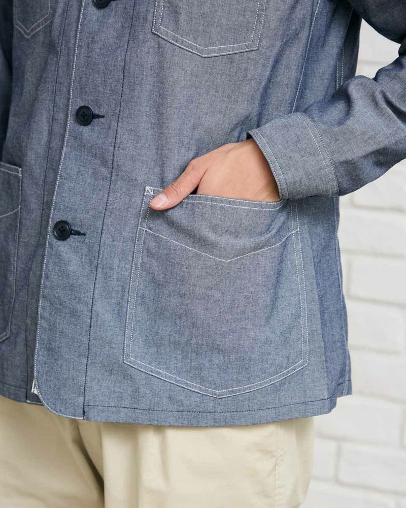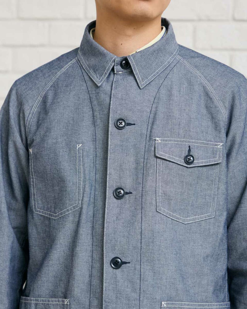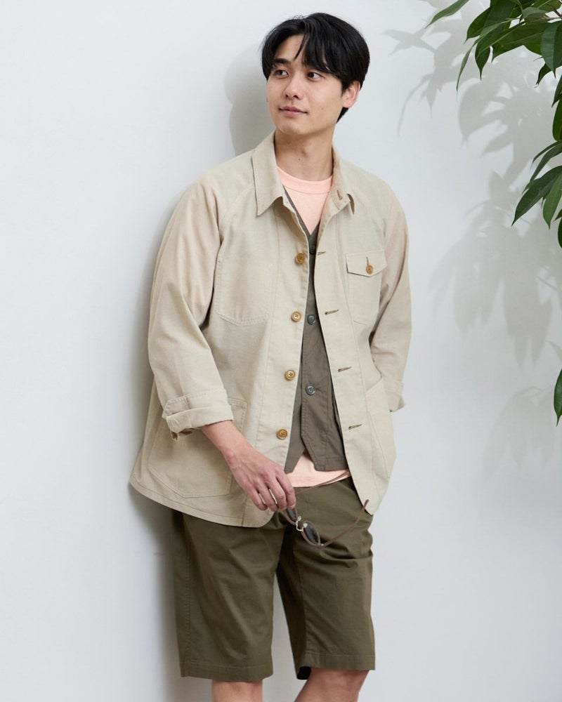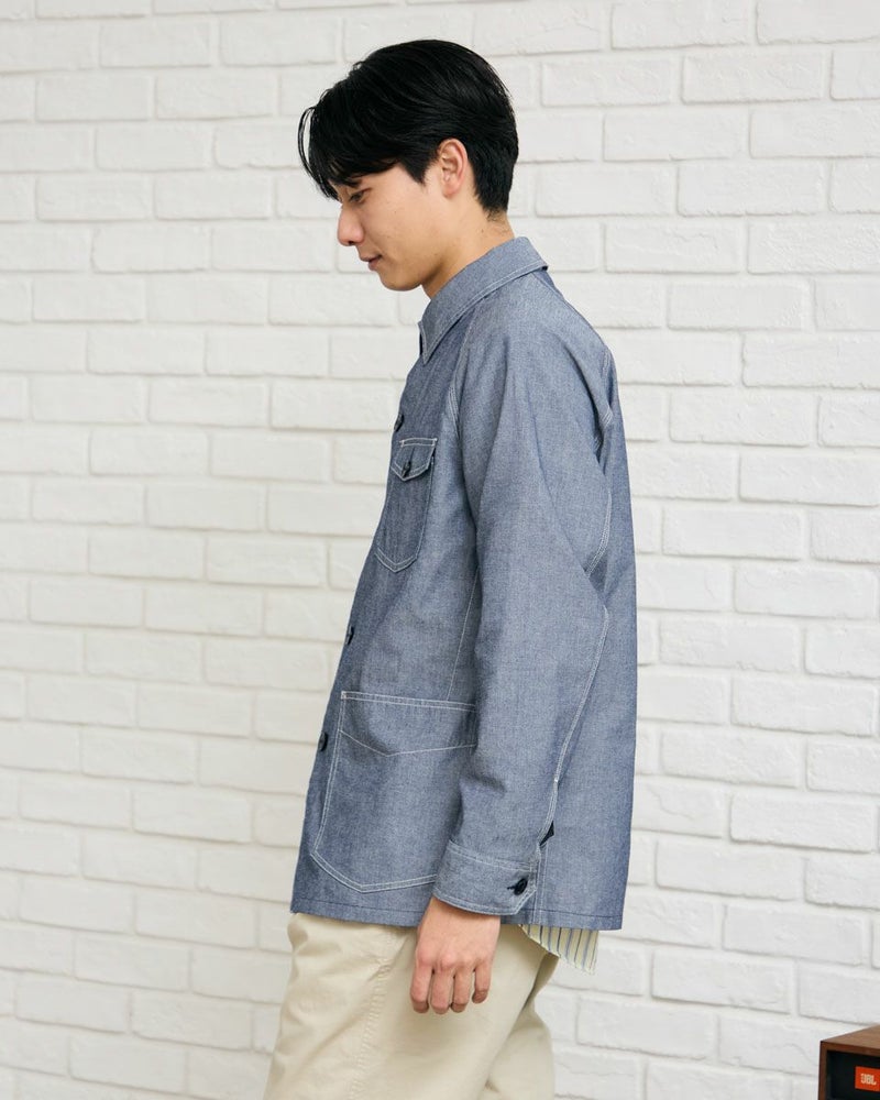 軽く羽織れるシャツ地のカバーオールです。 シャンブレー生地を使用しています。ラグランスリーブ仕様で動きやすい着用感も魅力です。ご家庭でのお洗濯(手洗い)が可能です。