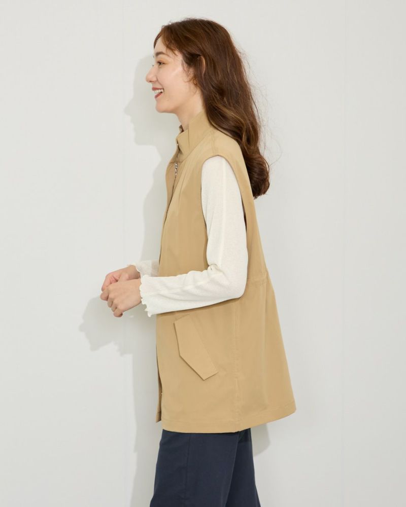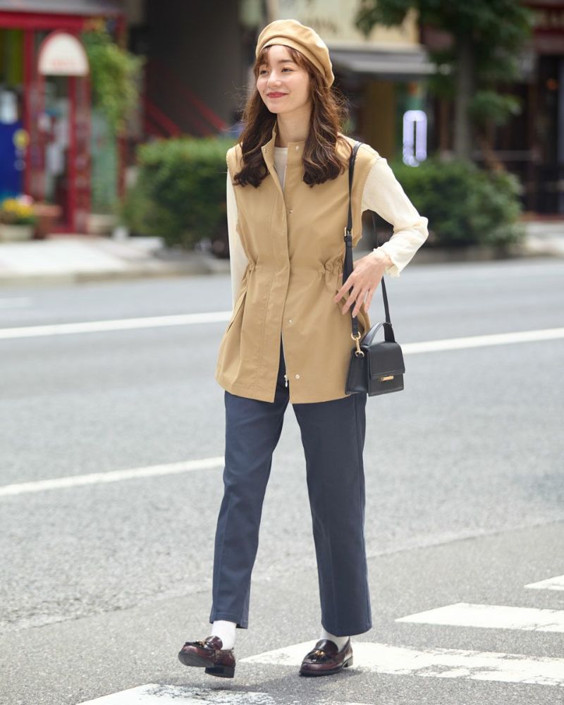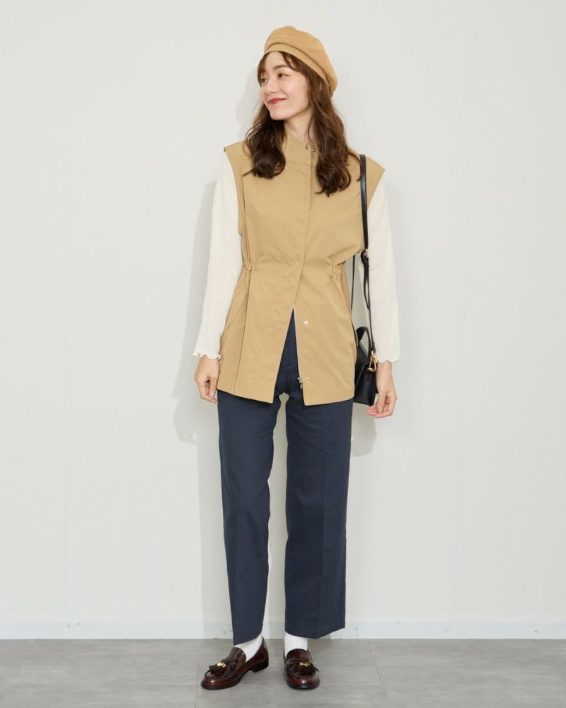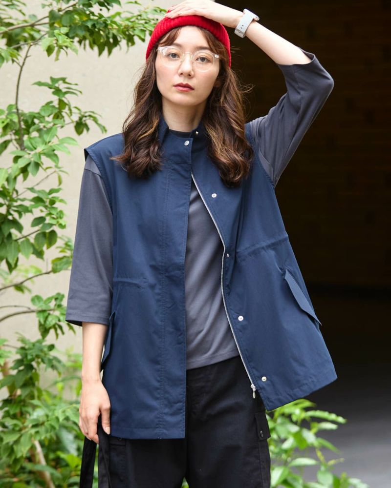 レイヤードスタイルに欠かせない布帛ベストです。Tシャツやシャツに重ねるだけでこなれ感がアップします。ドロストで動きもつけられ、メリハリシルエットで女性らしく着こなせます。 モデル身長: 171 cm 着用サイズ: M サイズ Golden Bear Ladies' アウター (Ladies') 【着用アイテム】467QB402 七分袖GB天竺Tシャツ 467QB413 テレコTシャツ 467QB712 折山プレスストレートパンツ