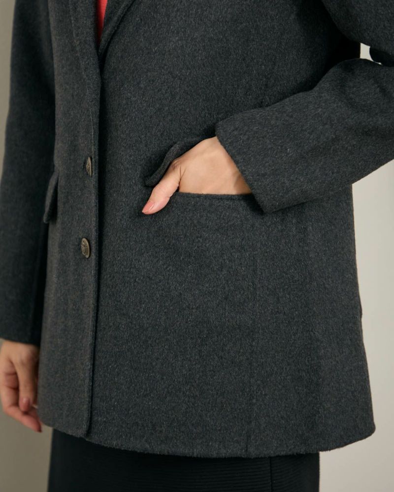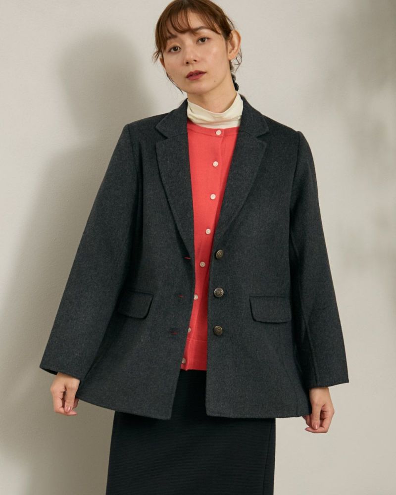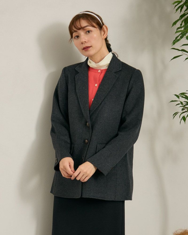 ウール混の二重織素材を使用し、一枚仕立てに仕上げたテーラードジャケットです。(二重織とは:2枚の生地を重ねて1枚に仕上げる織り方の事です。コートやタオル等ふわふわとした素材の物に使われる事が多く、柔らかさと保温性の高さが特徴です)アンティックゴールドの釦がポイントで、同色染をしたベーシックな釦も1セット付けていますので、お好みで釦をアレンジできます。袖のみ滑りが良い様に裏地を付けています。色はトップグレーとネイビーの2色です。 モデル身長: 171 cm 着用サイズ: M サイズ Jack Nicklaus (Ladies') アウター (Ladies') 【着用アイテム】467QC411 タートルネックTシャツ 467QC610 カーディガン 467QD331 チェックシャツ 467QC712 スカート 468QD750 ストレートパンツ