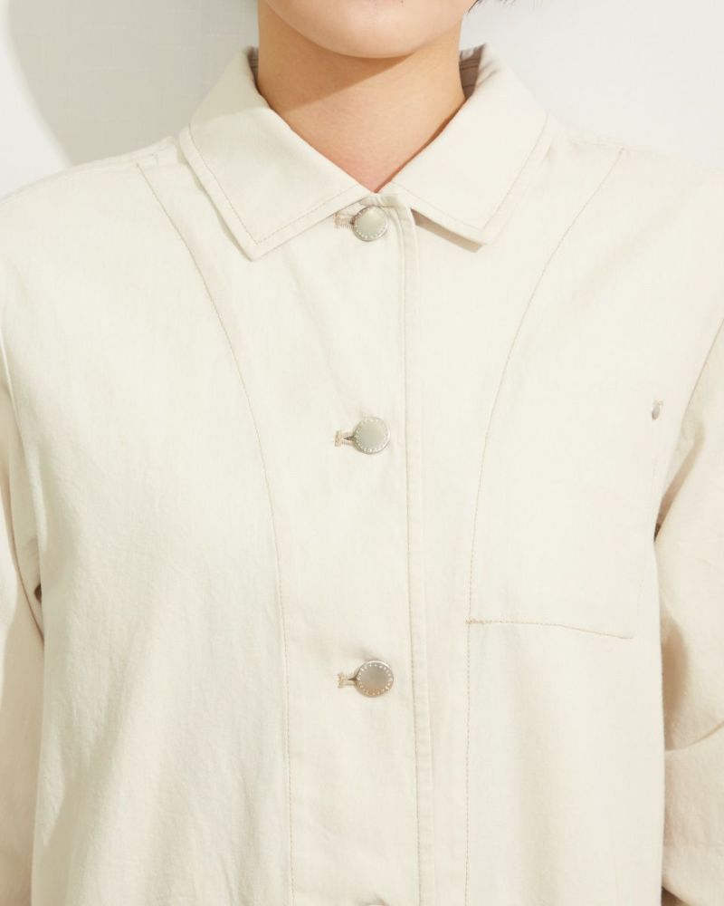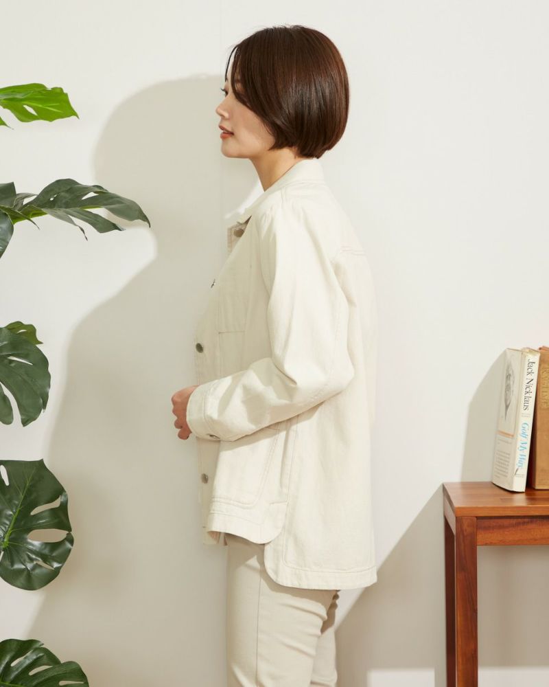 5.5ozの薄いデニムを使用したカバーオールです。襟がシャープに首に沿うように後ろ襟には月こし(半台襟)を付けています。裾は両脇の重ねたスリットがポイントで、着丈は前後差を付けています。左胸のポケットは内ポケットになります。前中心タック釦開きで釦にはブランドロゴの刻印を入れています。 モデル身長: 167 cm 着用サイズ: M サイズ 同デザイン通常サイズはこちら Golden Bear QUEEN SIZE(Ladies' 大きいサイズ ) アウター (Ladies')