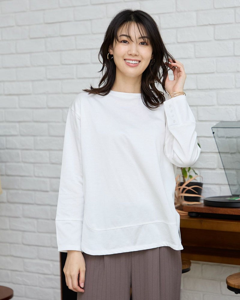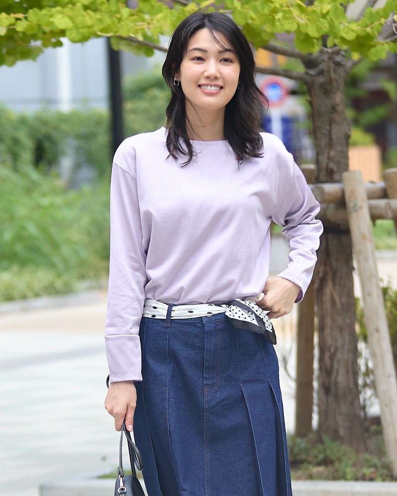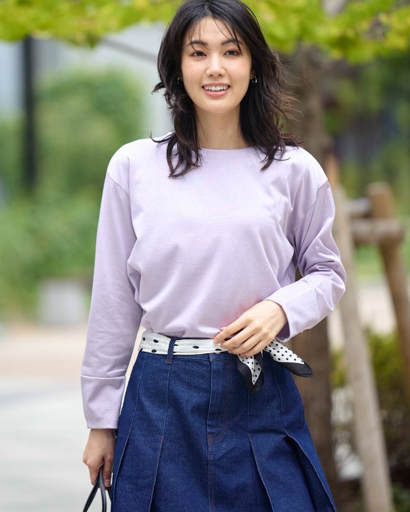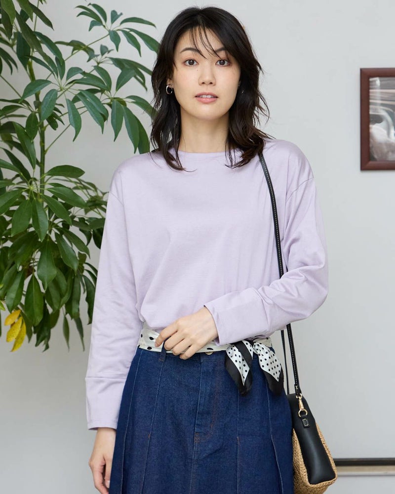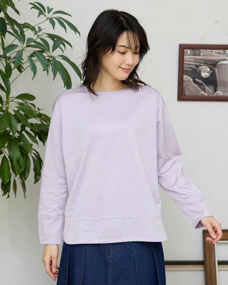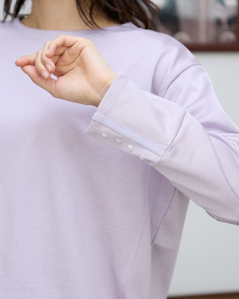 ほどよい張りコシがあり生地表面の毛羽もなくクリーンで艶やかなカットソー。脇から裾へラウンドした切り替えにデザイン性があるため、シンプルだけでは終わらない、お洒落なアイテム。ゆとりのある身頃ですがキックバックに優れているためダレにくい点もポイント。キラッと光沢のある編地で、カジュアルなTシャツ使いだけに留まらずジャケットやジレのインナー使いや、ネックレスを添えてブラウスのようにお召しになっても素敵です。色みがダークになっていく中でブラウンやチャコールと相性の良いパープルカラーは年明け、春を感じるカラーとしても使えるため1枚あると便利です。 モデル身長: 166 cm 着用サイズ: M サイズ Golden Bear White Label (WOMEN) カットソー (WOMEN) 【着用アイテム】468RC650 シャギーニットプルオーバー 468RC352 サロペット 468RC750 ストライプパンツ 468RC751 デニムスカート