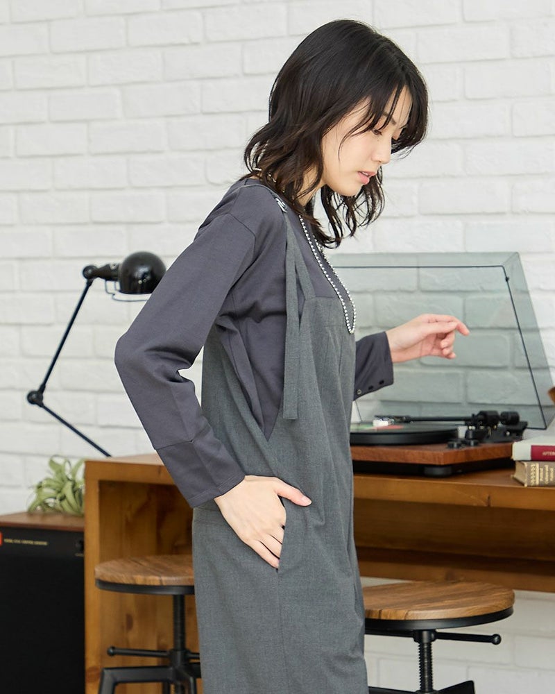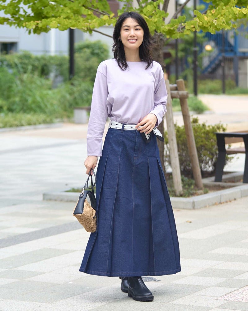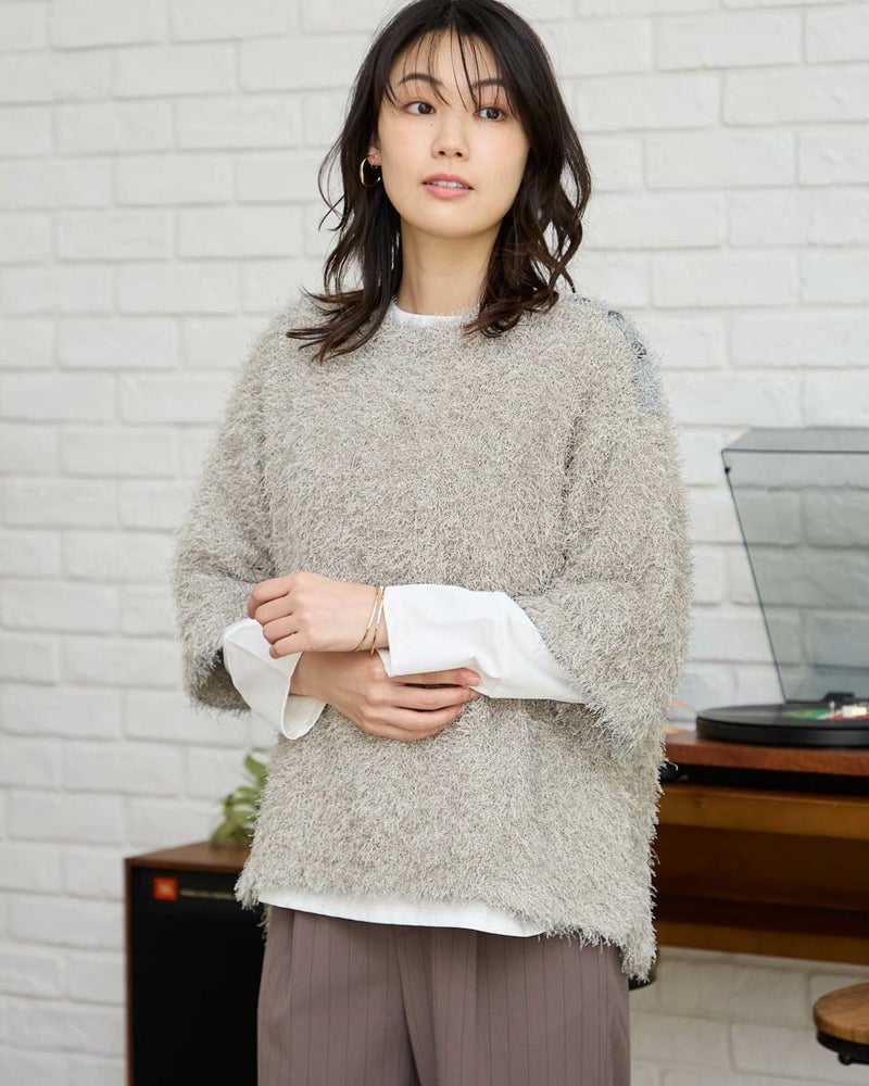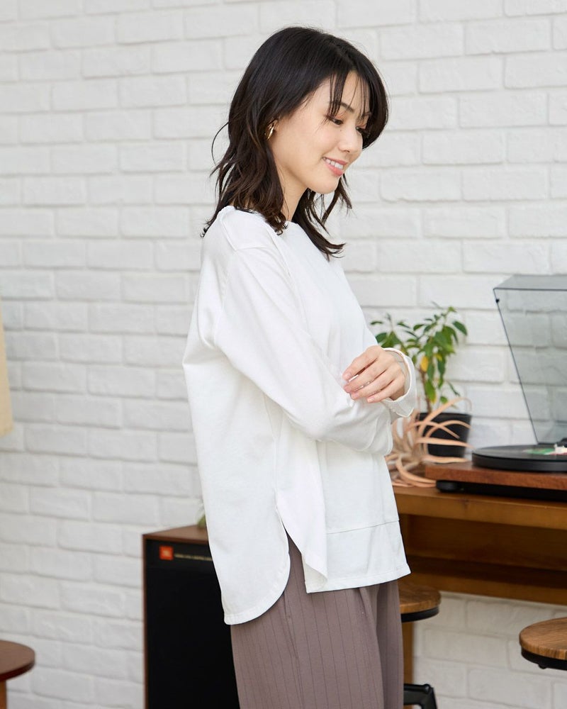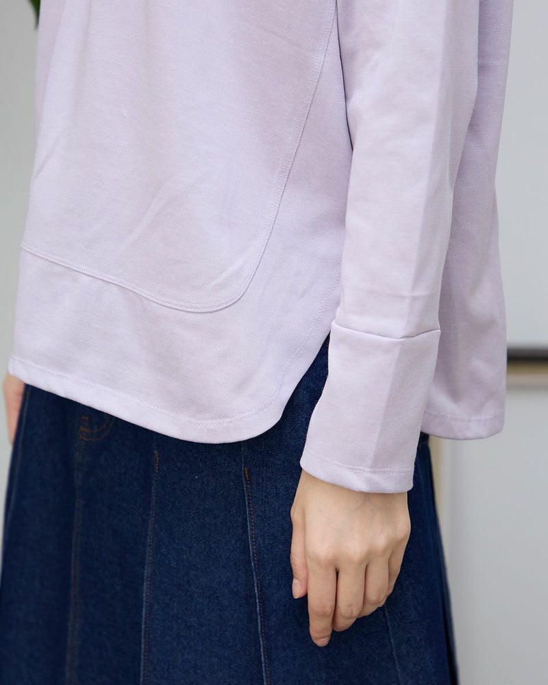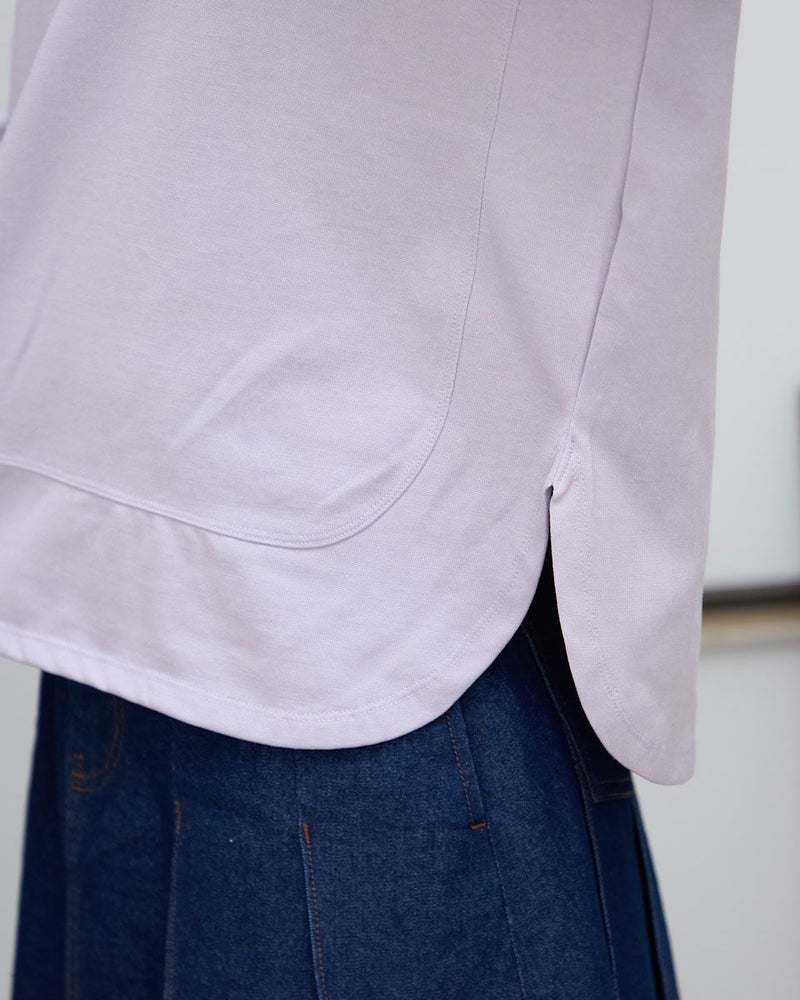 ほどよい張りコシがあり生地表面の毛羽もなくクリーンで艶やかなカットソー。脇から裾へラウンドした切り替えにデザイン性があるため、シンプルだけでは終わらない、お洒落なアイテム。ゆとりのある身頃ですがキックバックに優れているためダレにくい点もポイント。キラッと光沢のある編地で、カジュアルなTシャツ使いだけに留まらずジャケットやジレのインナー使いや、ネックレスを添えてブラウスのようにお召しになっても素敵です。色みがダークになっていく中でブラウンやチャコールと相性の良いパープルカラーは年明け、春を感じるカラーとしても使えるため1枚あると便利です。 モデル身長: 166 cm 着用サイズ: M サイズ Golden Bear White Label (WOMEN) カットソー (WOMEN) 【着用アイテム】468RC650 シャギーニットプルオーバー 468RC352 サロペット 468RC750 ストライプパンツ 468RC751 デニムスカート