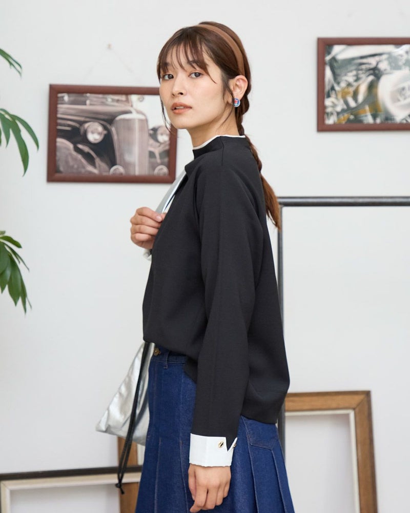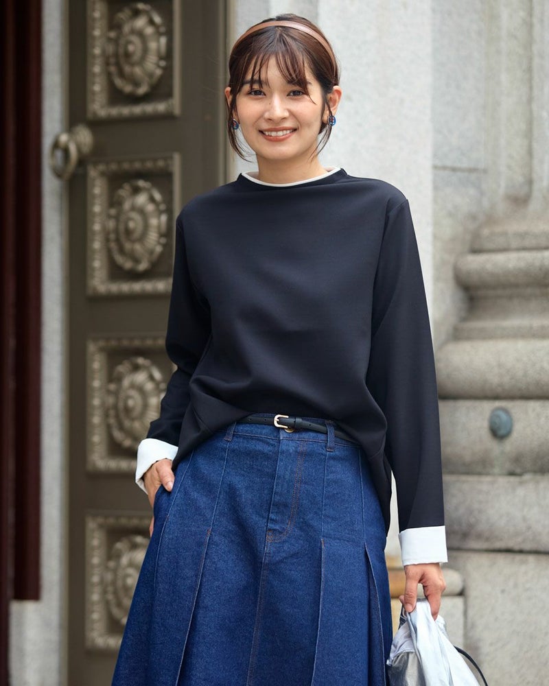 ほどよい厚みと弾力がある2重織りの素材をセレクト。ボディラインを拾わずダレにくいため清潔できちんとした印象のプルオーバー。Tシャツよりも肉厚で裏毛より薄手な生地感は1枚着の季節に便利。身頃から続きで立ち上げたボトルネックと袖口にあしらった別地がポイント。白いシャツを重ね着しているようなクラシックスタイルのアイテム。袖口のメタルチャームが光る様子も華やかなフェミニンさがありオフィスや握手会でお召しになっても素敵です。シックなブラックの使い勝手は抜群!オレンジも顔映りが良くトレンドのブラウンと相性がいいのでおすすめ。