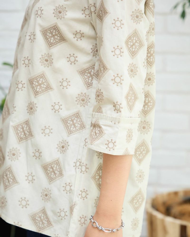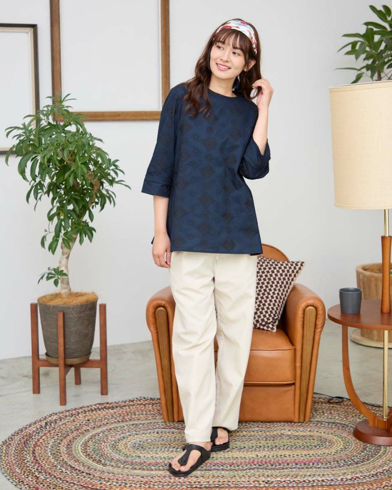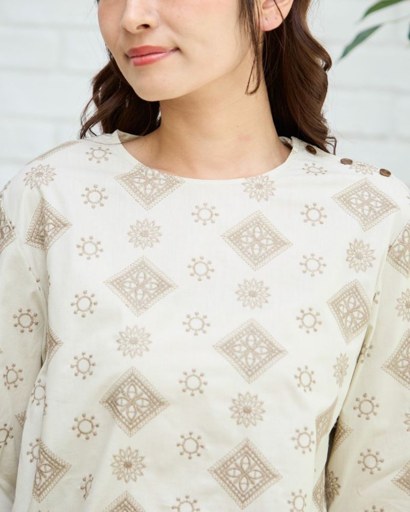 プリントでは表現できない刺繍ならではの高級感のあるブラウスです。ナチュラルなのに存在感があり1枚でコーディネートが完成する便利なアイテムです。