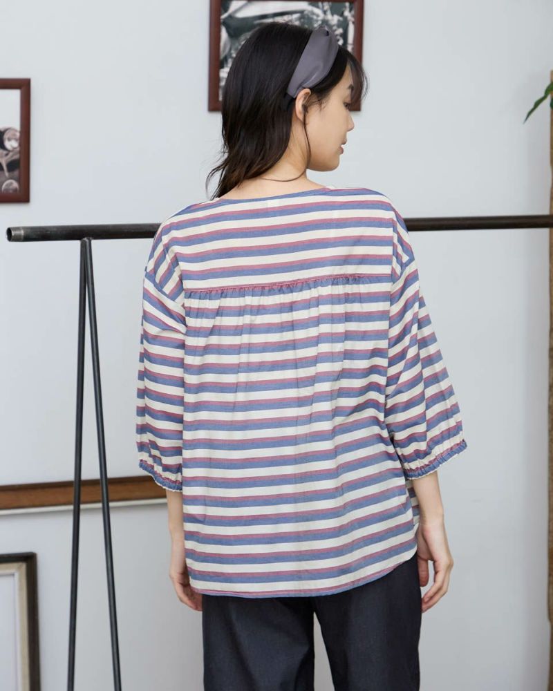 透け感が涼しげな、シースルーボーダーブラウス。軽やかな素材を使った、ゆったりシルエットのプルオーバーブラウス。胸元はボタン開きで、着脱もしやすいデザインです。体のラインを拾わないリラックス感のある着心地で、暑い季節も快適に。 モデル身長: 166 cm 着用サイズ: M サイズ Golden Bear Ladies' ブラウス (Ladies') 【着用アイテム】467R8711 ガウチョパンツ 467R8720 ガウチョパンツ