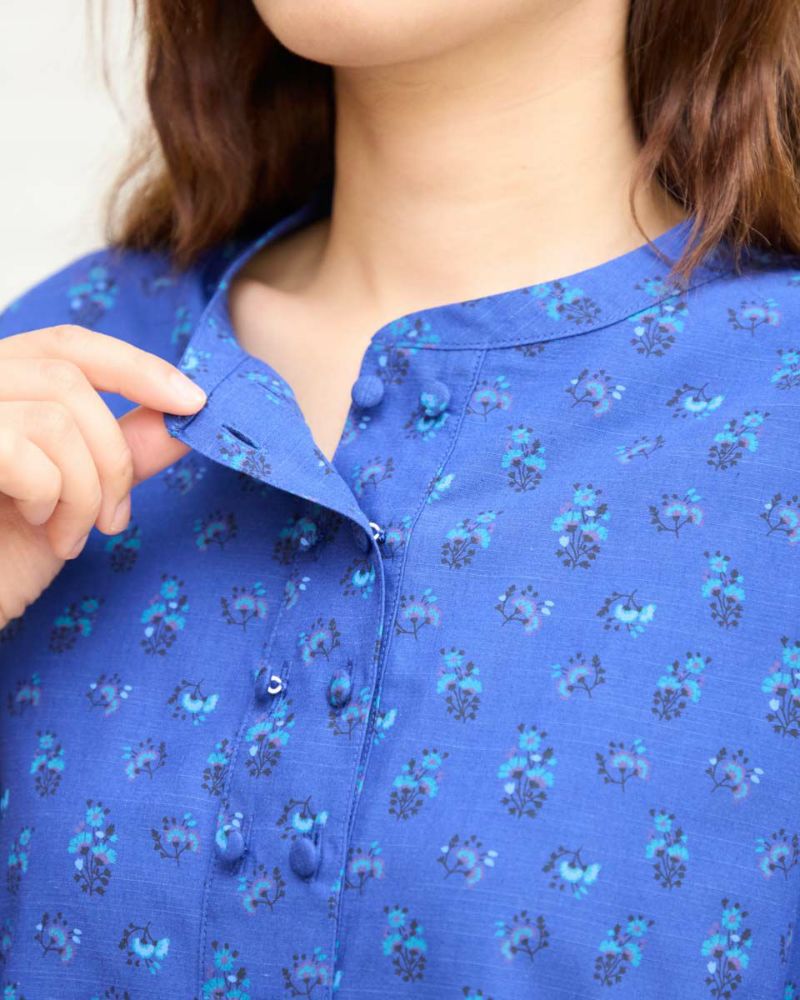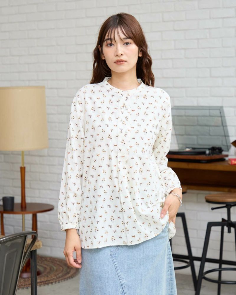 小花柄プリントブラウスです。前たてに並んだ釦がアクセント。デニムやワイドパンツと合わせれば甘さを抑えた大人スタイルで着用できます。