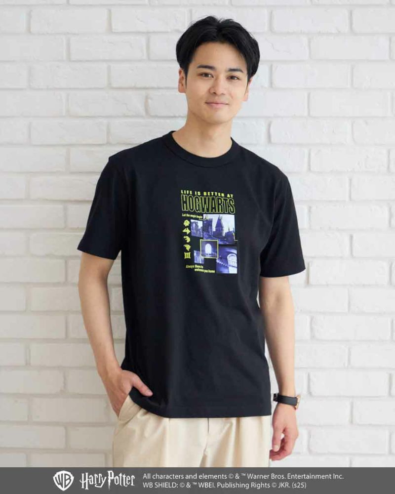 ブラックには、ホグワーツ城のシーンをモノトーンでプリント。ビビッドなイエローのテキストやロゴが効いたスタイリッシュなグラフィックに仕上げています。