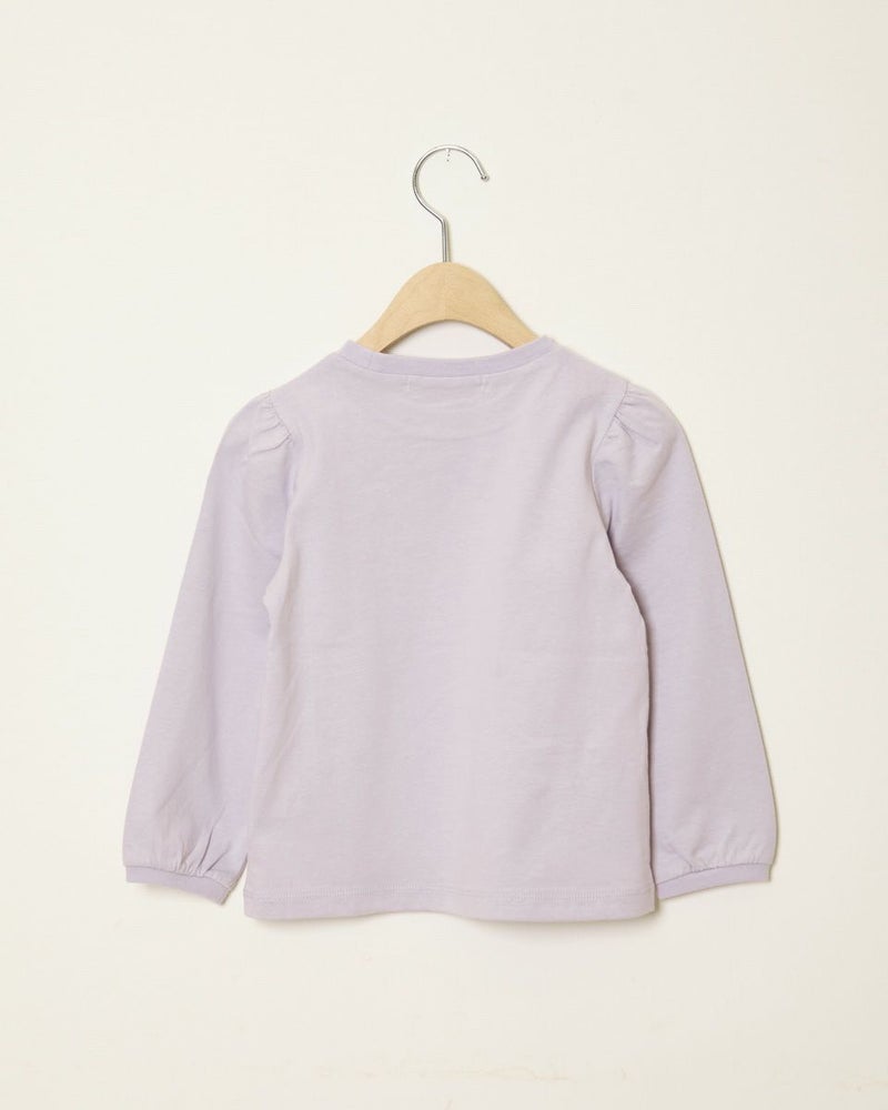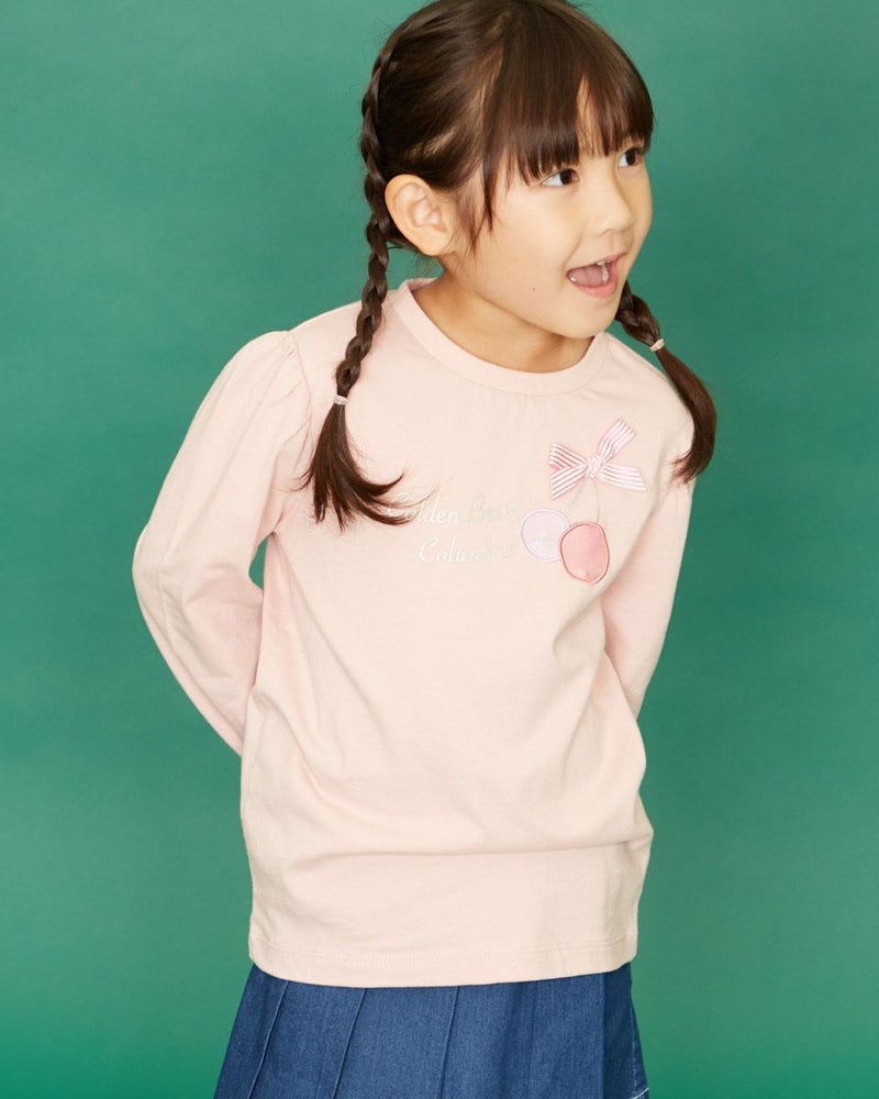 胸元のチェリーをモチーフにした装飾とリボン使いがとてもキュートな天竺Tシャツです♪淡いピンクとラベンダーの2色展開。肩と袖口のパフ仕様も女の子らしく、スカート合わせはもちろんパンツと合わせても素敵です。ギフトにもオススメですよ。