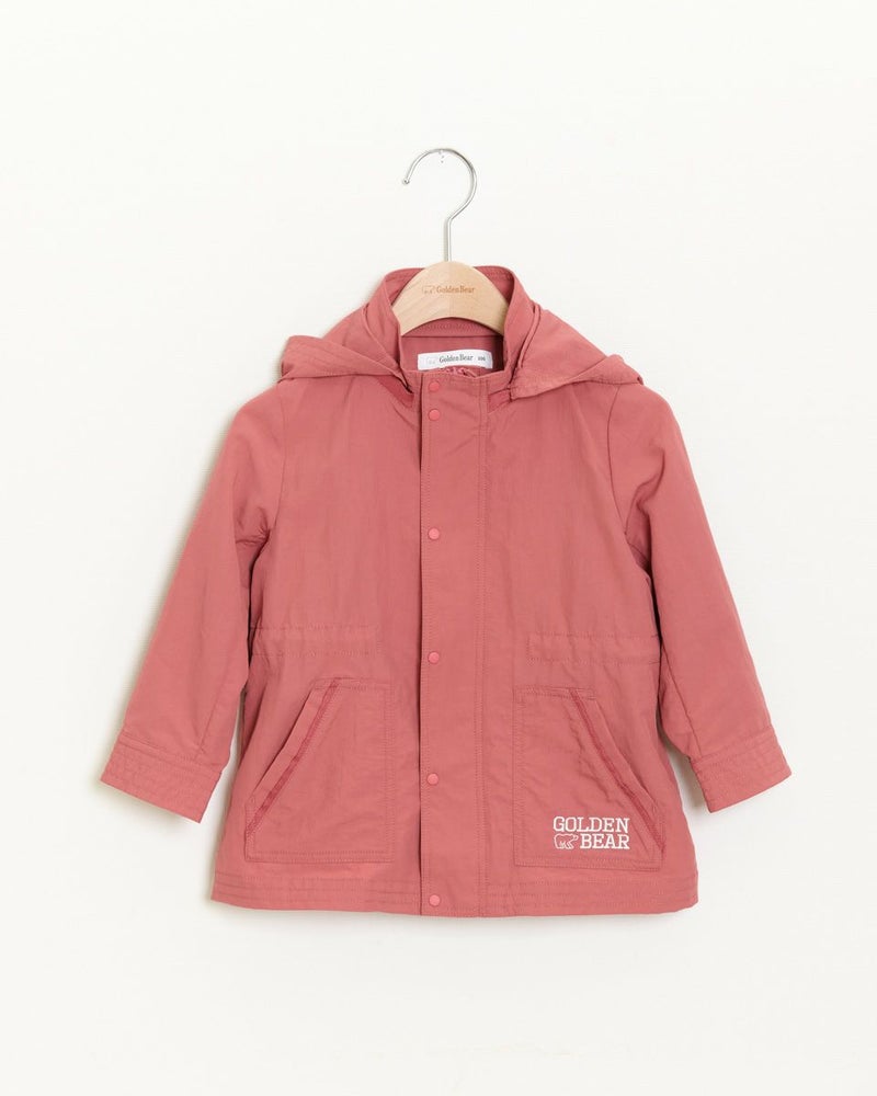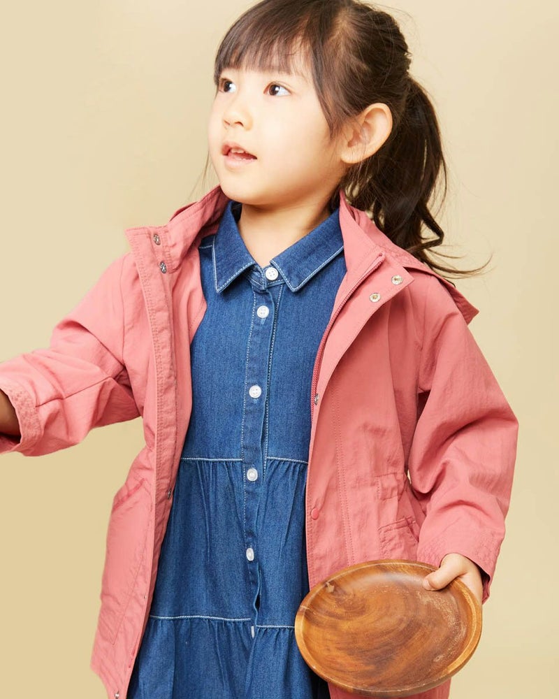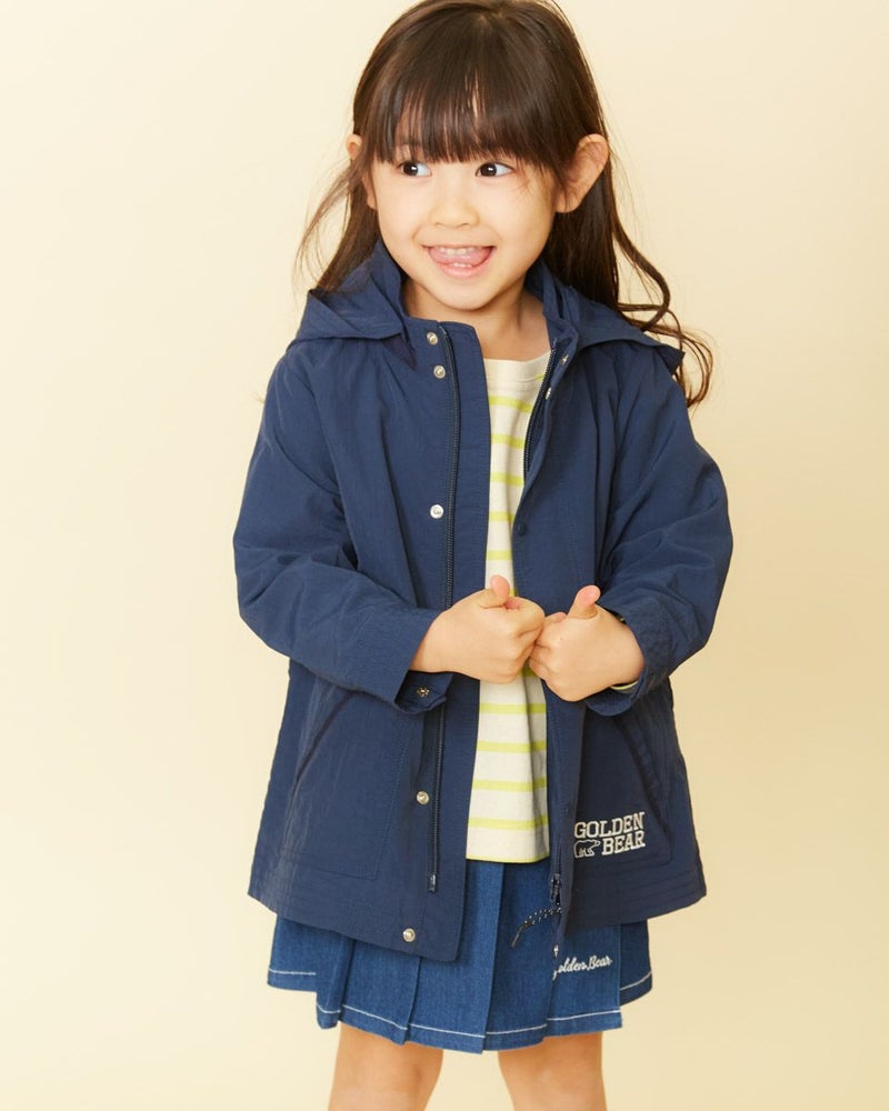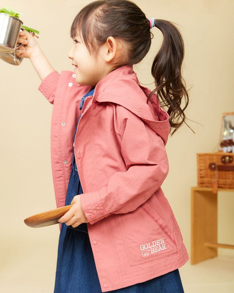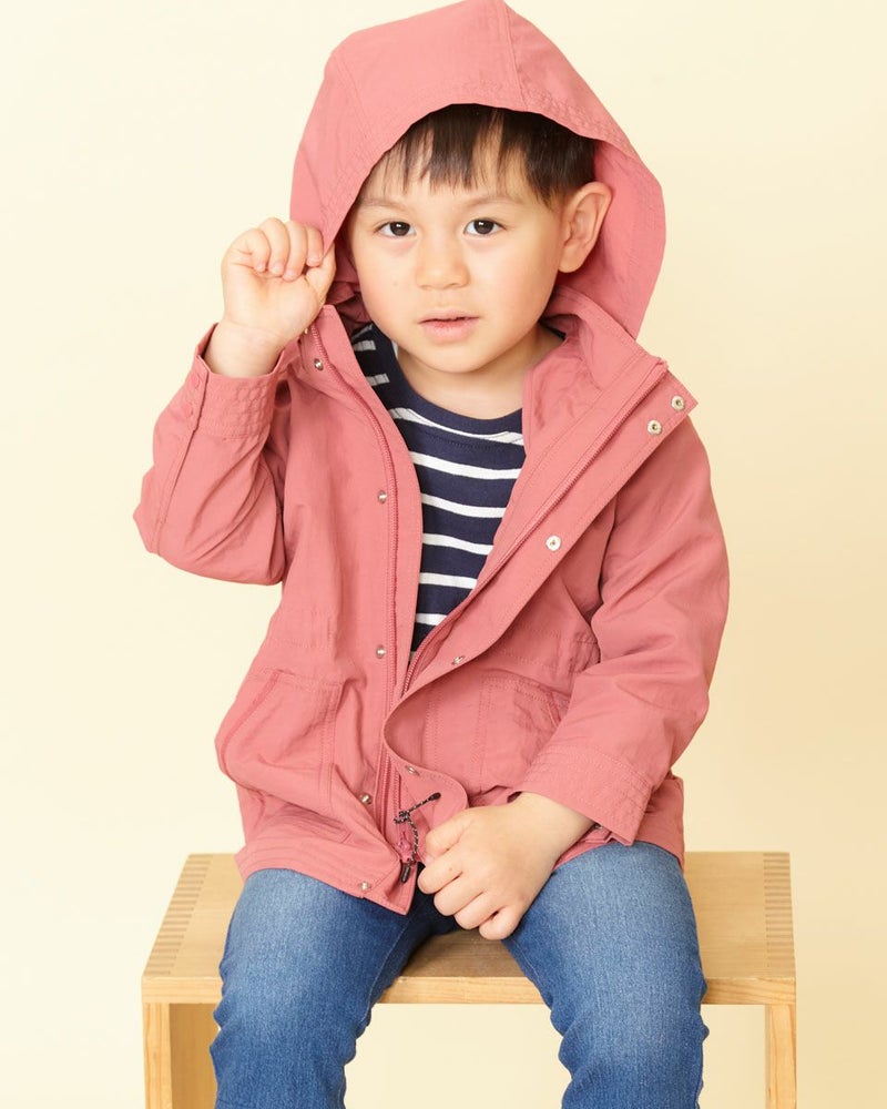 ナイロン100%素材に撥水加工をかけたマウンテンパーカです(裏無し)。前中心はファスナーとドット釦開き、フードはファスナーで取り外し可なので、保育園や幼稚園でも使えるのが嬉しいですね♪襟元とポケット口のテープ使いや、左ポケットにブランドロゴの刺繍がポイントに。ウエスト(内側)にアジャストがあり、お好みで絞ってギャザーをよせても可愛いですよ!家族のリンクコーディネートをお楽しみいただけます♪