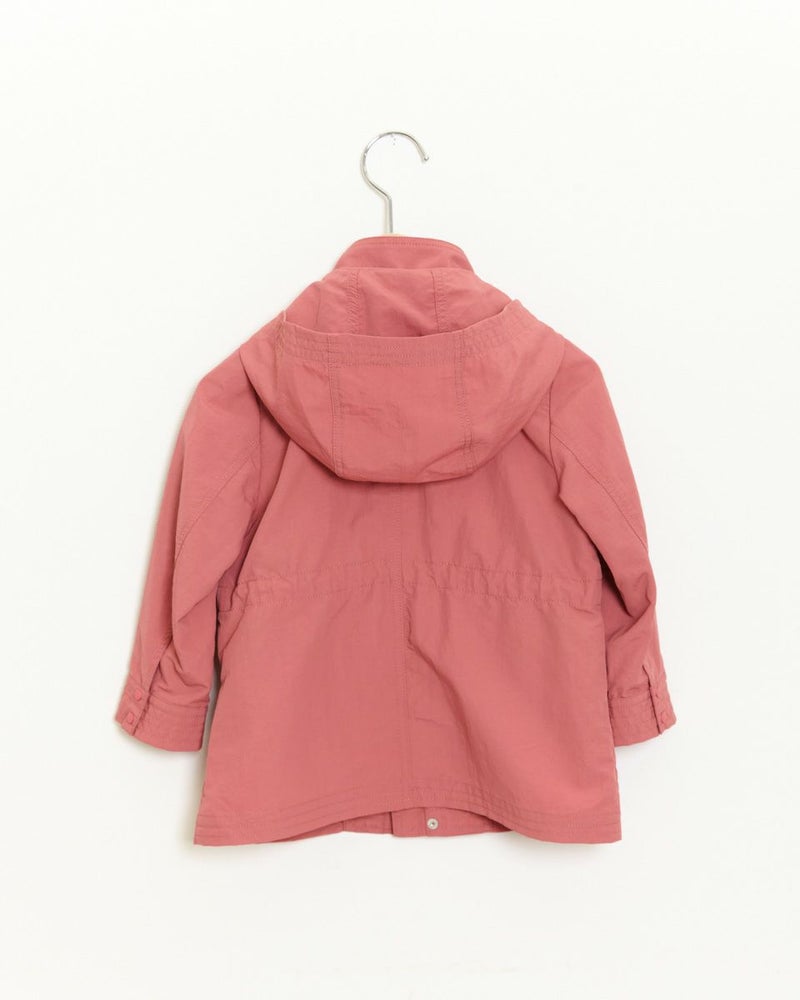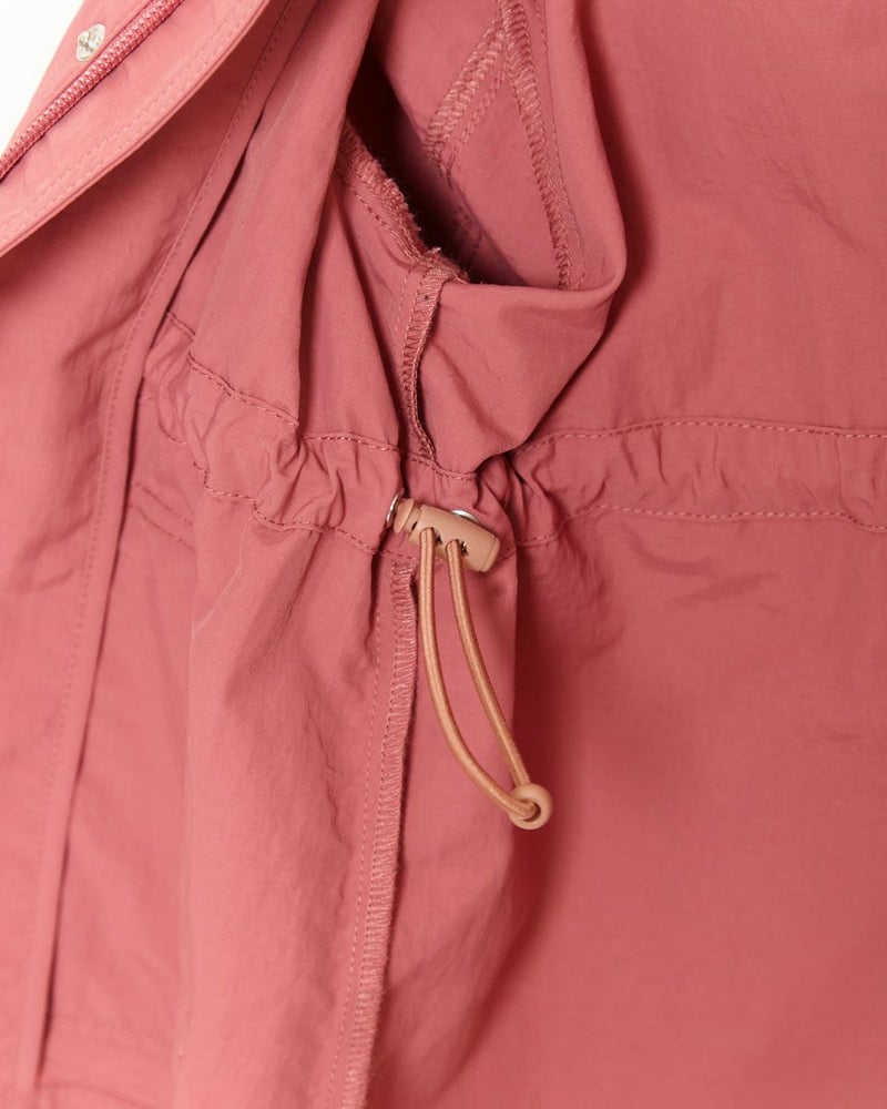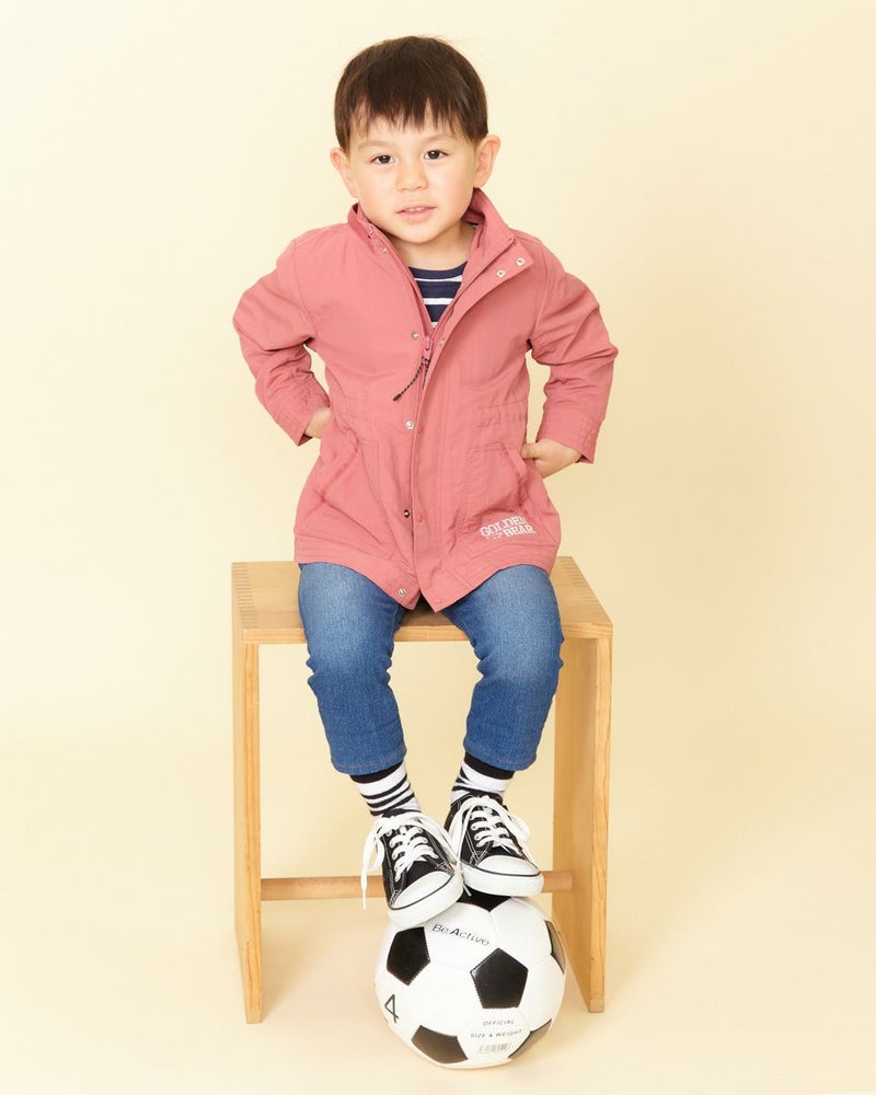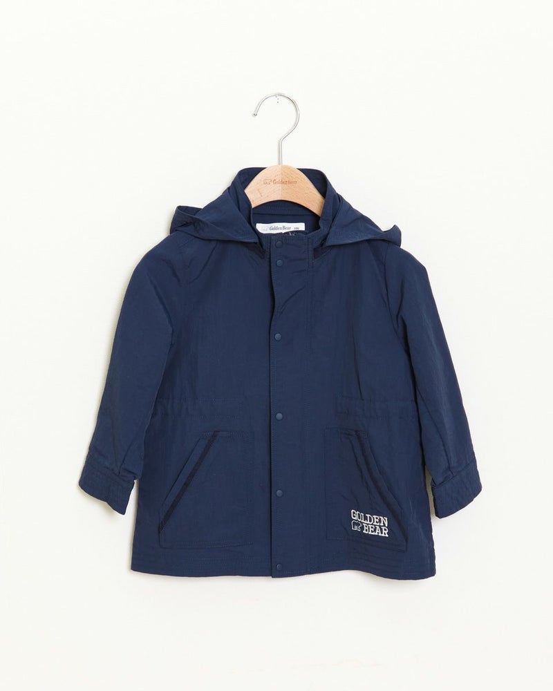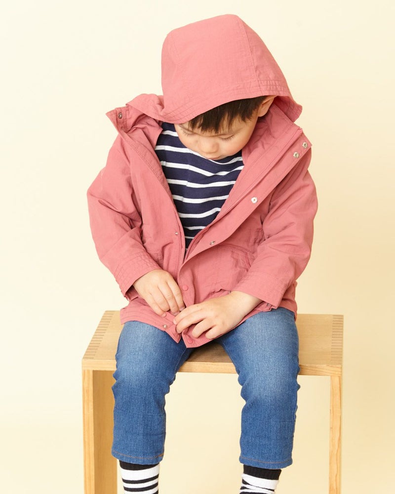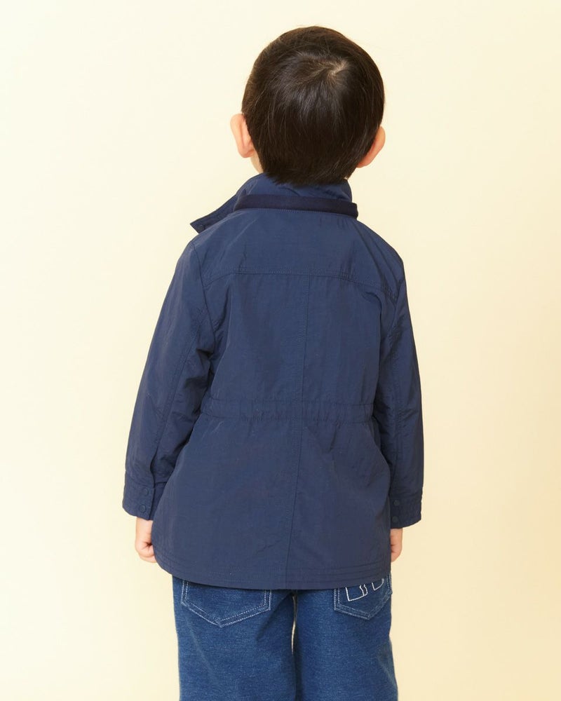 ナイロン100%素材に撥水加工をかけたマウンテンパーカです(裏無し)。前中心はファスナーとドット釦開き、フードはファスナーで取り外し可なので、保育園や幼稚園でも使えるのが嬉しいですね♪襟元とポケット口のテープ使いや、左ポケットにブランドロゴの刺繍がポイントに。ウエスト(内側)にアジャストがあり、お好みで絞ってギャザーをよせても可愛いですよ!家族のリンクコーディネートをお楽しみいただけます♪