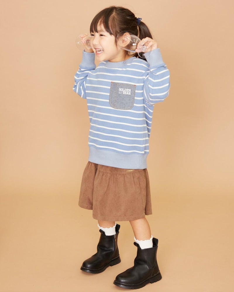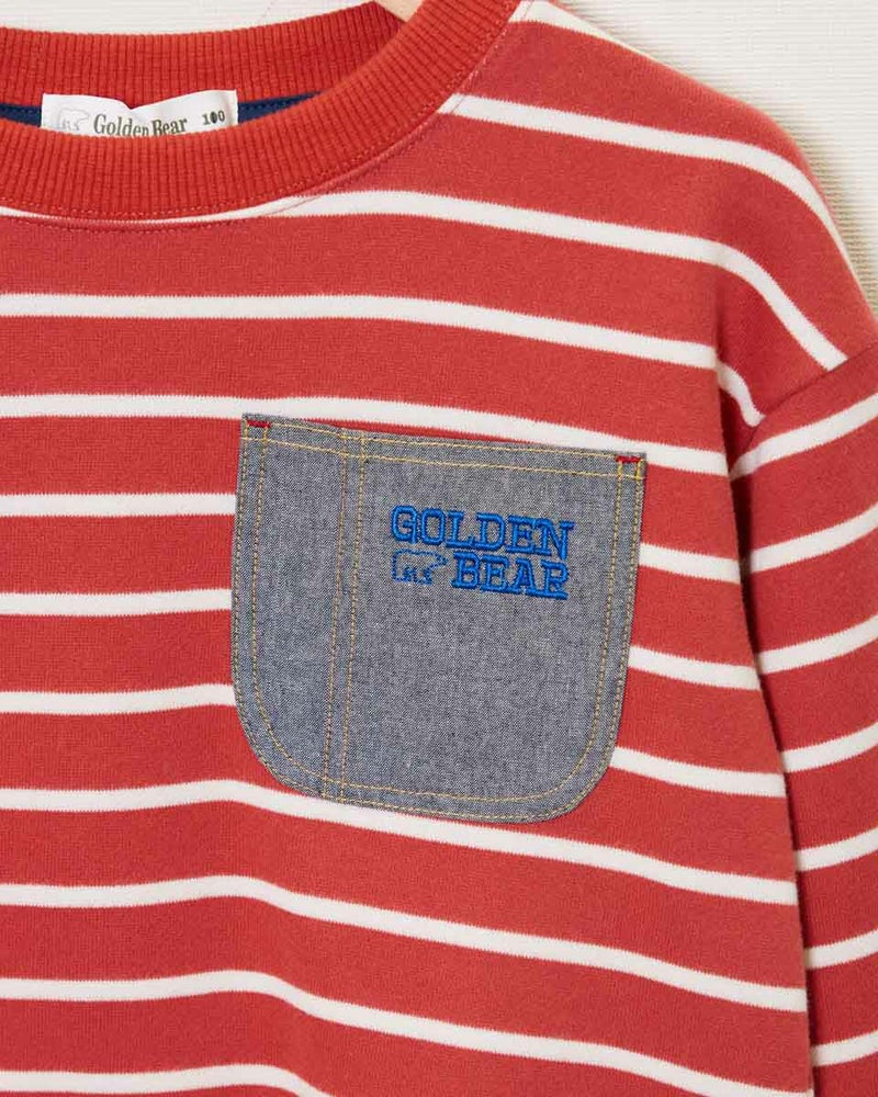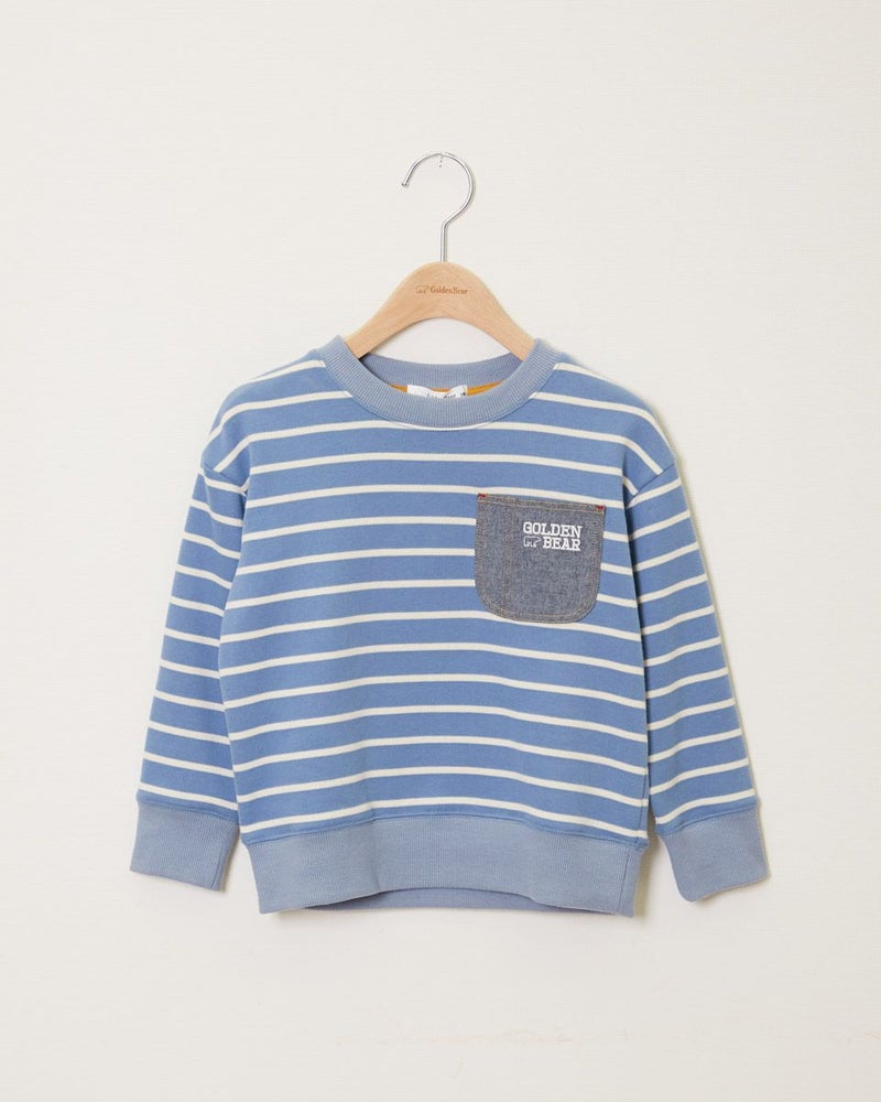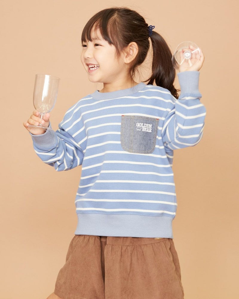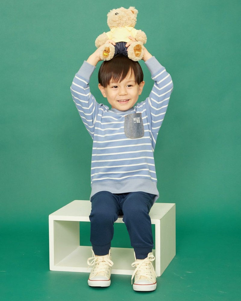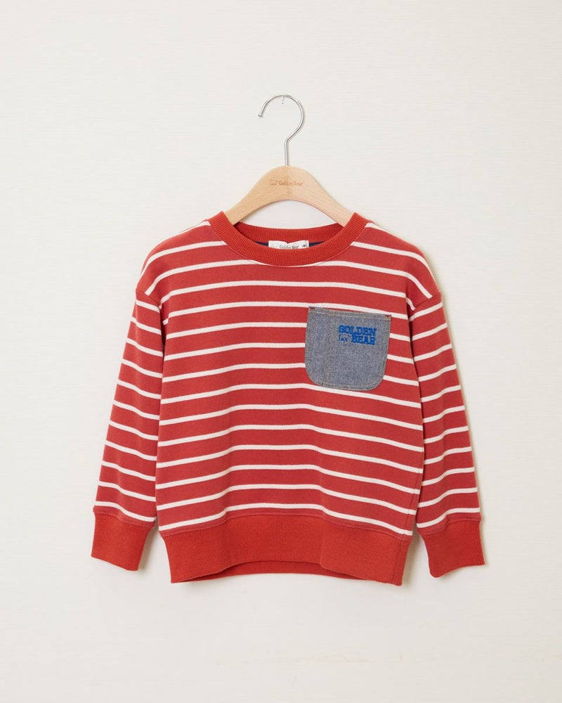 表面が柔らかい質感のボーダースウェットです。 爽やかなブルーとメリハリの効いたレッドの2色展開。 胸元には布帛の別布素材を用いたポケットがついていて、GBのアイコンであるベアとロゴの刺繍入り。