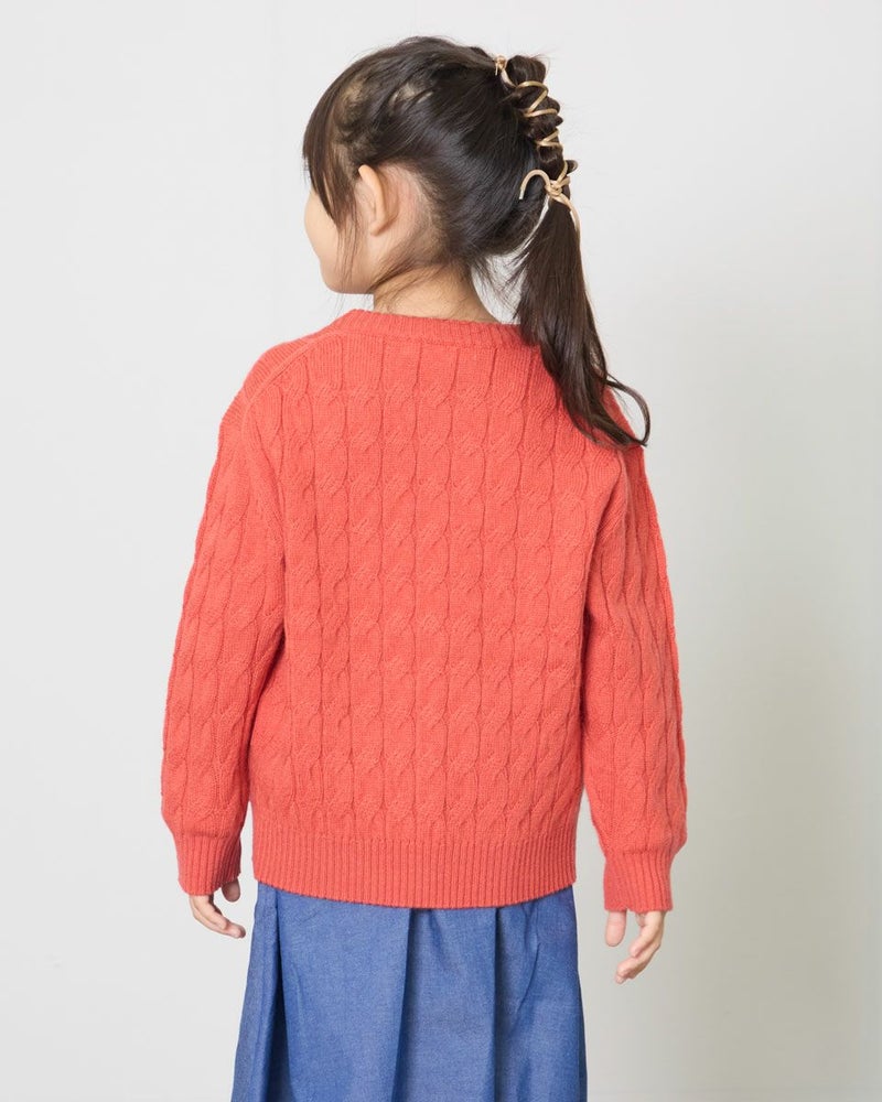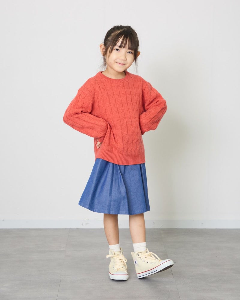昨年末に孫へのクリスマスプレゼントに購入しました。 デニムに合わせましたが、色も綺麗なレッドで、とても可愛いニットでした。 孫も可愛いと気に入って、着ております。 何度か洗濯しましたが、毛玉もできていないし、購入して良かったと思います。