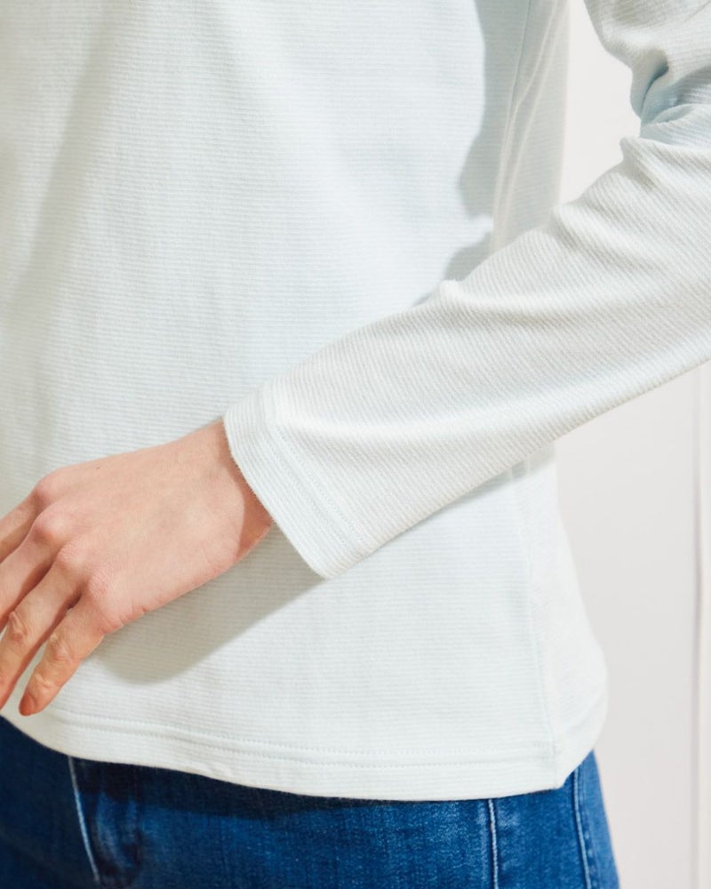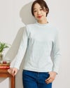 薄手のテレコ素材で作ったハイネックのトップス。軽くて薄いので季節の変わり目のインナーにおすすめ。顔まわりを明るく見せてくれるカラーがコーディネートのポイントになってくれます。