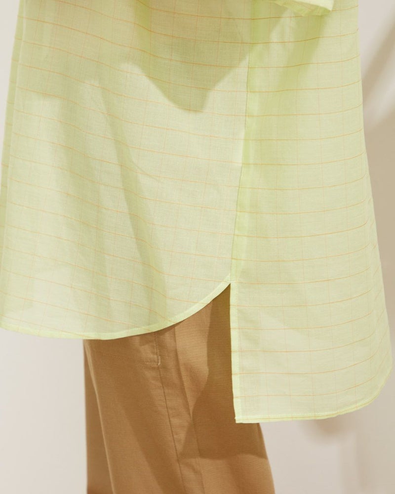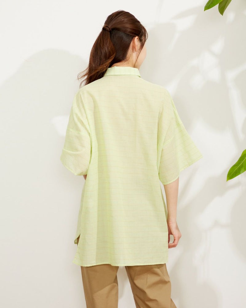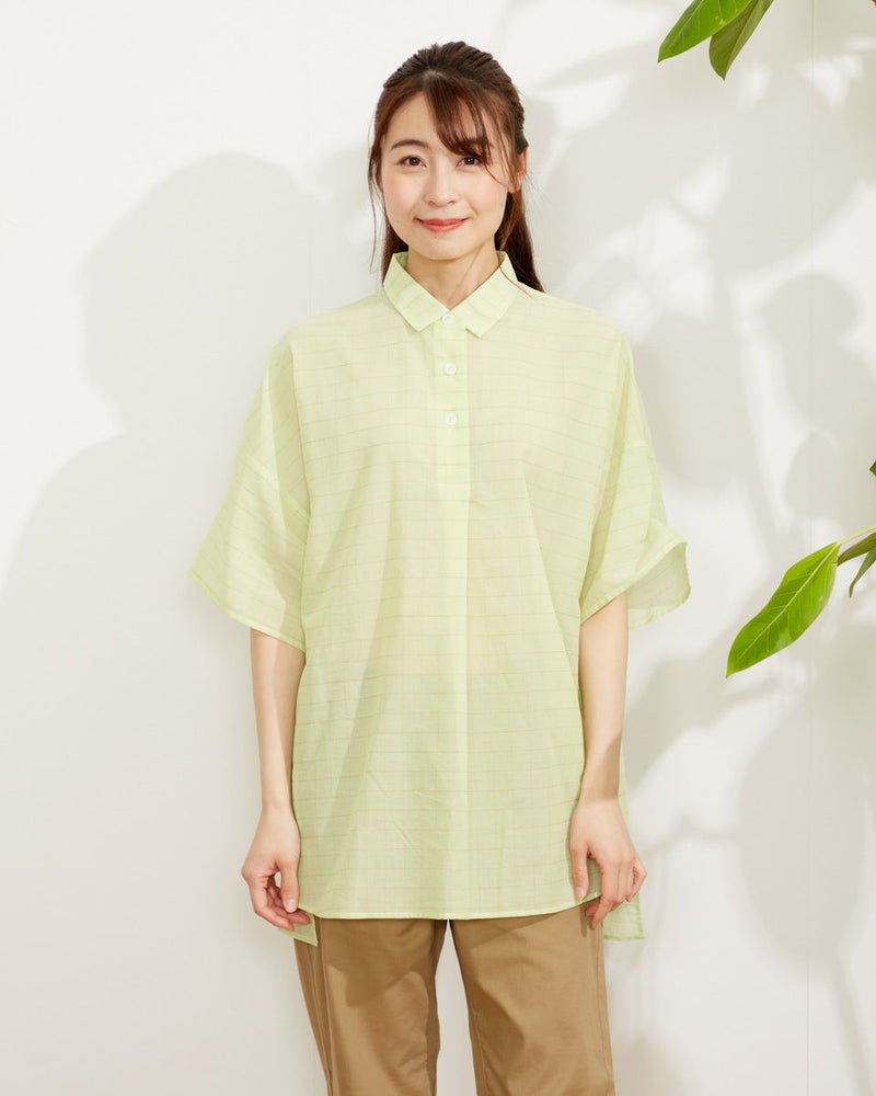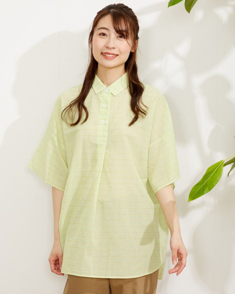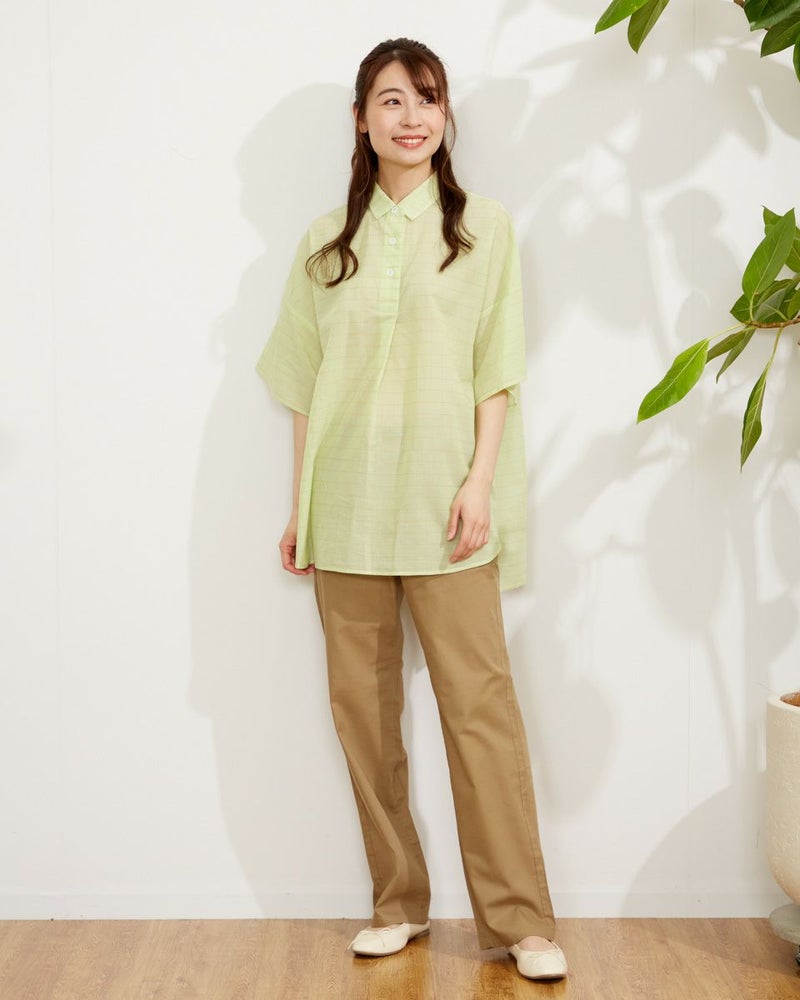 ウィンドウペンのチェック柄がクラシックなチュニックブラウス。ゆったりしたシルエットのドロップショルダーデザイン。肘までかくれる五分袖、腰回りまでカバーしてくれる75cm丈が、パサっと着れる気軽さが便利な一枚です。