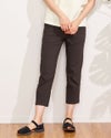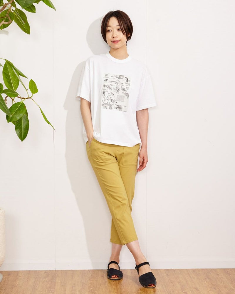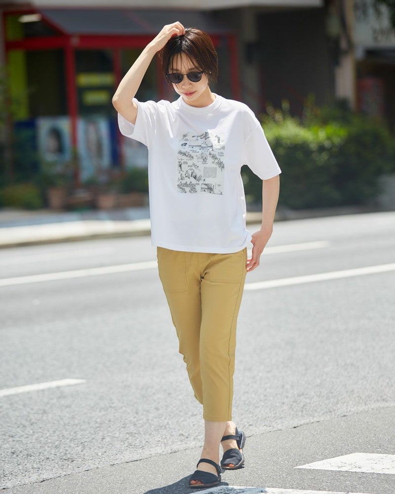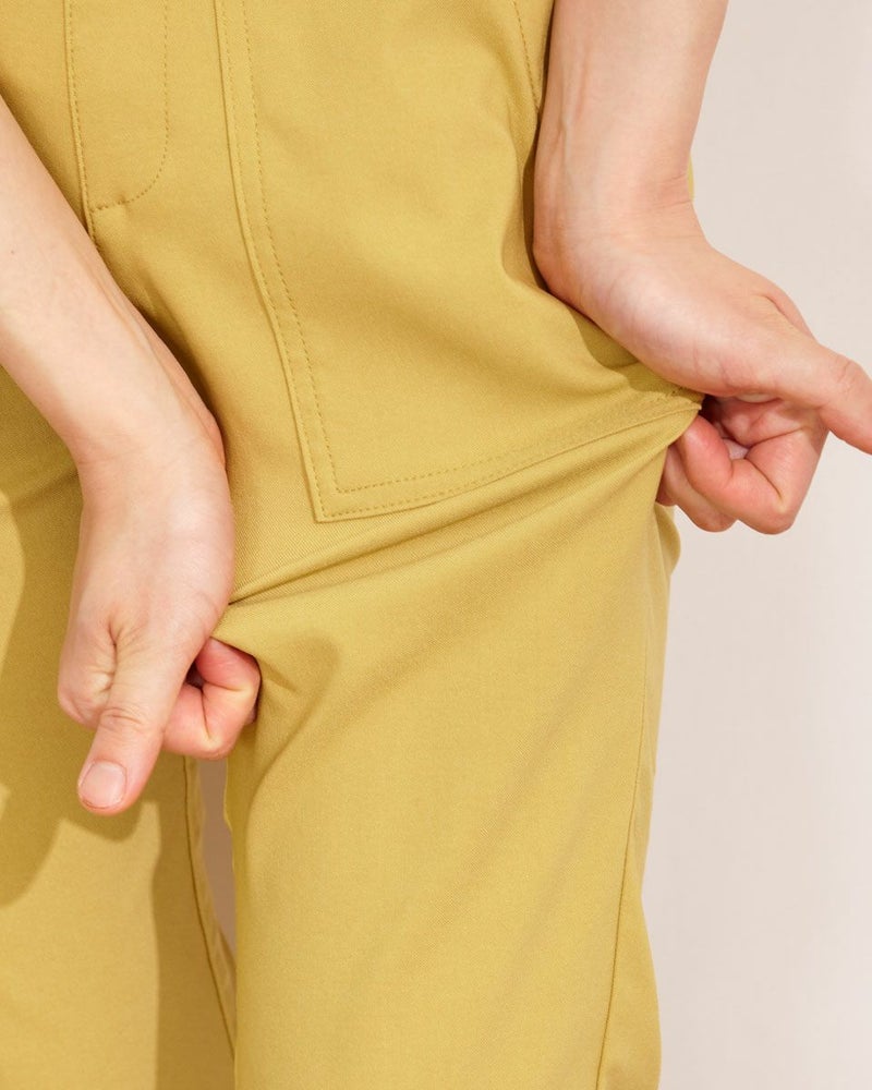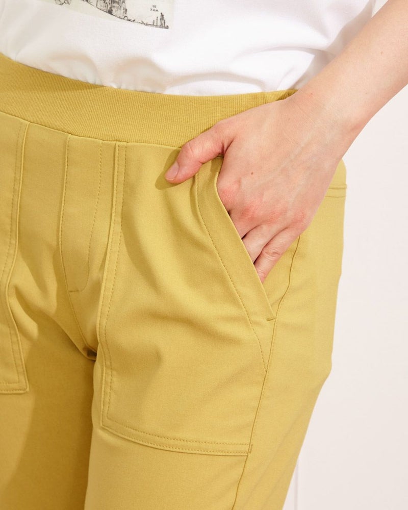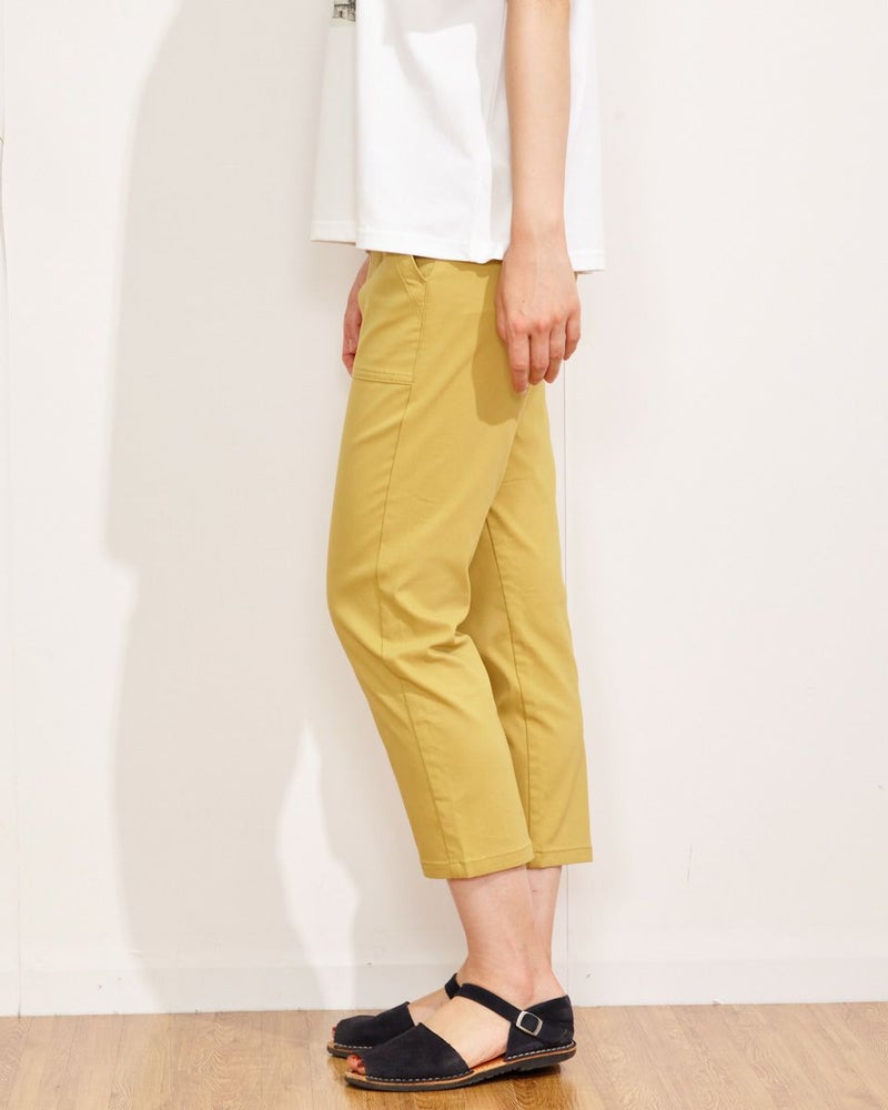 ひんやりした肌触りが特徴のテーパードクロプトパンツです。すっきりシルエットなのにお腹がゴム仕様で立ったり座ったりが楽にこなせます。貼りポケットのデザインが今年らしくておすすめのポイントです。