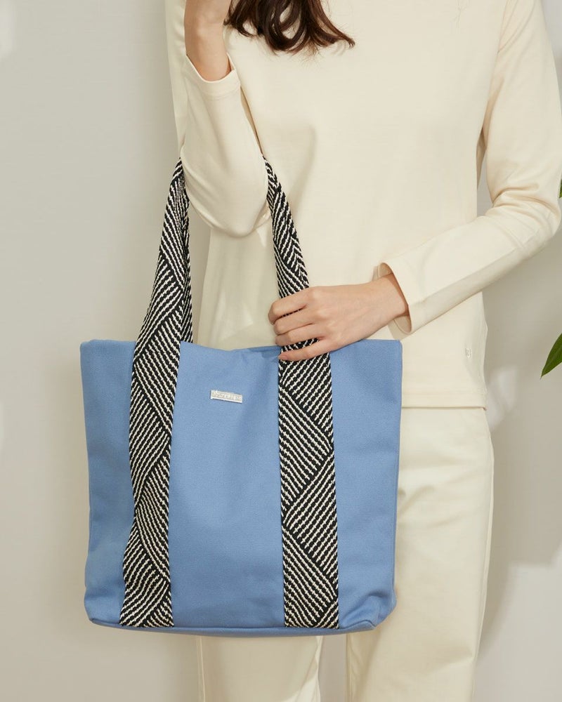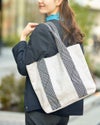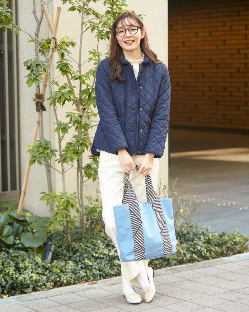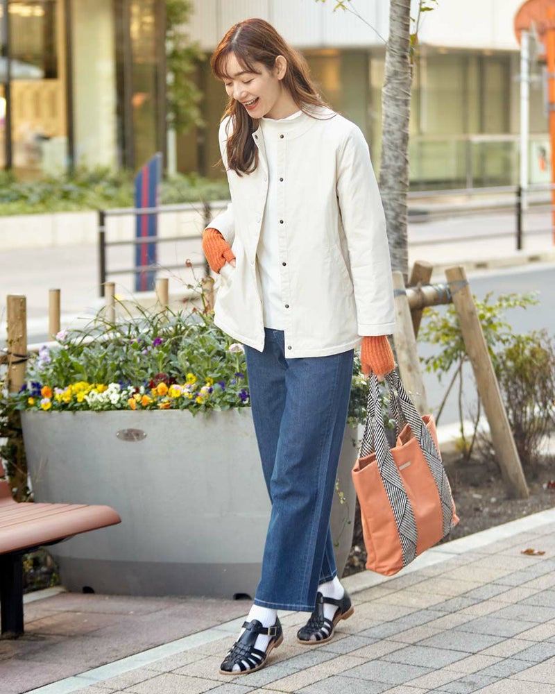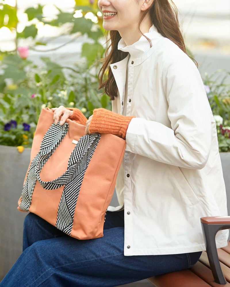 帆布に柄の入ったデザインテープをハンドルに使用したトートバッグ。トートですが大きすぎず使いやすいサイズ感を目指しました。 Golden Bear WOMEN アクセサリ (WOMEN) 【着用アイテム】467Q1402 テレコハイネックTシャツ 467Q1701 ブーツカットデニム 467Q1703 ストレートパンツ 467Q1102 中綿ジャケット