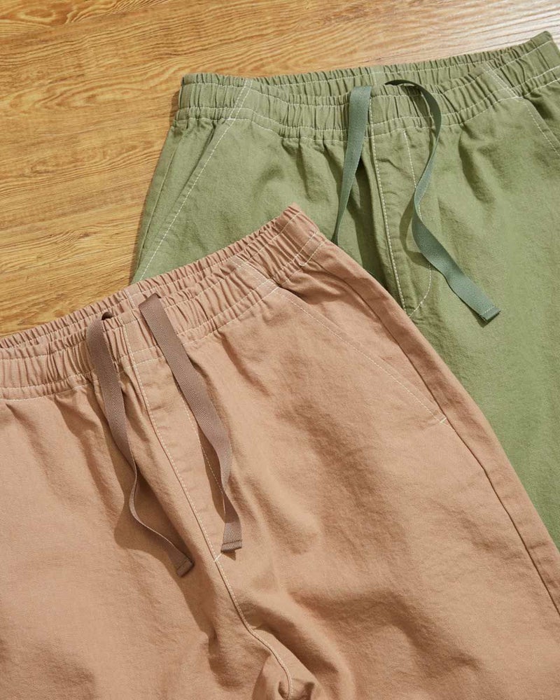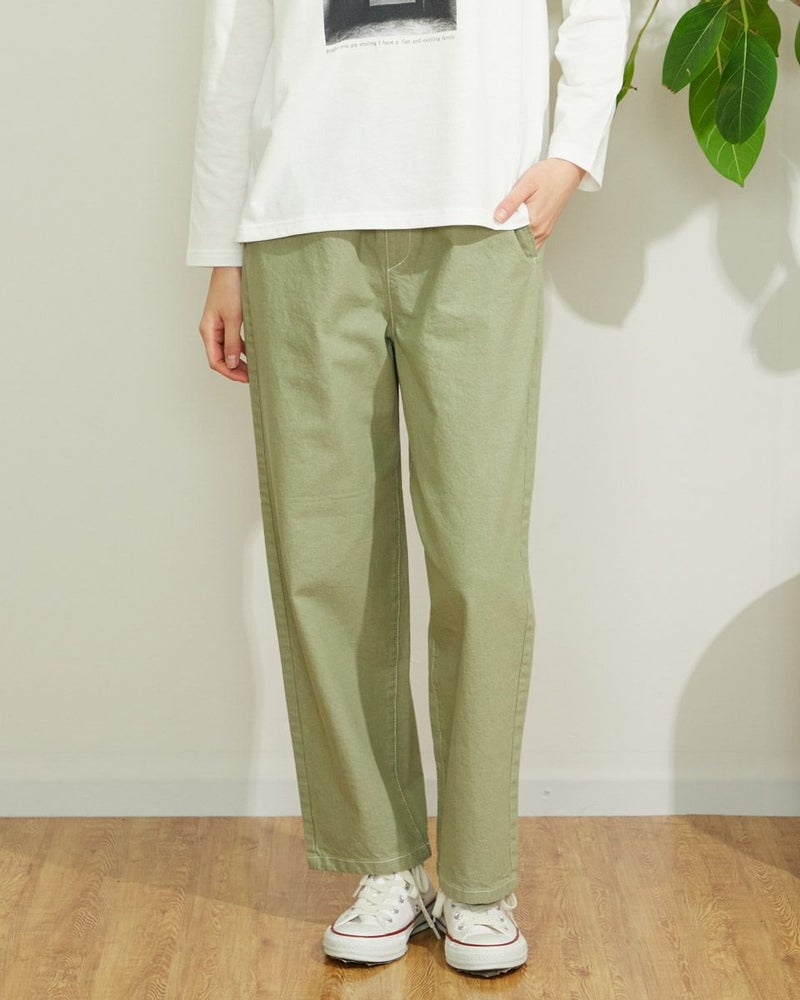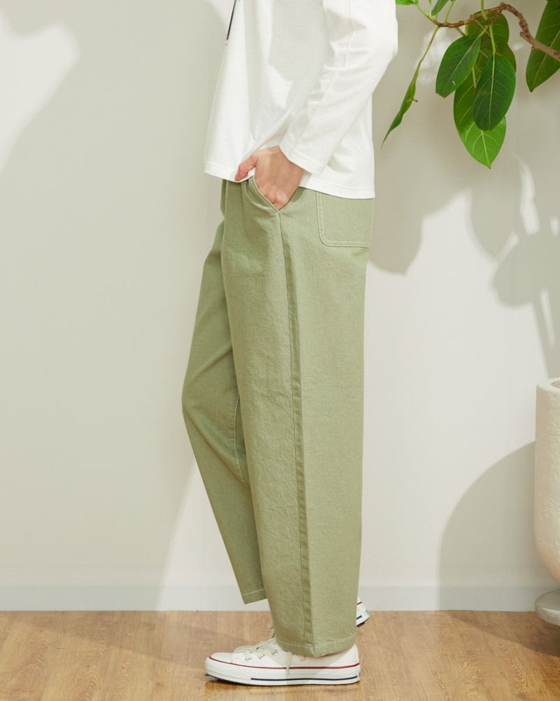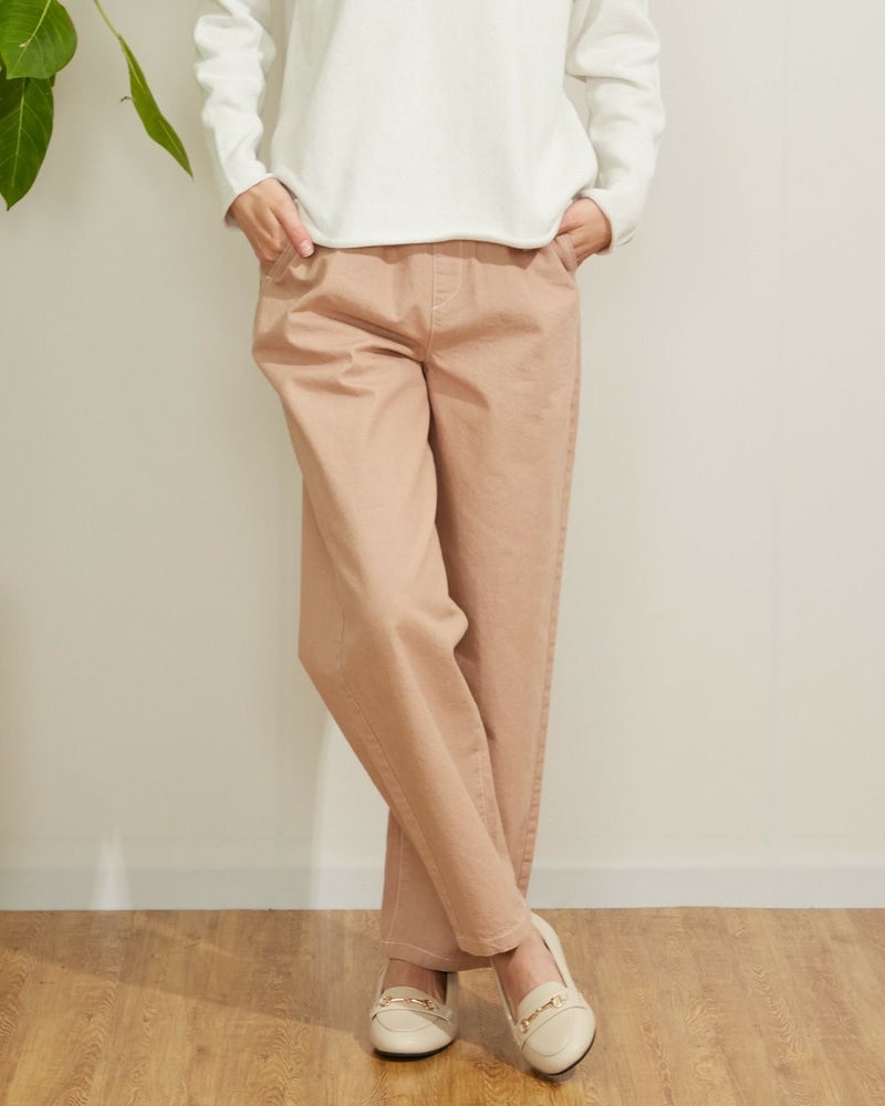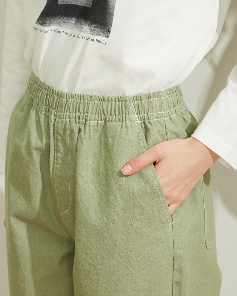 綿100%のツイルを使用したアンクル丈のストレートパンツです。ストレッチの入っていない素材ですので、30cmの深い股上で、ヒップから裾にかけて全体にゆったりとした分量をとっています。ウエストは開き無しのギャザーゴム仕様で内側に紐を通しています。