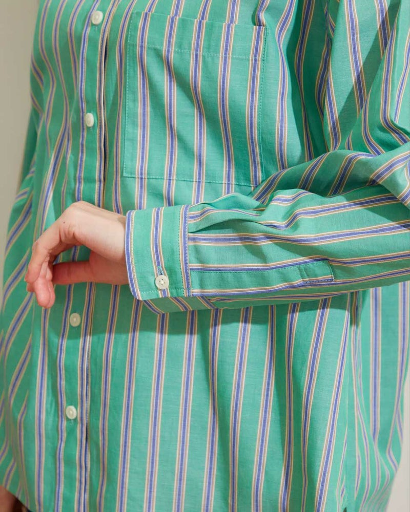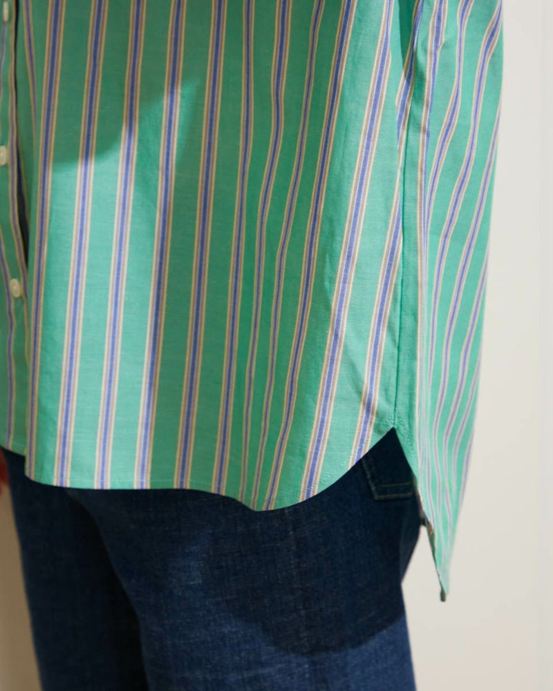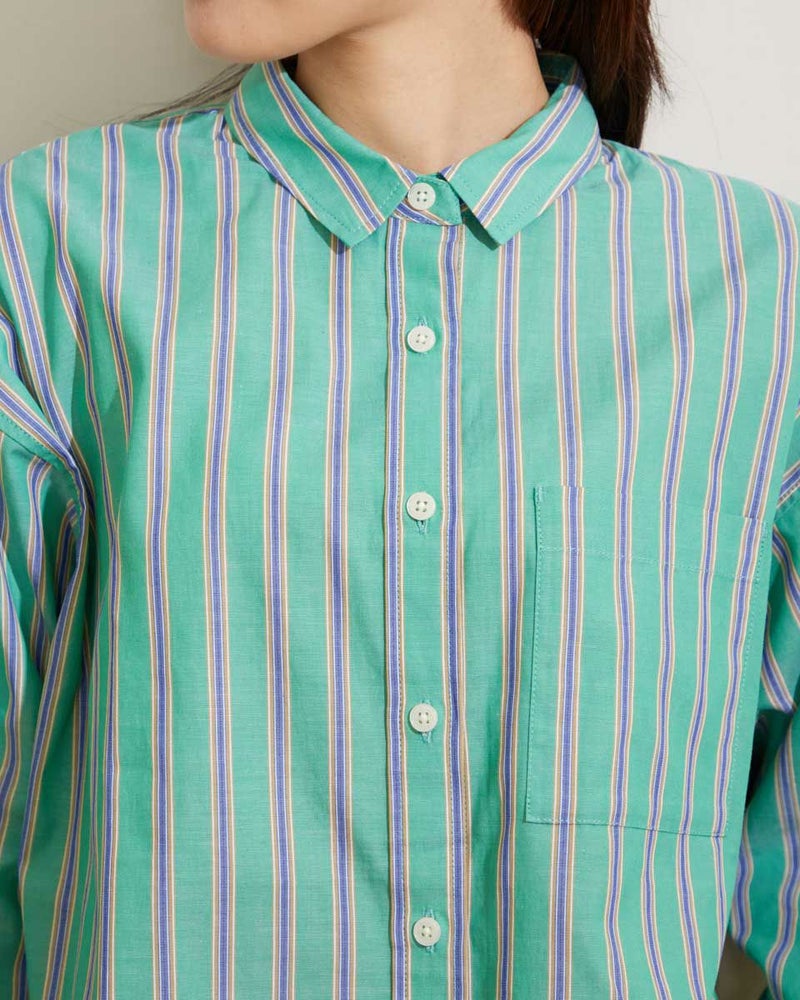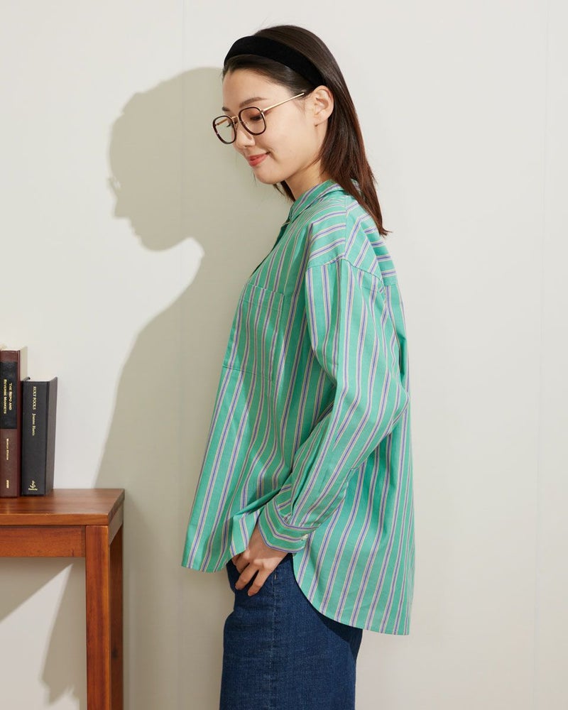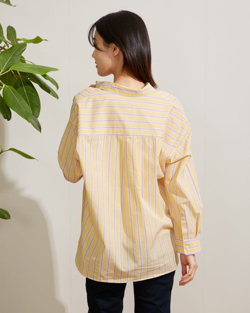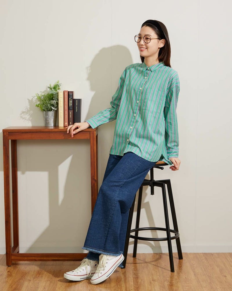 気分を高めてくれるカラーリングのストライプシャツです。定番シャツをベースに、身頃にゆとりを持たせアウトにしてもバランスよく着こなせる着丈感です。1枚で着映えするおすすめアイテムです。 モデル身長: 166 cm 着用サイズ: M サイズ Golden Bear WOMEN ブラウス (WOMEN) 【着用アイテム】467Q3405 タンクトップ 467Q3701 ワイドデニム 467Q3703 テーパードパンツ
