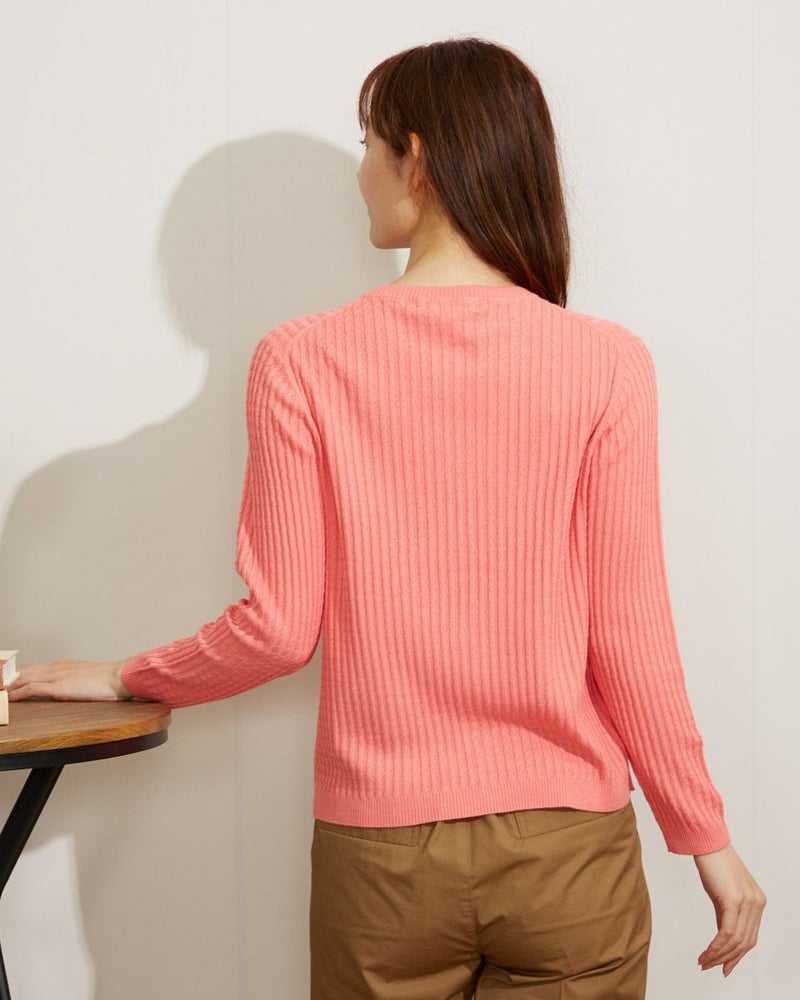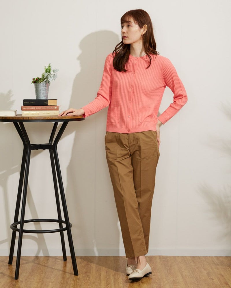 レーヨン混の滑らかな肌触りのいい糸を使用したケーブルカーディガンです。カジュアルな中にも上品さのある1枚。華やいだカラーでコーディネートのアクセントに。