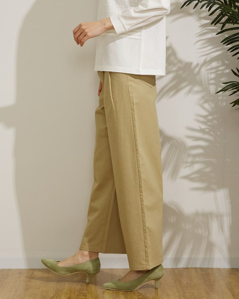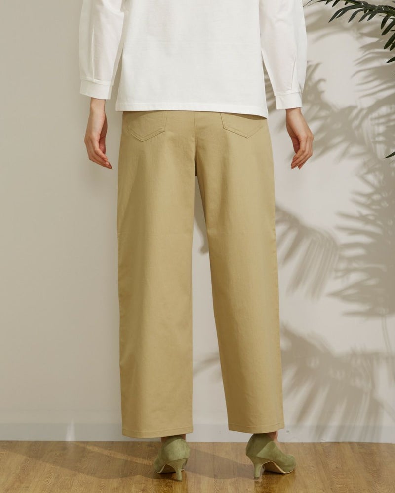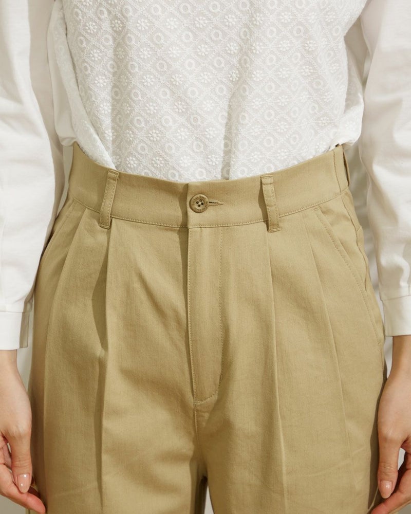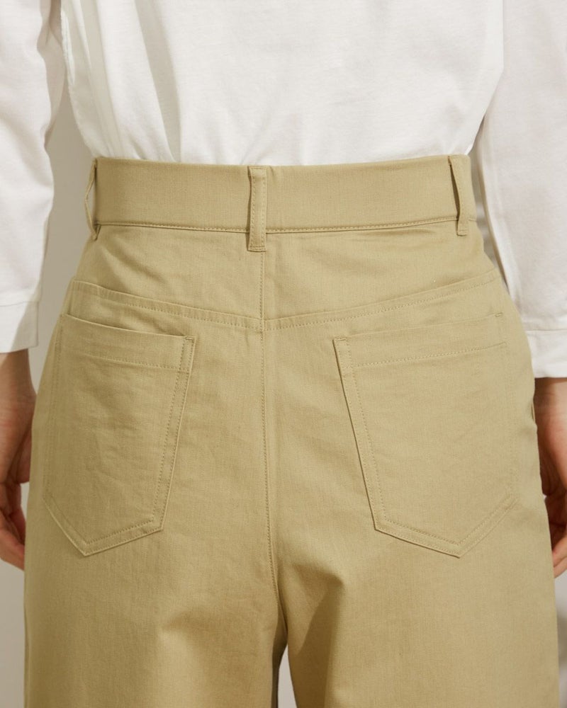 麻レーヨンを使用した横方向にストレッチのある素材です。前身にタックを2本づつ入れ、ヒップから裾にかけて全体にゆとりのある太目のストレートシルエットです。股上は深めにとっています。