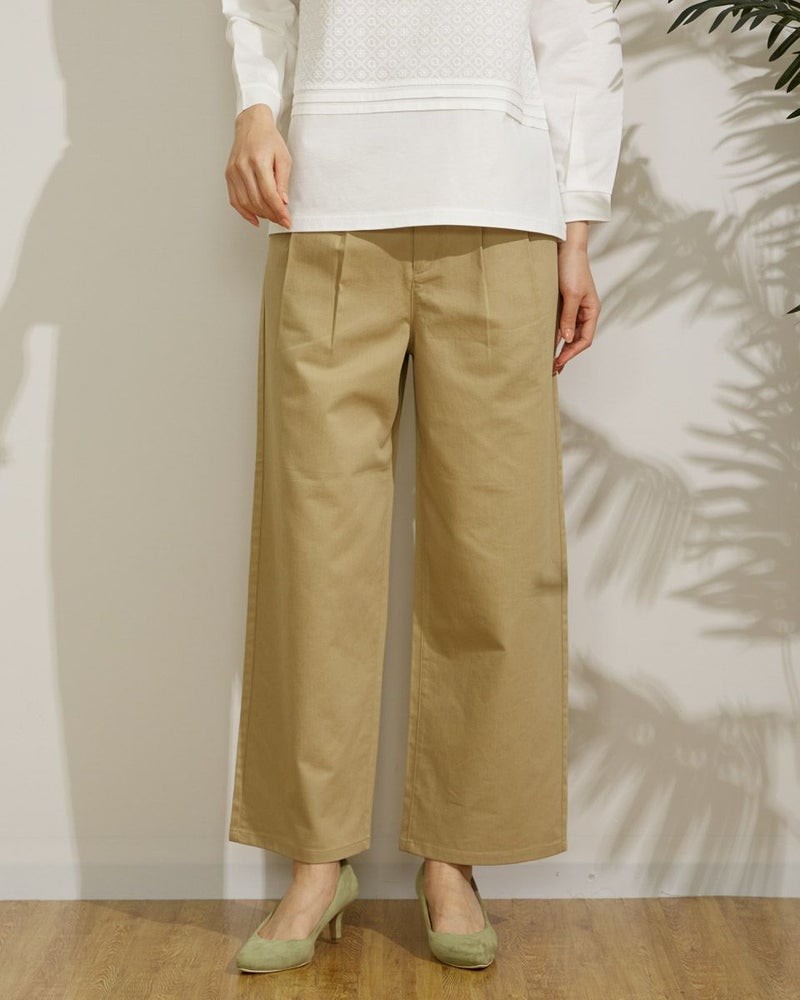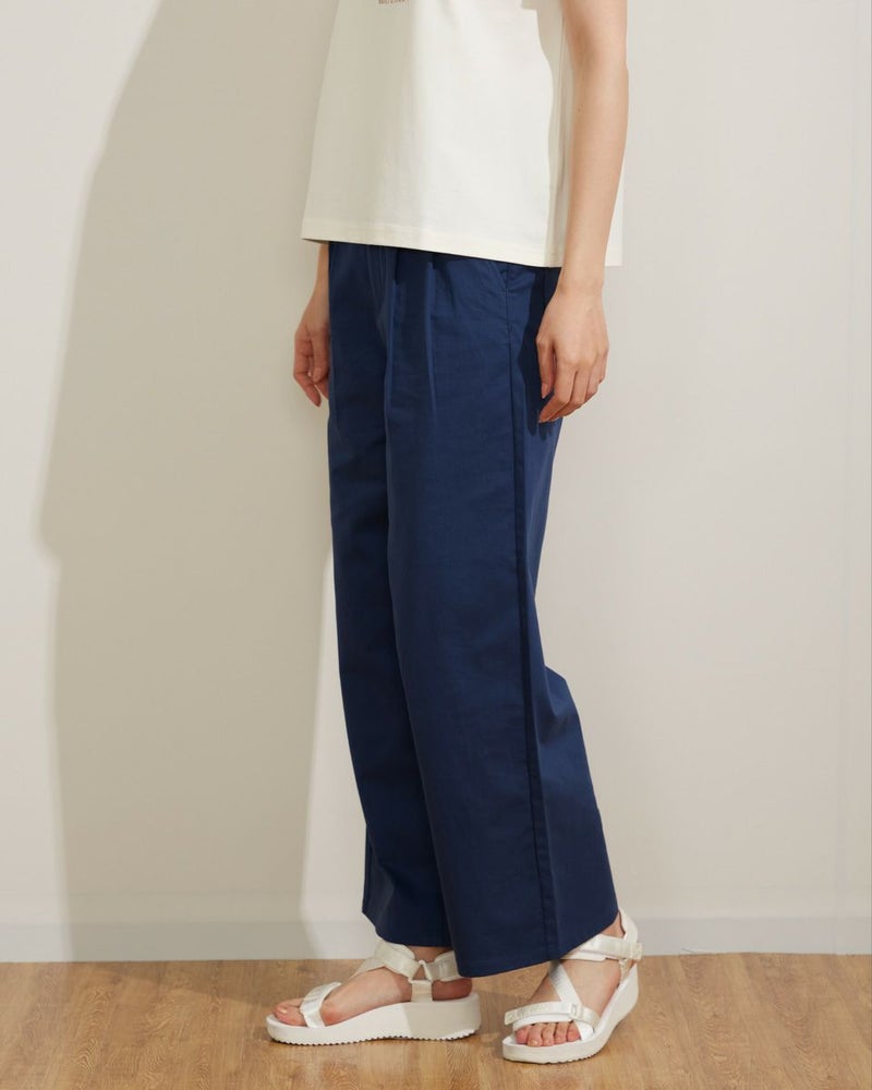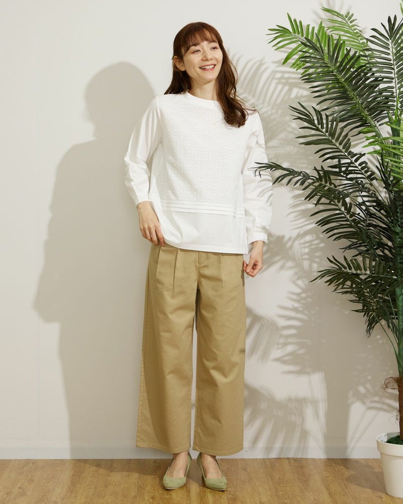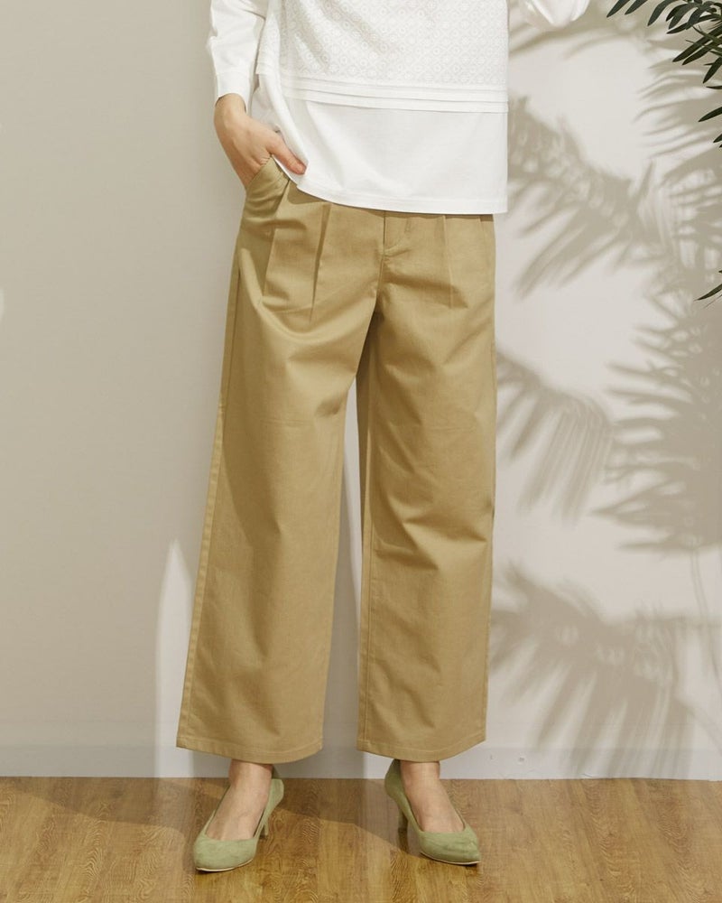 麻レーヨンを使用した横方向にストレッチのある素材です。前身にタックを2本づつ入れ、ヒップから裾にかけて全体にゆとりのある太目のストレートシルエットです。股上は深めにとっています。
