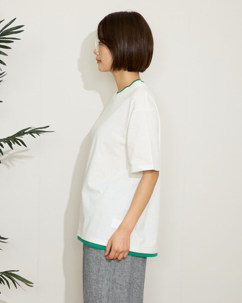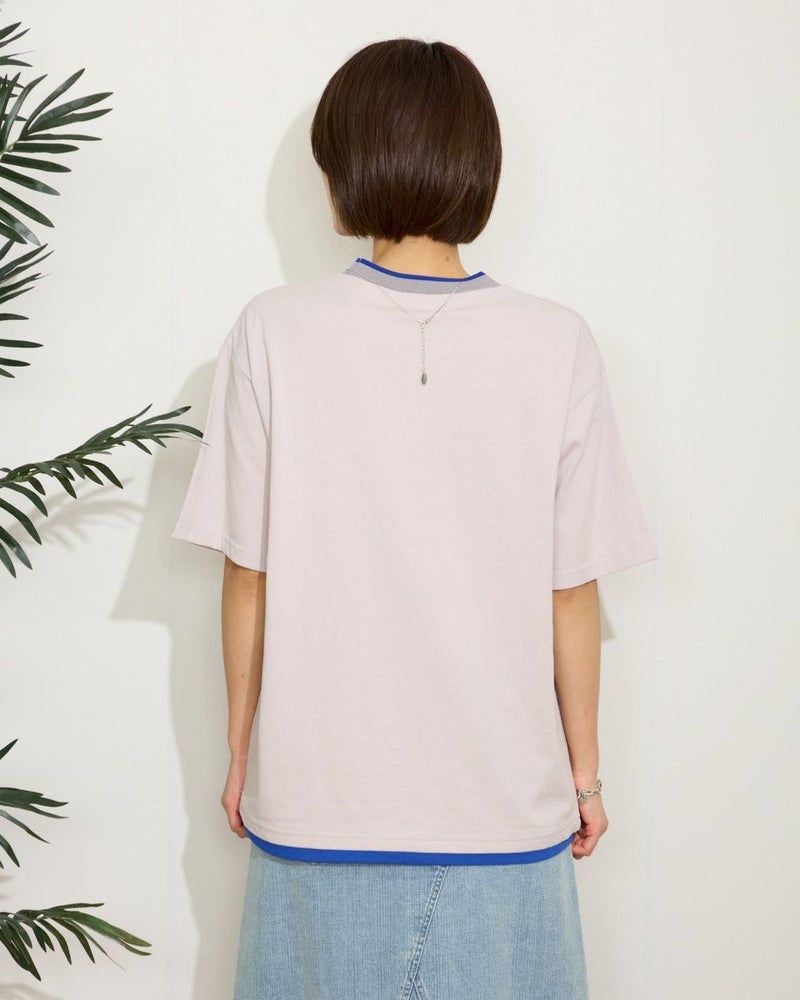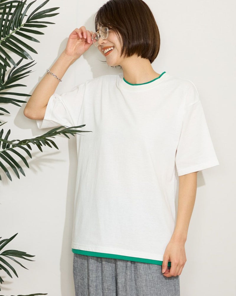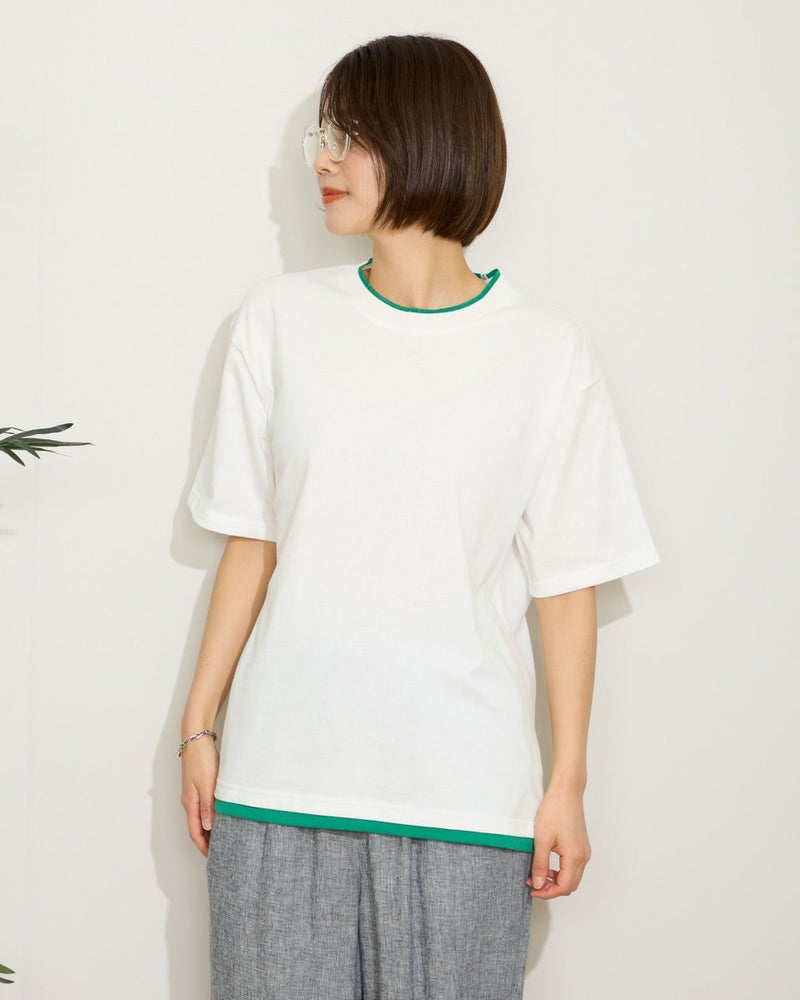 配色カラーのラインが入った襟のリブとレイヤード風の裾切り替えがポイントのTシャツ。