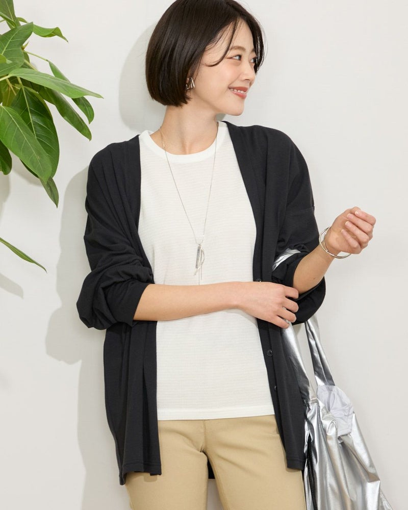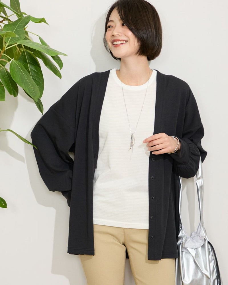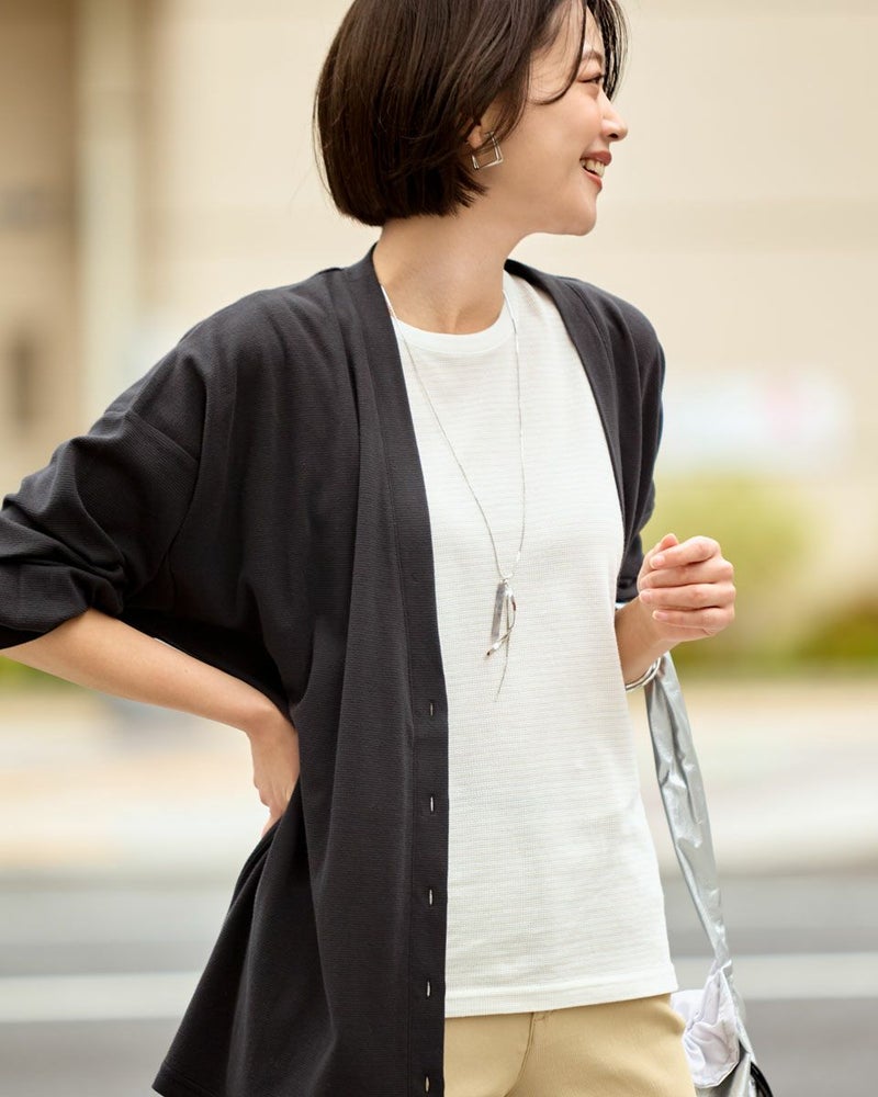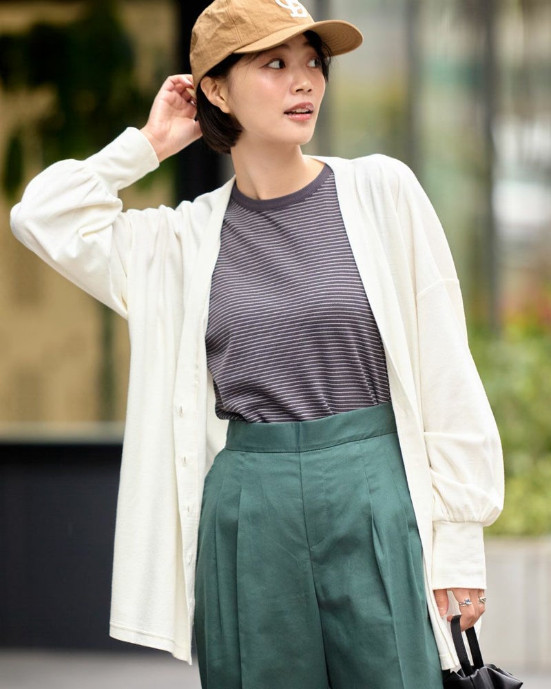 ソフトなタッチのホカケフライスを使用したカットソーのカーディガン。 お手入れが簡単で冷房対策や日除け、汗をかく時期にもお勧めです。コーディネートを邪魔しないオフ白と黒のベーシックな2色展開です。 モデル身長: 167 cm 着用サイズ: M サイズ Golden Bear WOMEN カットソー (WOMEN) 【着用アイテム】467Q4412 ボーダータンクトップ 467Q4712 コードレーンテーパードパンツ 468Q3751 ワイドパンツ