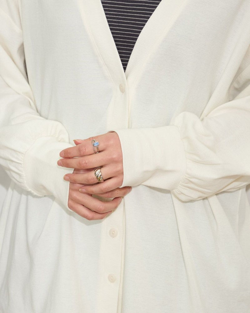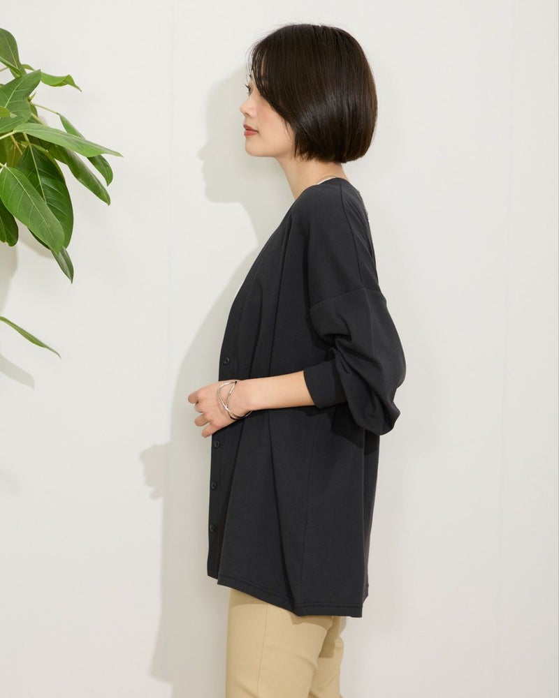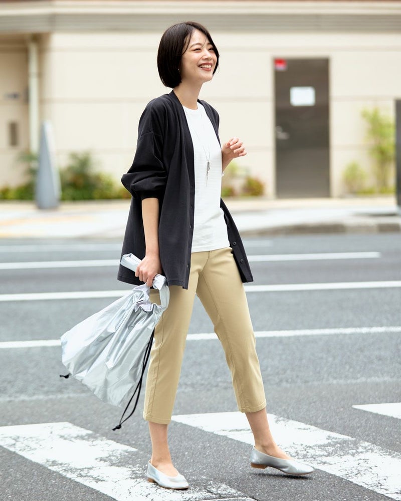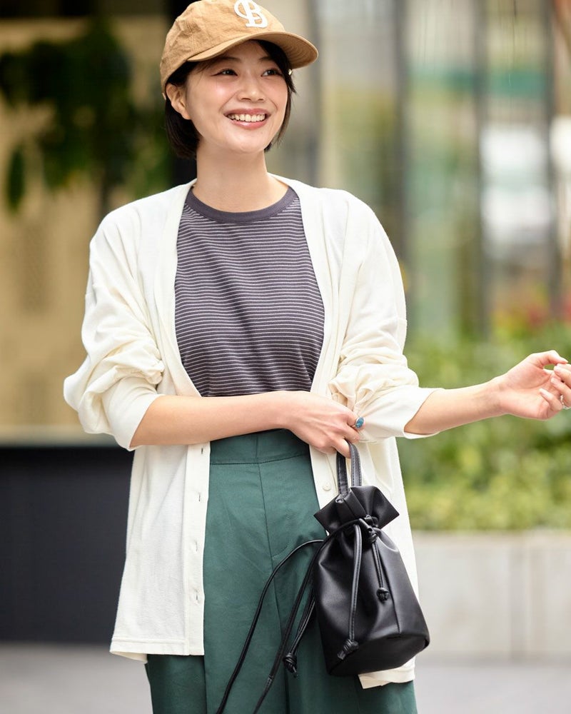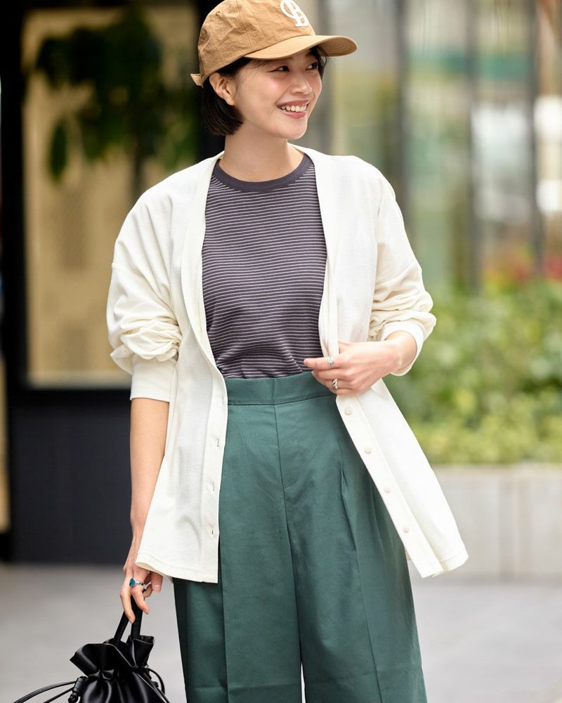 ソフトなタッチのホカケフライスを使用したカットソーのカーディガン。 お手入れが簡単で冷房対策や日除け、汗をかく時期にもお勧めです。コーディネートを邪魔しないオフ白と黒のベーシックな2色展開です。 モデル身長: 167 cm 着用サイズ: M サイズ Golden Bear WOMEN カットソー (WOMEN) 【着用アイテム】467Q4412 ボーダータンクトップ 467Q4712 コードレーンテーパードパンツ 468Q3751 ワイドパンツ