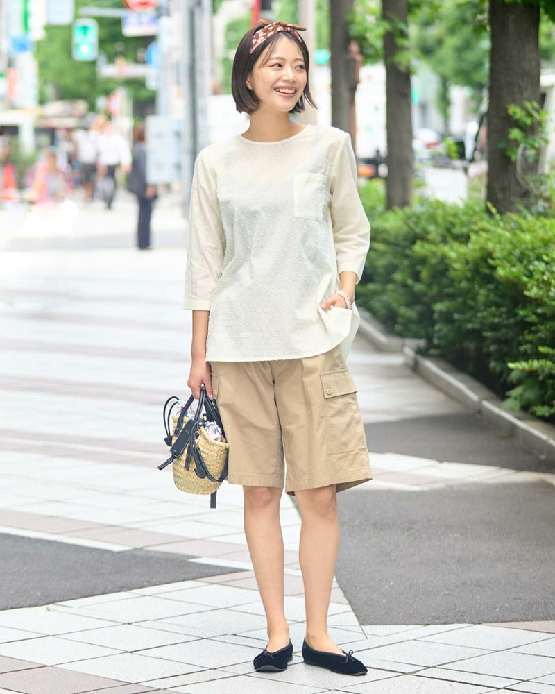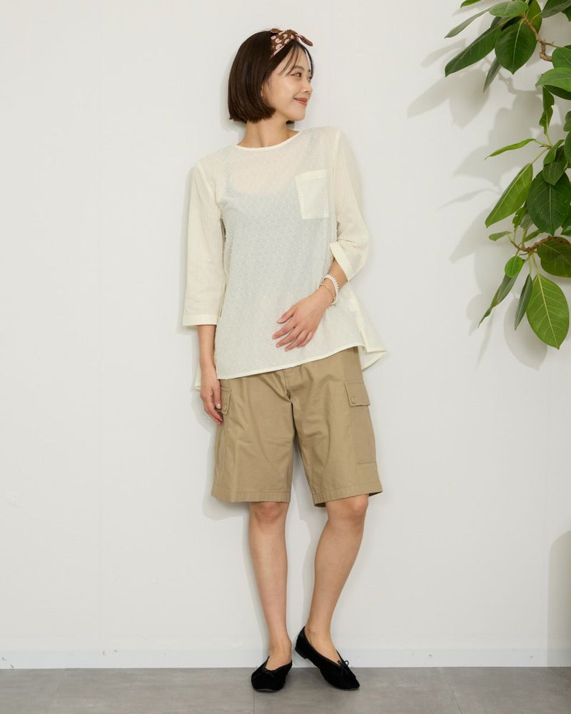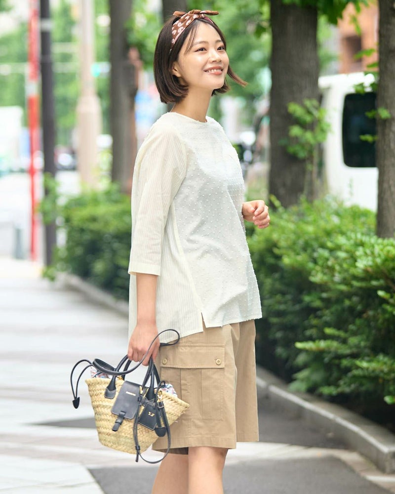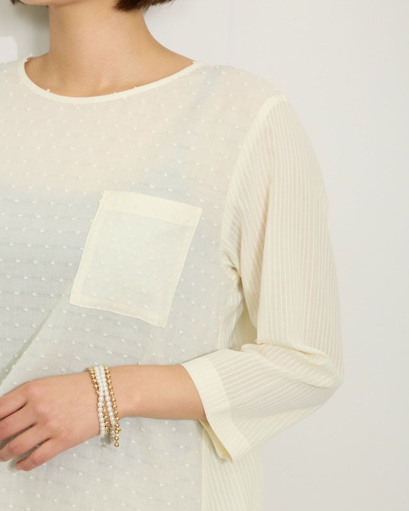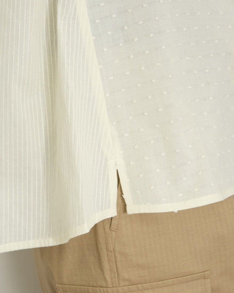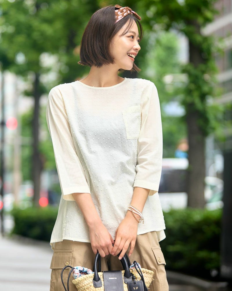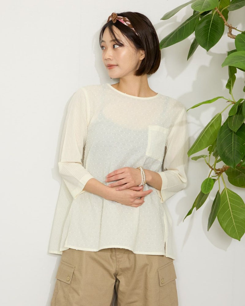 綿100%の水玉状にカットしたドビー素材と立体感の有るコードストライプを接ぎ合わせたブラウスです。