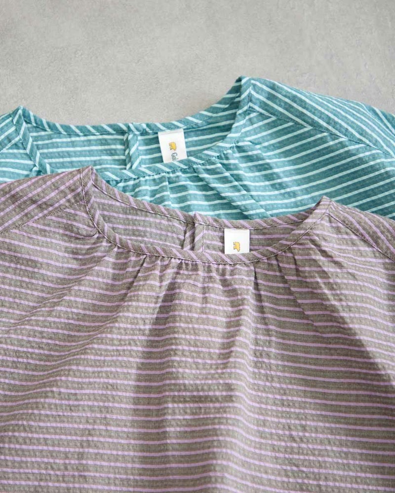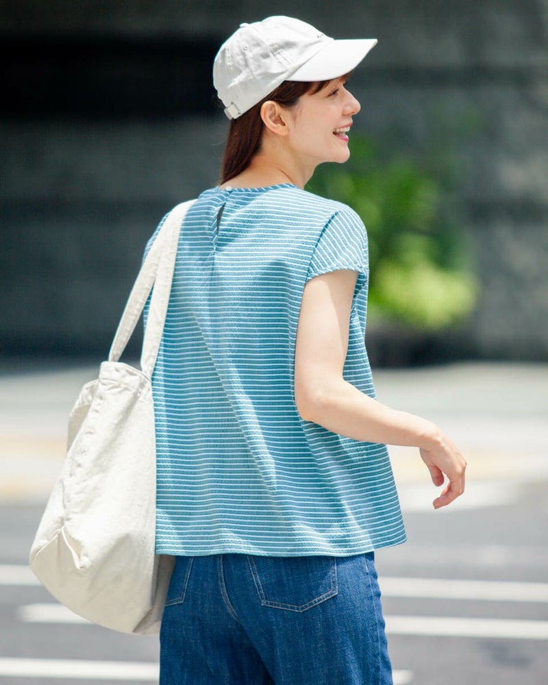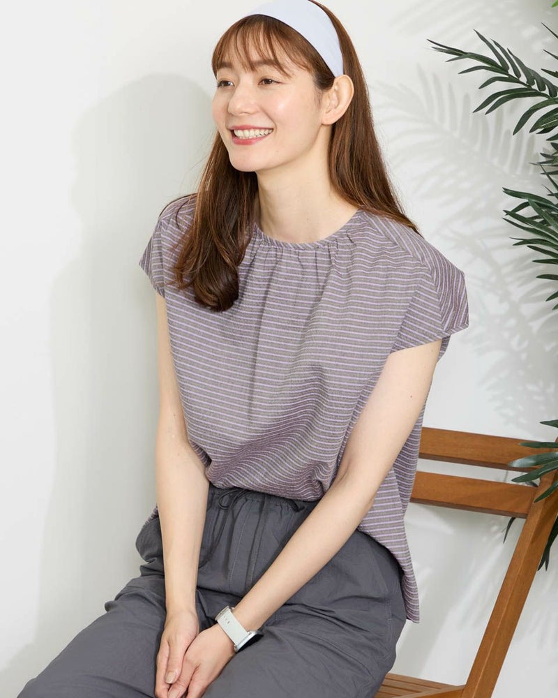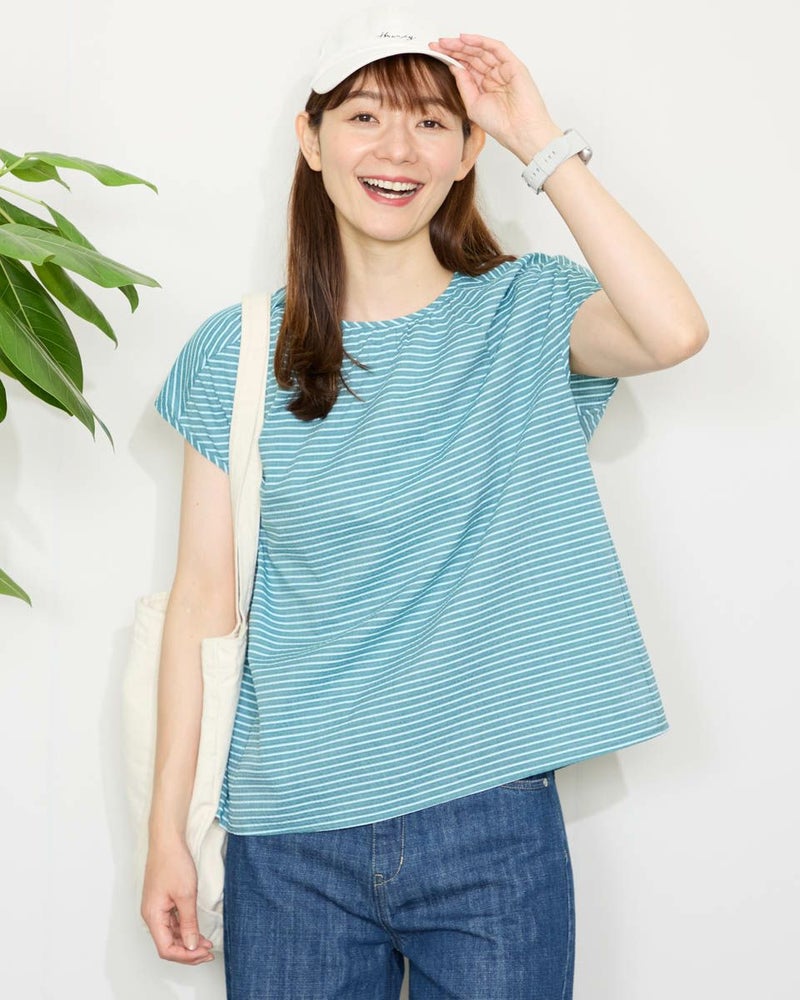 落ち着いたボーダーの配色が派手すぎずちょうどいいバランスのブラウスです。表情豊かな凹凸のある表面感が魅力です。少し立体的なシルエットで体のラインを拾わず着用できます。スタイリング次第でオンオフ問わず活躍してくれるアイテムです。 モデル身長: 171 cm 着用サイズ: M サイズ Golden Bear WOMEN ブラウス (WOMEN) 【着用アイテム】467QA601 カーディガン 467QA711 セミワイドパンツ 468QB751 ベイカー風イージーパンツ