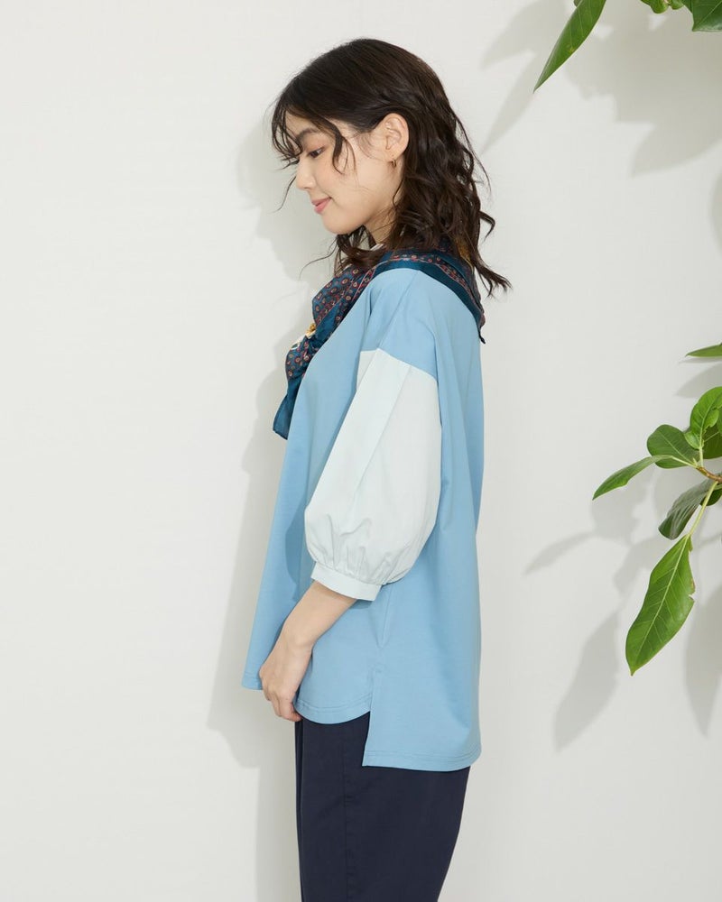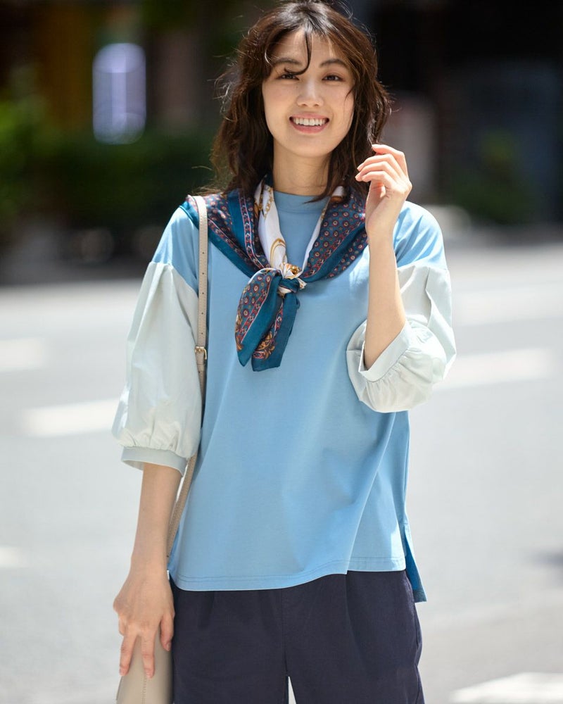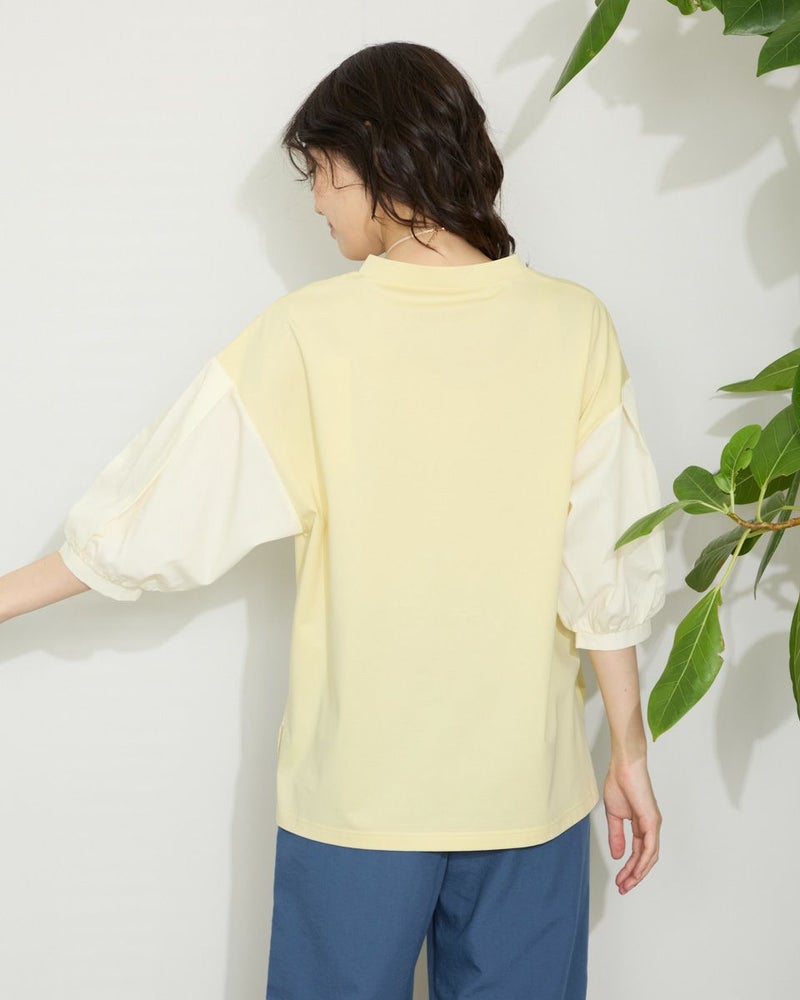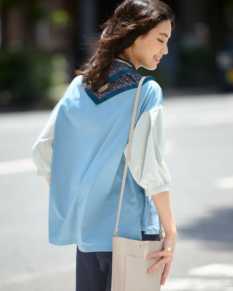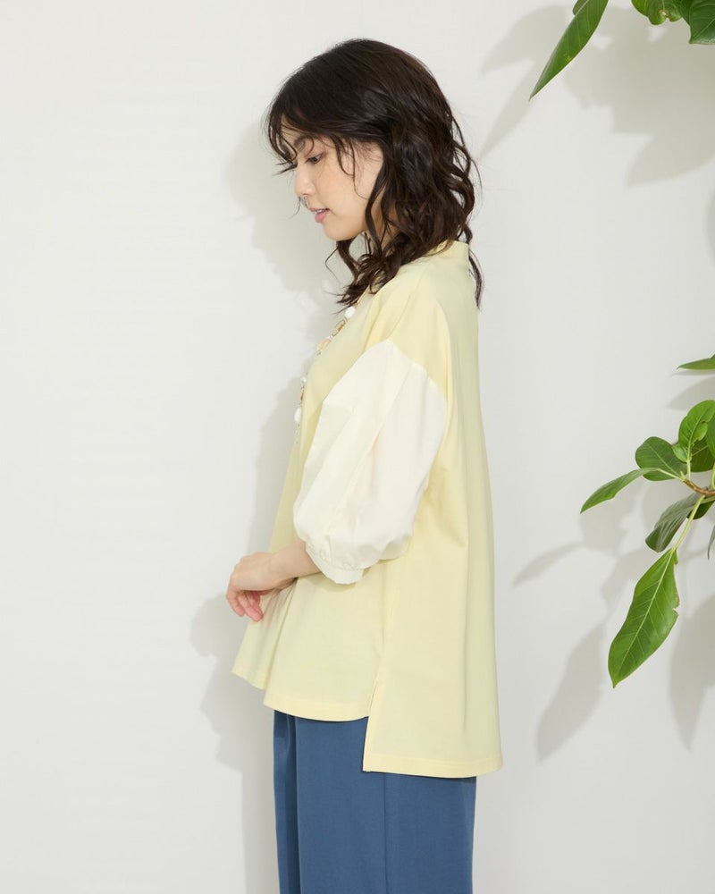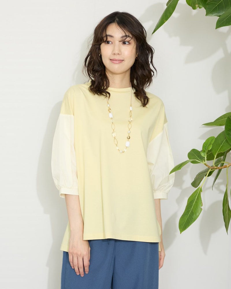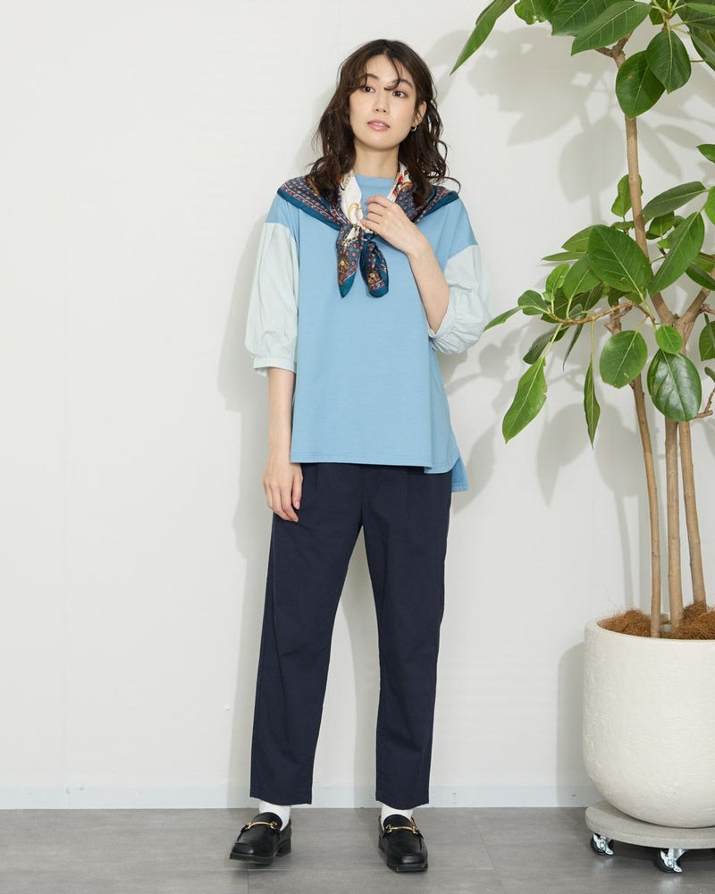 表面がきれいなタッチのプレーティング天竺にナチュラルな雰囲気の布帛素材を切り替えたデザイントップス。 少し立ち襟にして襟元があまり開かないようにしました。ブラウスのように着用できてお手入れが簡単なカットソーアイテムです。 モデル身長: 166 cm 着用サイズ: M サイズ Golden Bear WOMEN カットソー (WOMEN) 【着用アイテム】467QA710 クロプトテーパードパンツ 467QA711 セミワイドパンツ