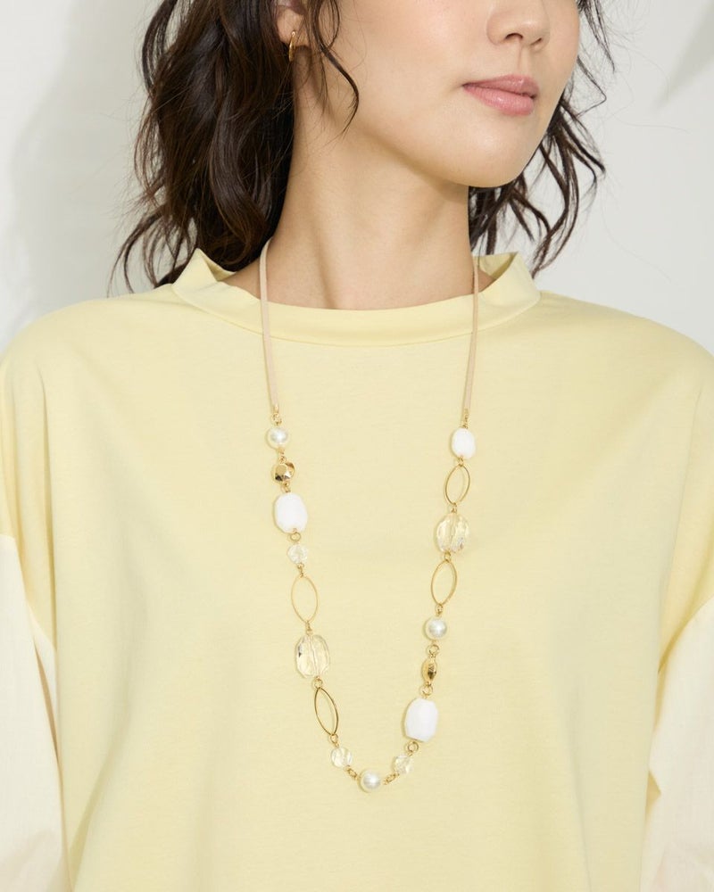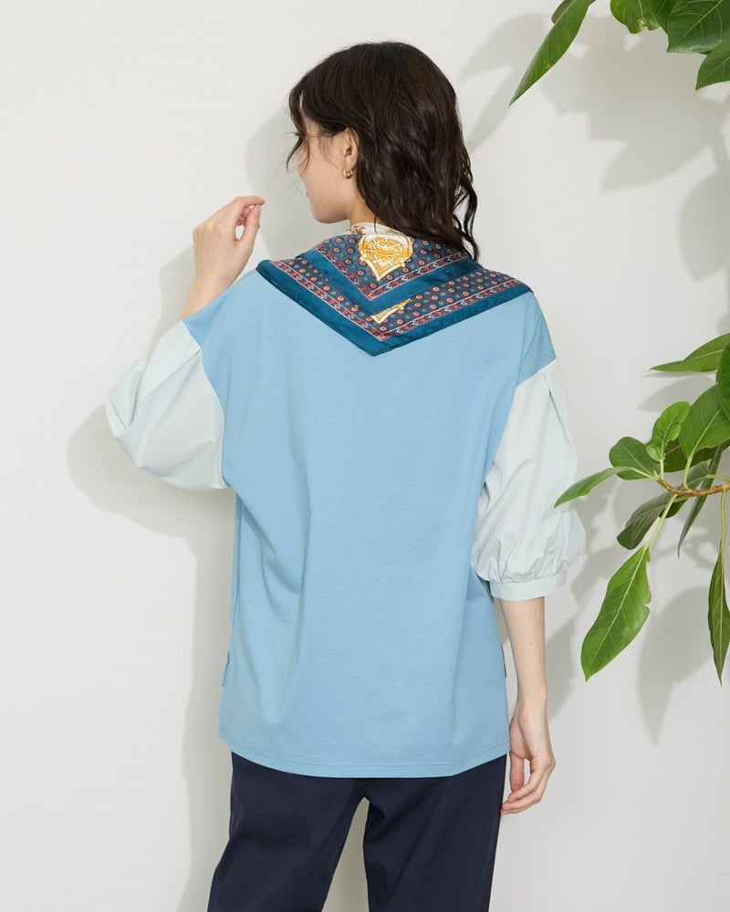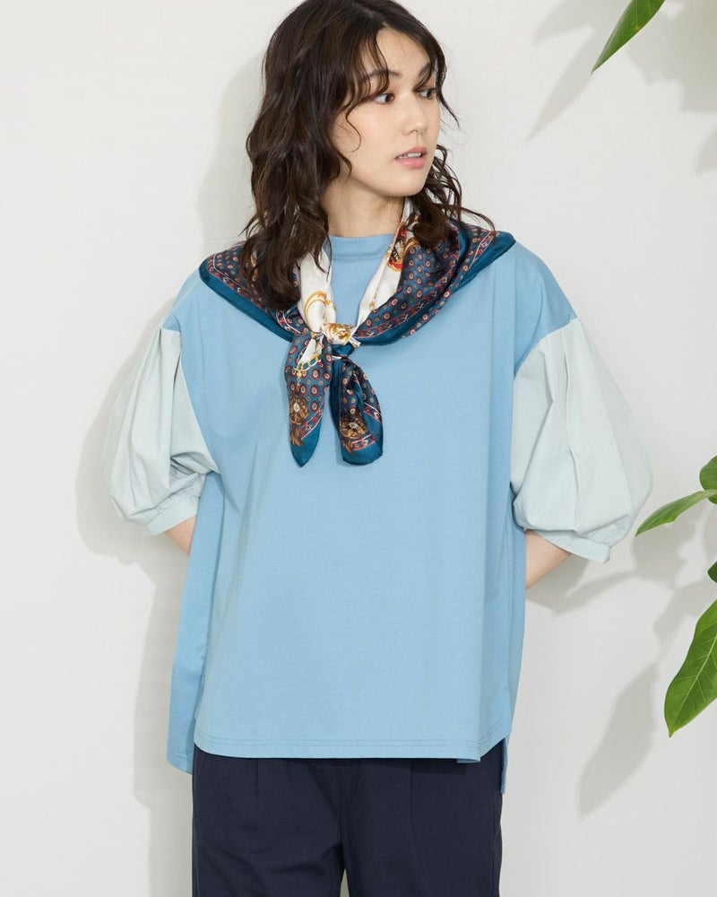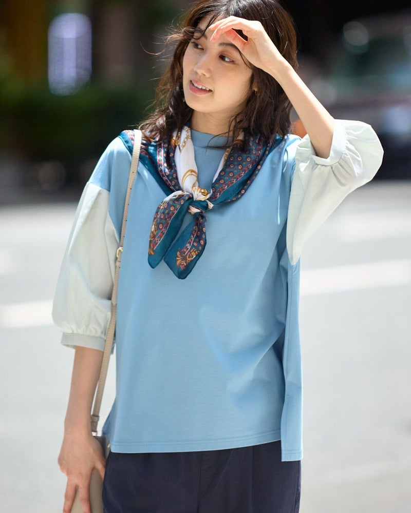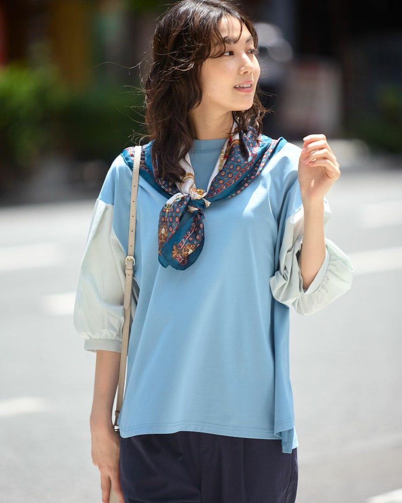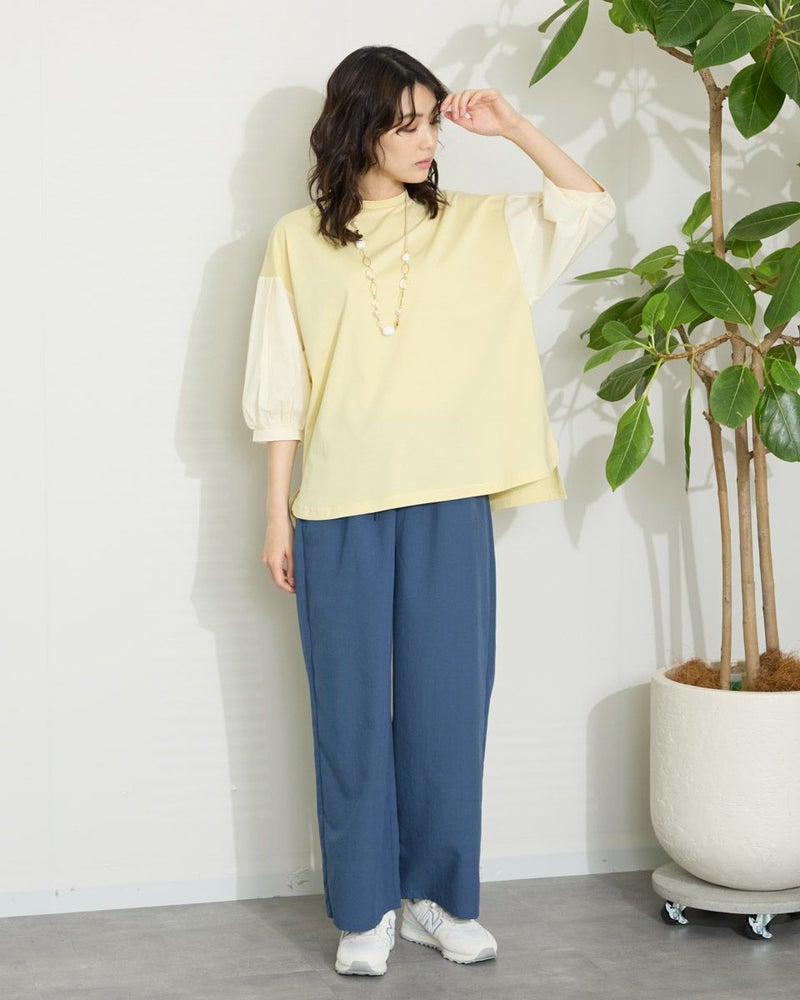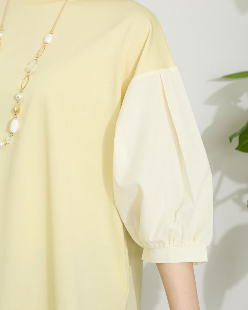 表面がきれいなタッチのプレーティング天竺にナチュラルな雰囲気の布帛素材を切り替えたデザイントップス。 少し立ち襟にして襟元があまり開かないようにしました。ブラウスのように着用できてお手入れが簡単なカットソーアイテムです。 モデル身長: 166 cm 着用サイズ: M サイズ Golden Bear WOMEN カットソー (WOMEN) 【着用アイテム】467QA710 クロプトテーパードパンツ 467QA711 セミワイドパンツ