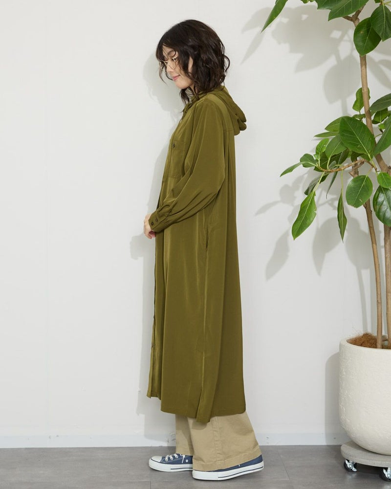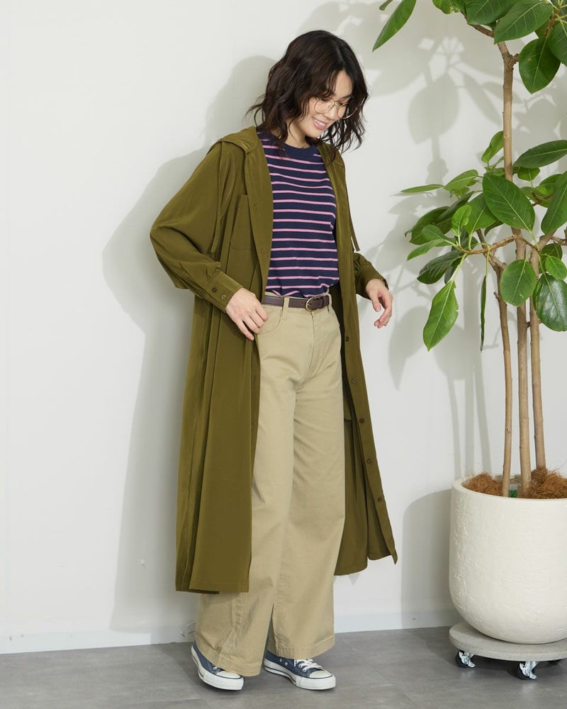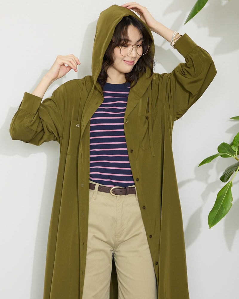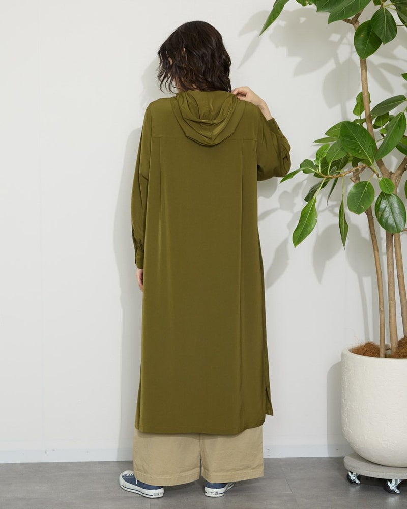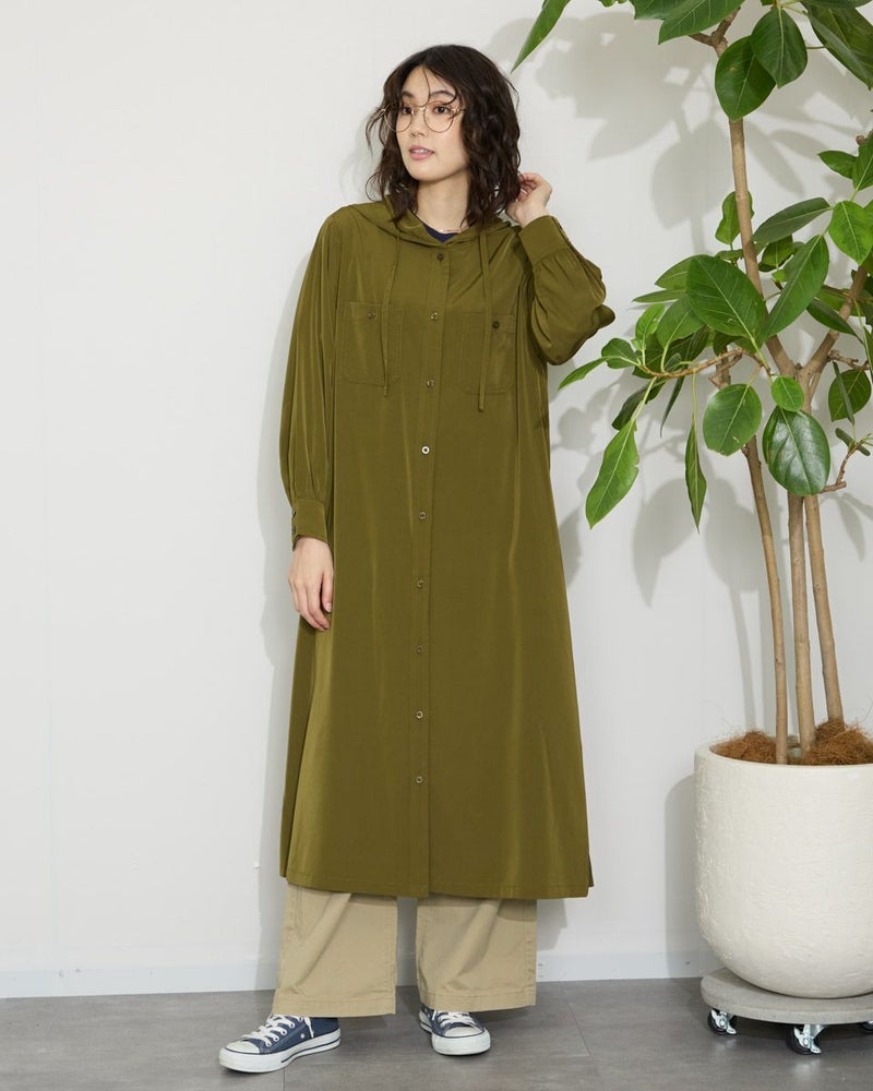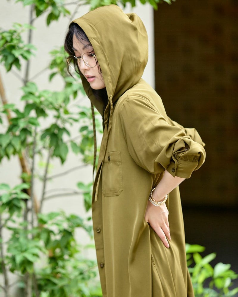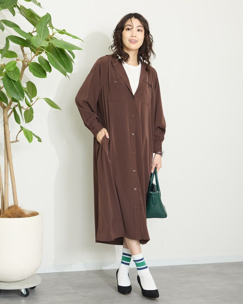 ドレープ性と微光沢のポリエステル素材のフードワンピース。1枚で着ても羽織としてTシャツに重ねるのもおすすめです。両胸ポケットがアクセントで落ち着いたアースカラーです。 モデル身長: 166 cm 着用サイズ: M サイズ Golden Bear WOMEN ブラウス (WOMEN) 【着用アイテム】467Q4412 ボーダータンクトップ 467QA405 リブ使いボーダーTシャツ 467Q6712 フレアパンツ